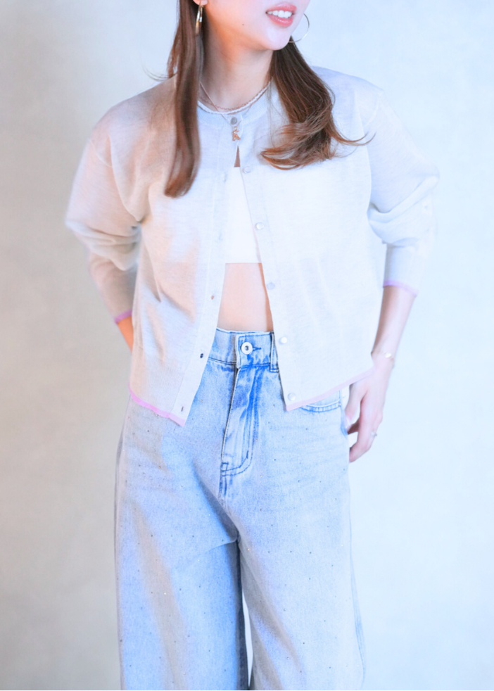 [SET]バイカラーシアーニットカーデ+ラインストーンストレートデニム