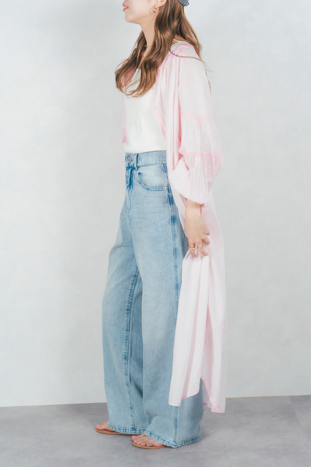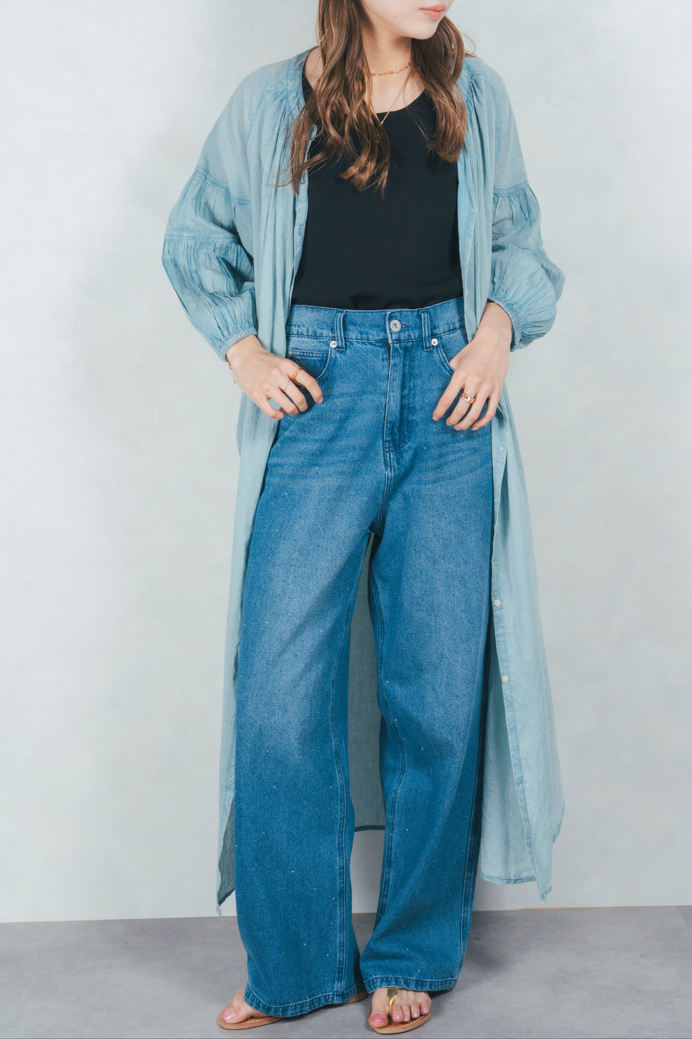 [SET]エアリーカラーシャツワンピ+ラインストーンストレートデニム(2SET)