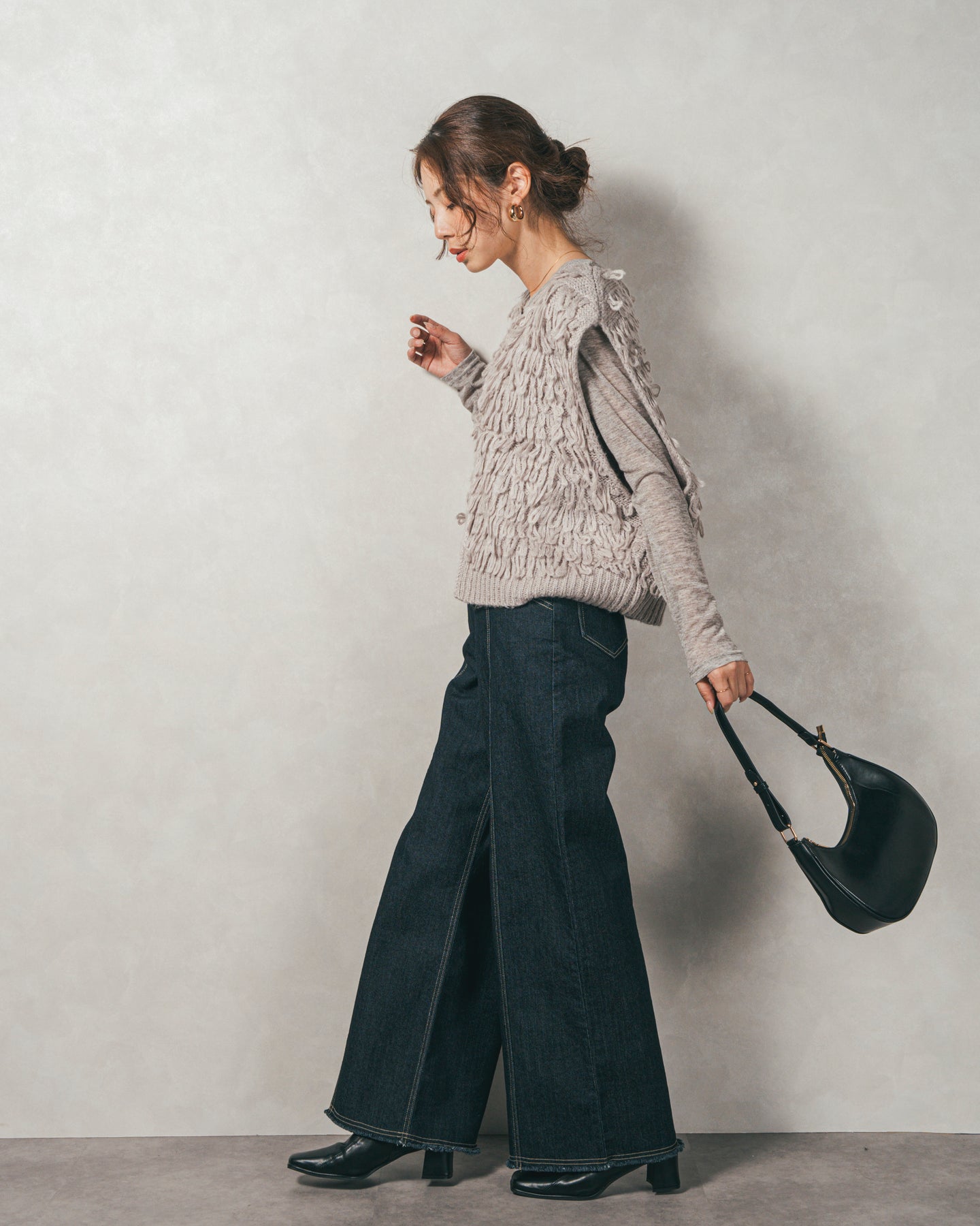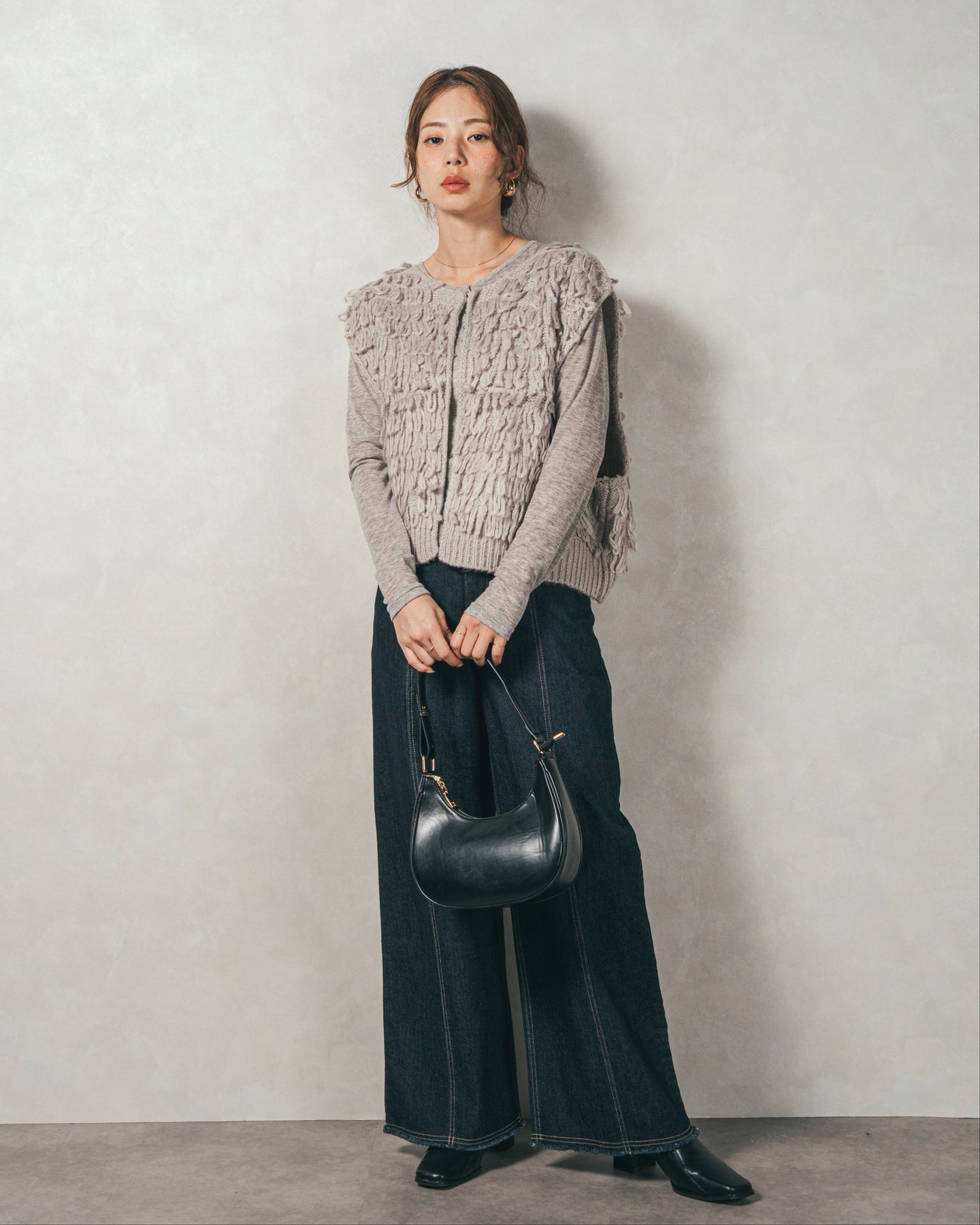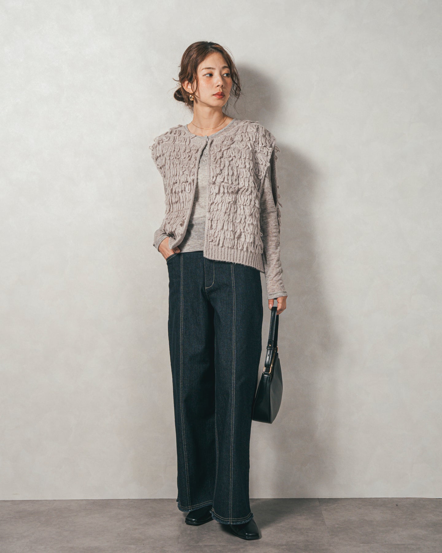 [SET]ループ編みフリンジニットベスト+Sheerリブヘンリーネックトップス+センターシーム リラックスカラーデニム(3SET)