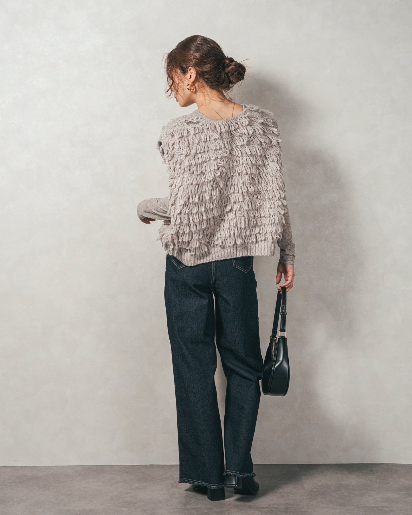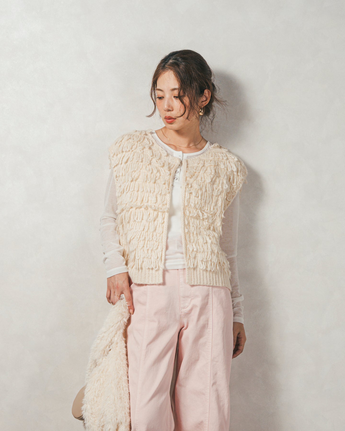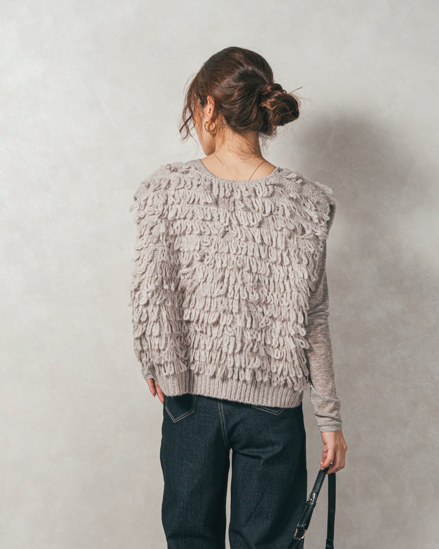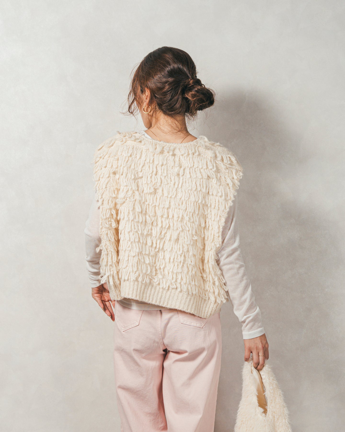 【Fabric】 くるくるとしたループ状の糸で編んだフリンジ素材。 ふんわりとしたボリュームがありつつも、ニットの重さを感じさせない軽やかな仕上がり。