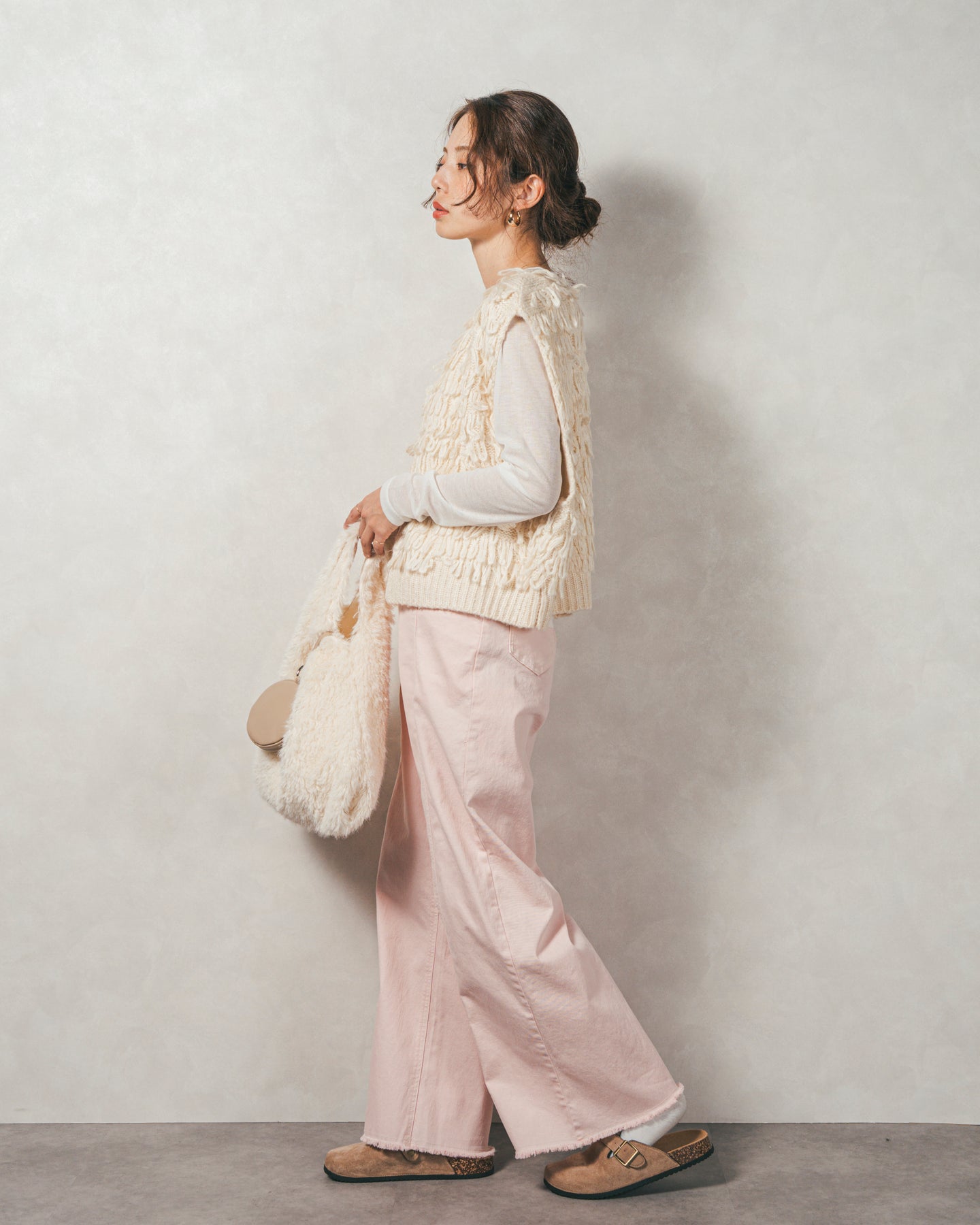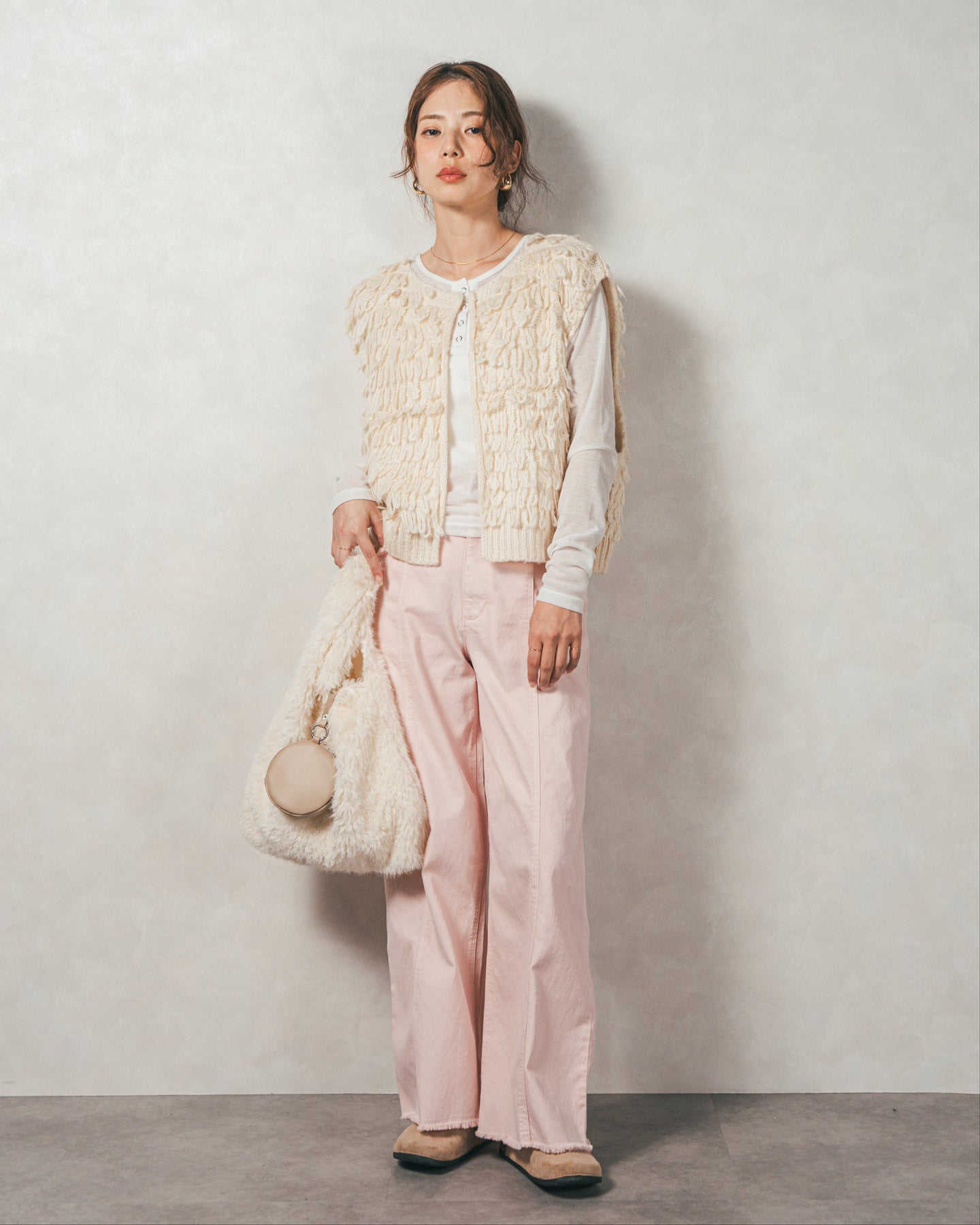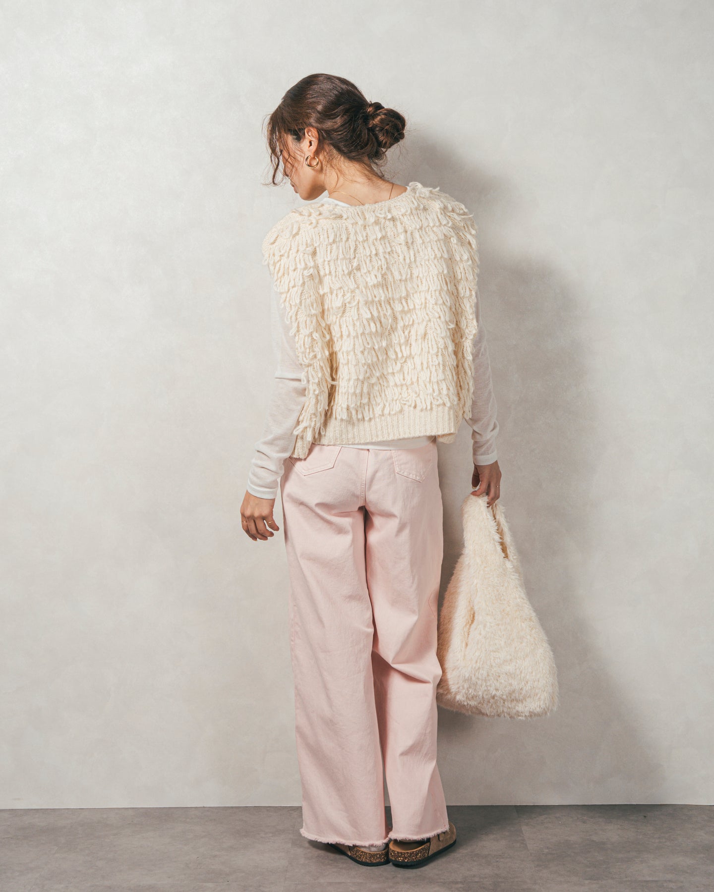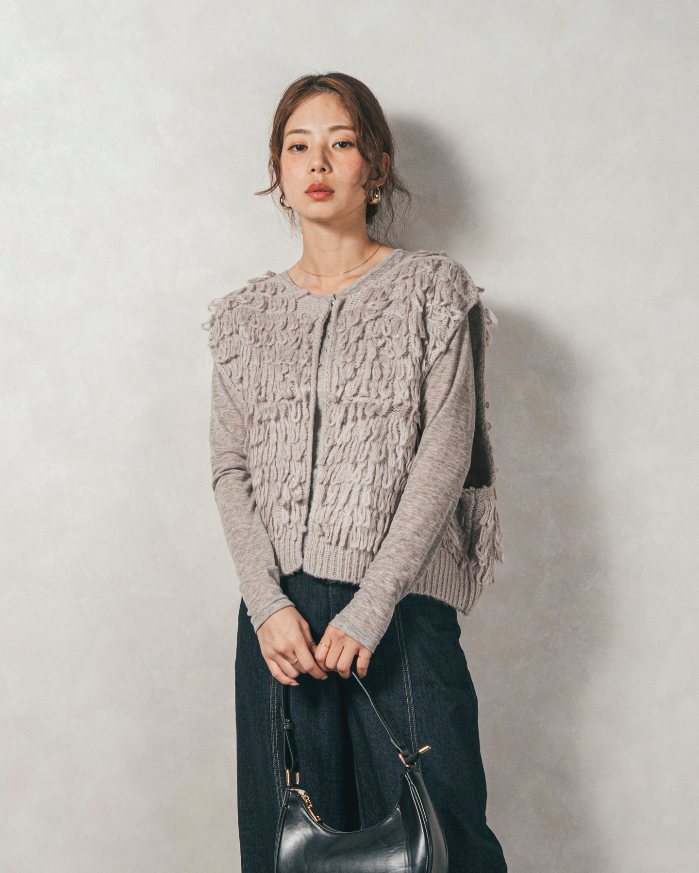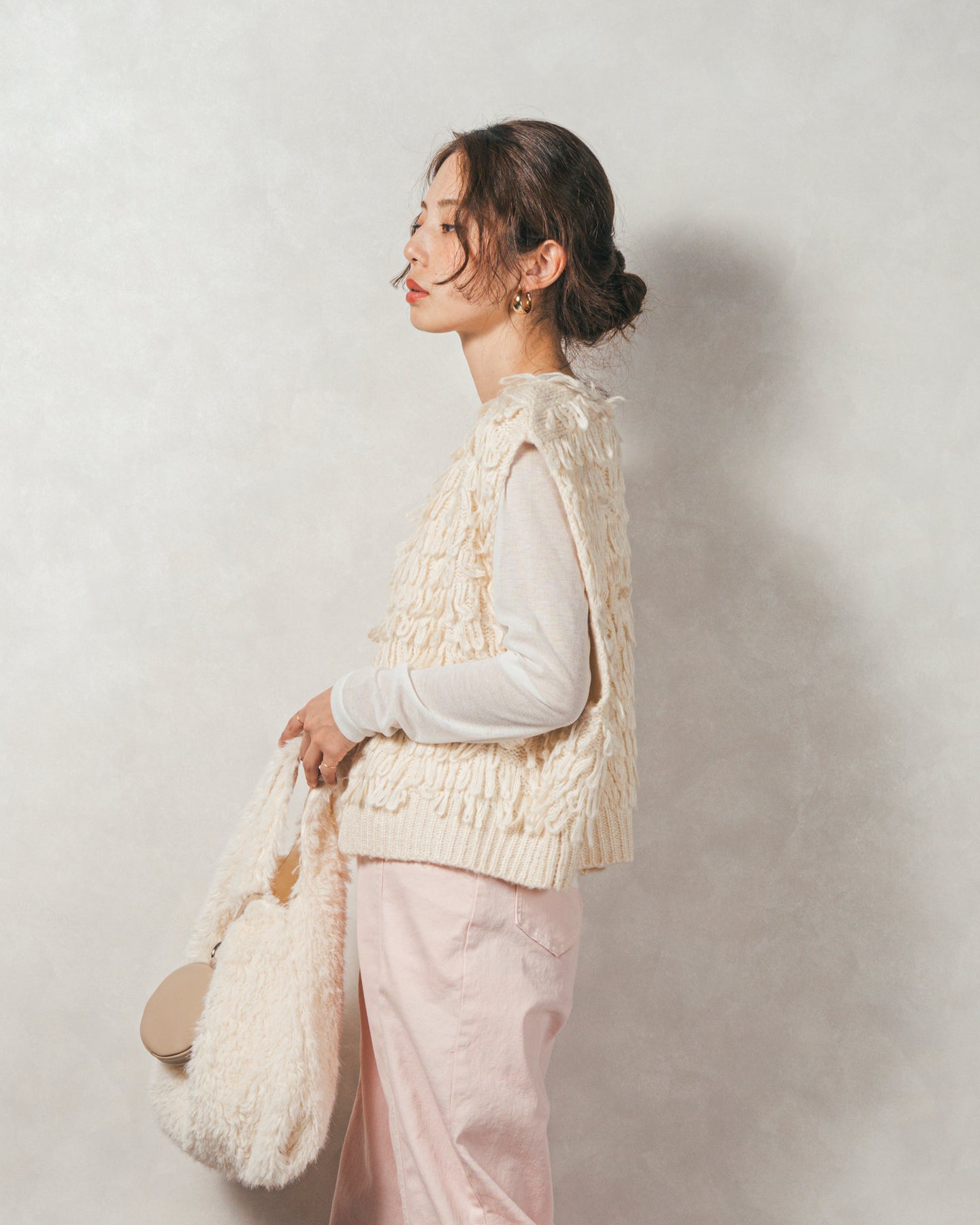 【Fabric】 くるくるとしたループ状の糸で編んだフリンジ素材。 ふんわりとしたボリュームがありつつも、ニットの重さを感じさせない軽やかな仕上がり。