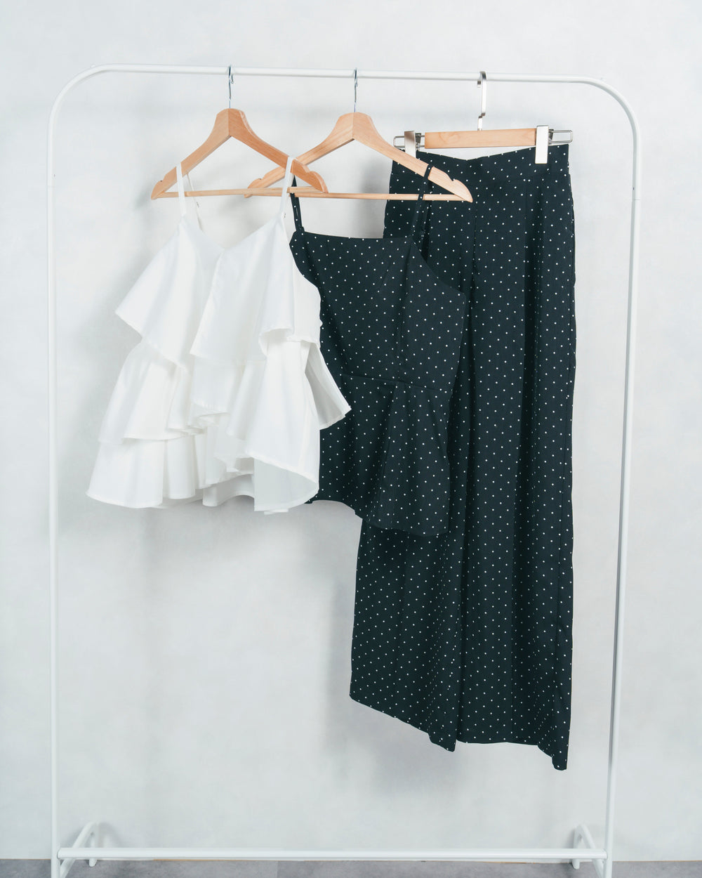 ・フリルウェーブキャミトップス WHITE x ドットイージーストレートパンツ BLACK:モデル身長161㎝