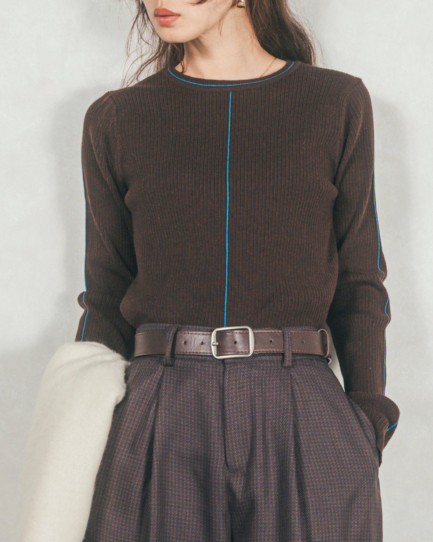 ベーシックなシルエットに、遊び心をプラスした配色ステッチがかわいいニットです。デコルテを綺麗に見せるネックラインと、程よいフィット感で、一枚で着てもきちんとした印象に。ジャケットやカーディガンのインナーとして、ちらりとステッチを見せるのも◎