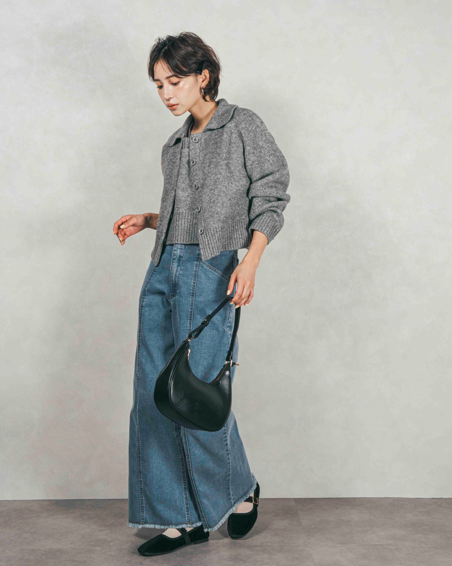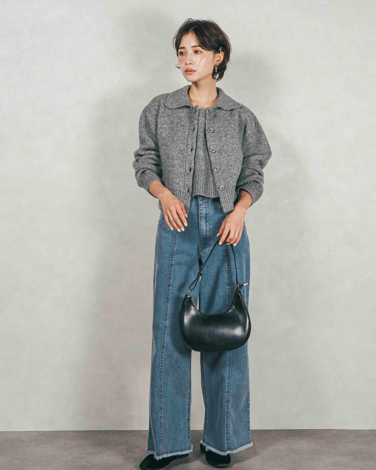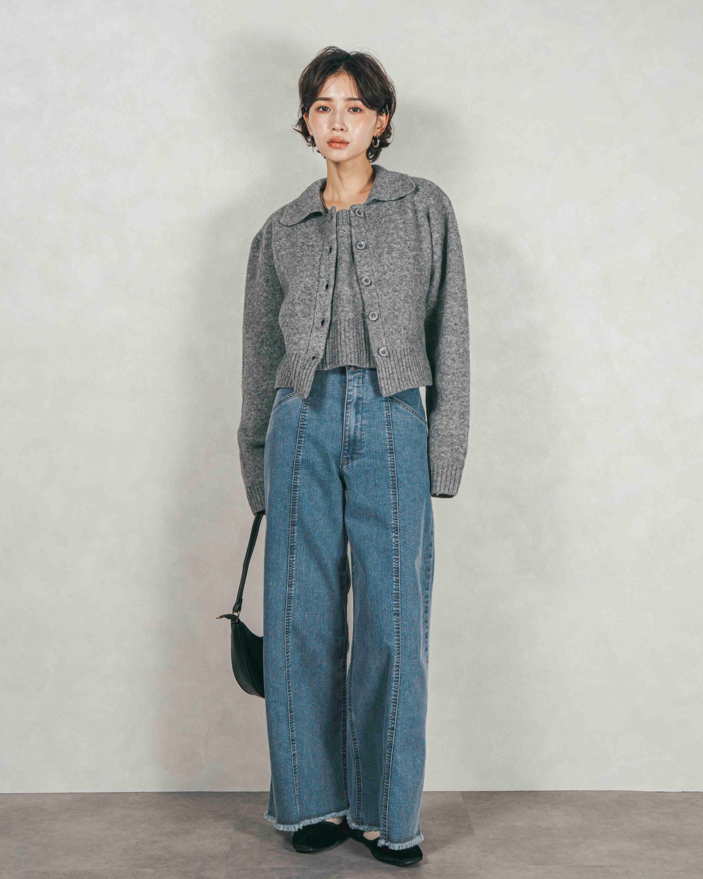 [SET]Cloudyメランジ襟付きカーディガン+Cloudyメランジクロップドベスト+センターシーム リラックスワイドデニム(3SET)