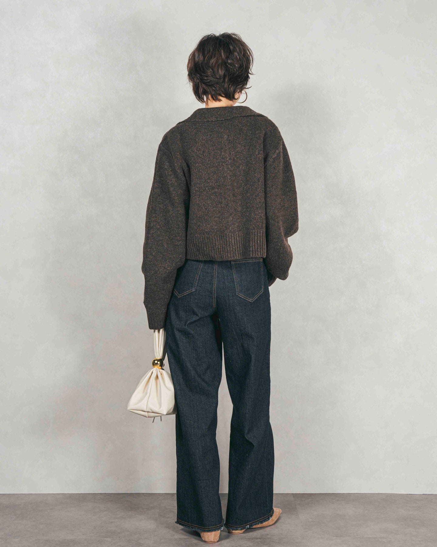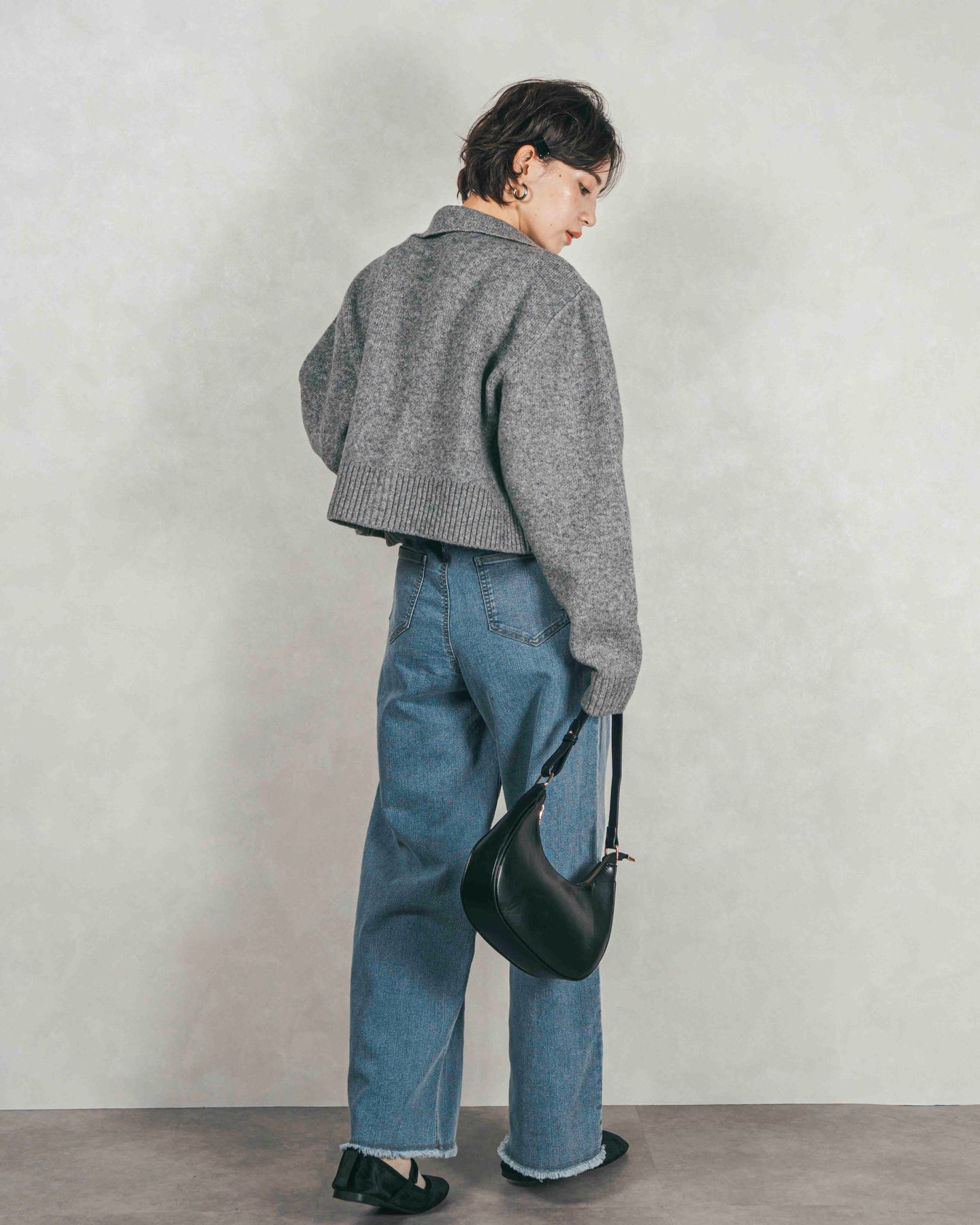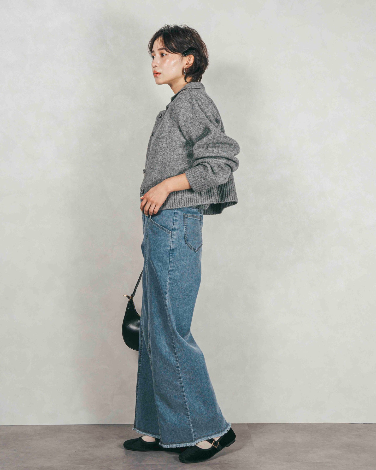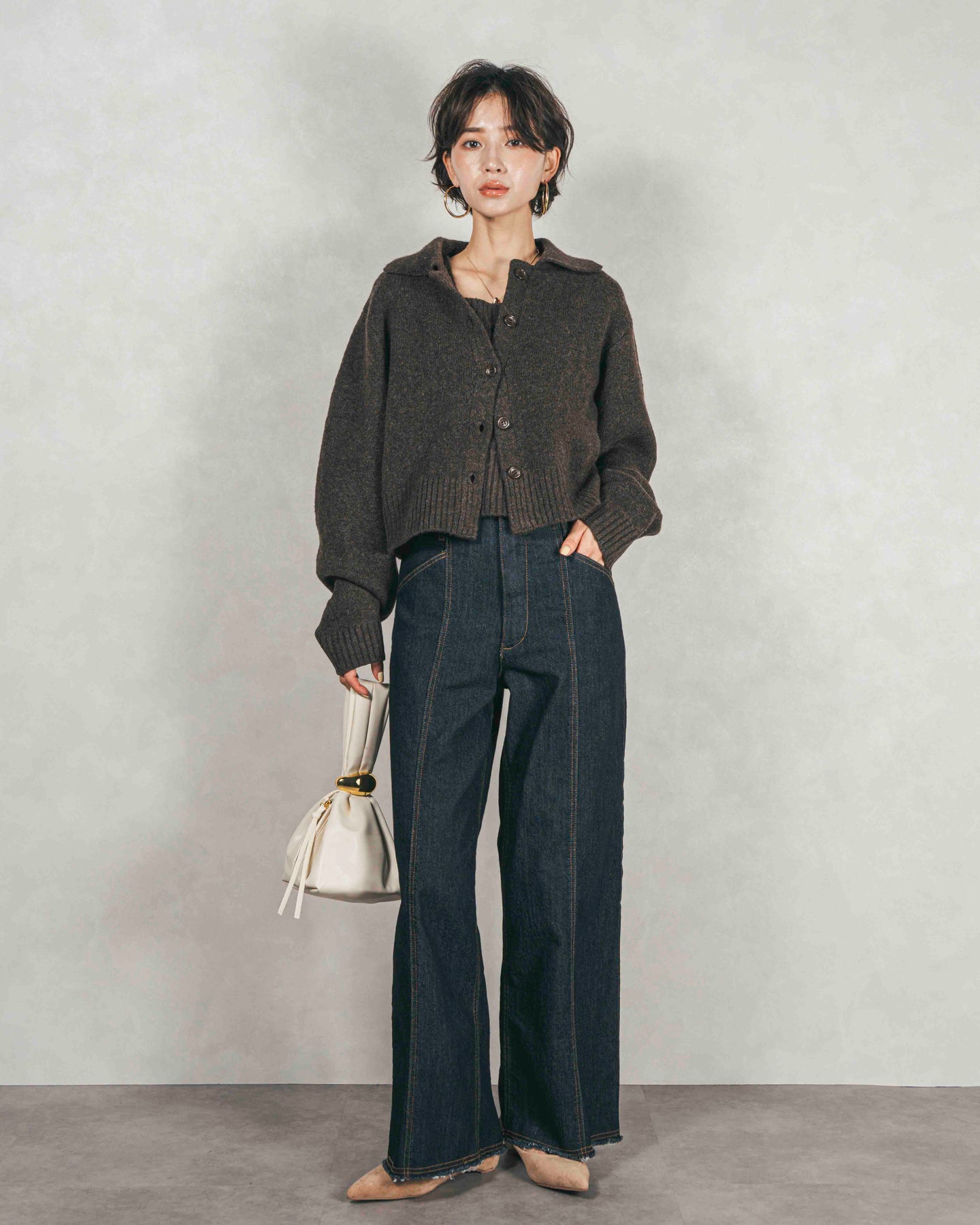 [SET]Cloudyメランジ襟付きカーディガン+Cloudyメランジクロップドベスト+センターシーム リラックスワイドデニム(3SET)