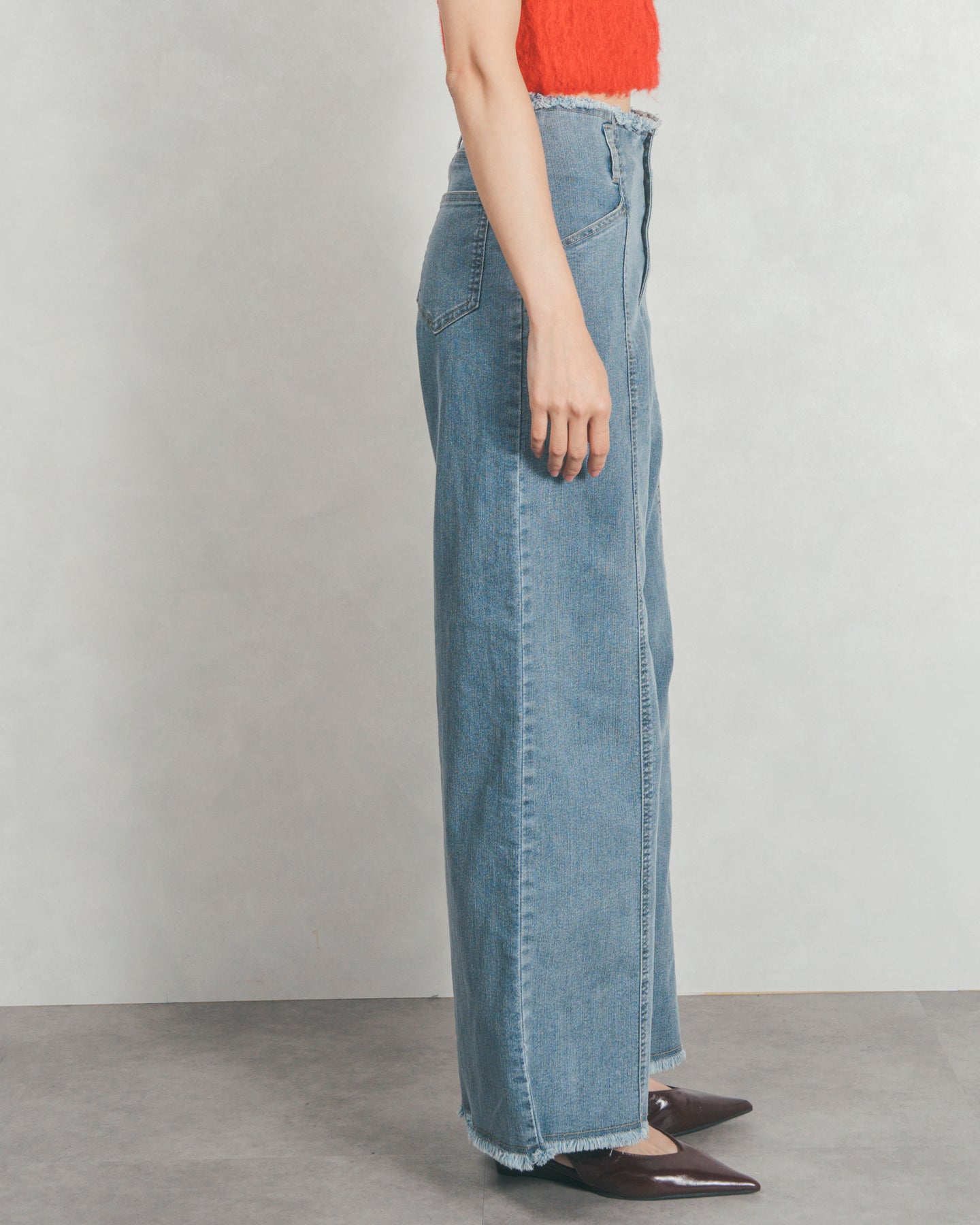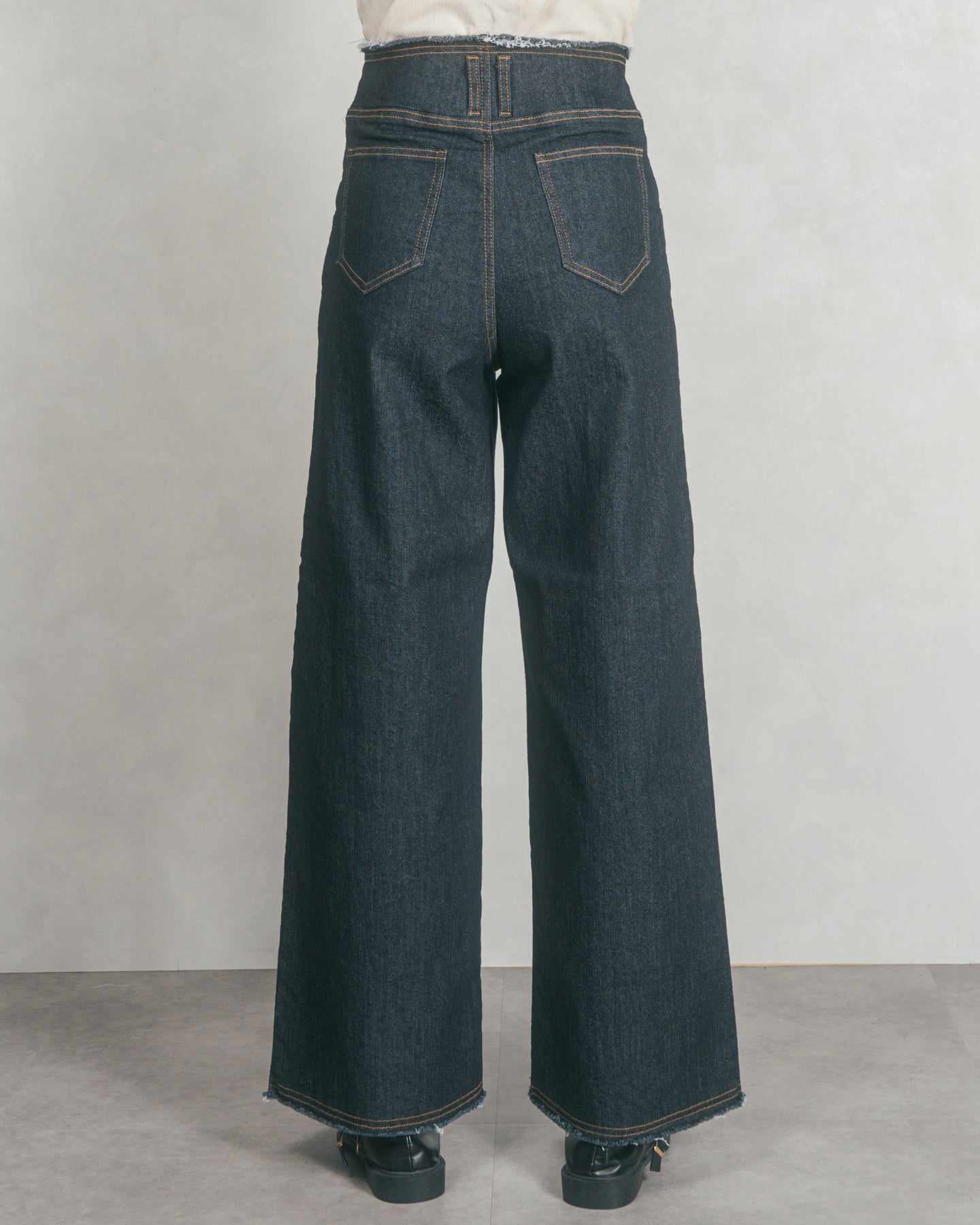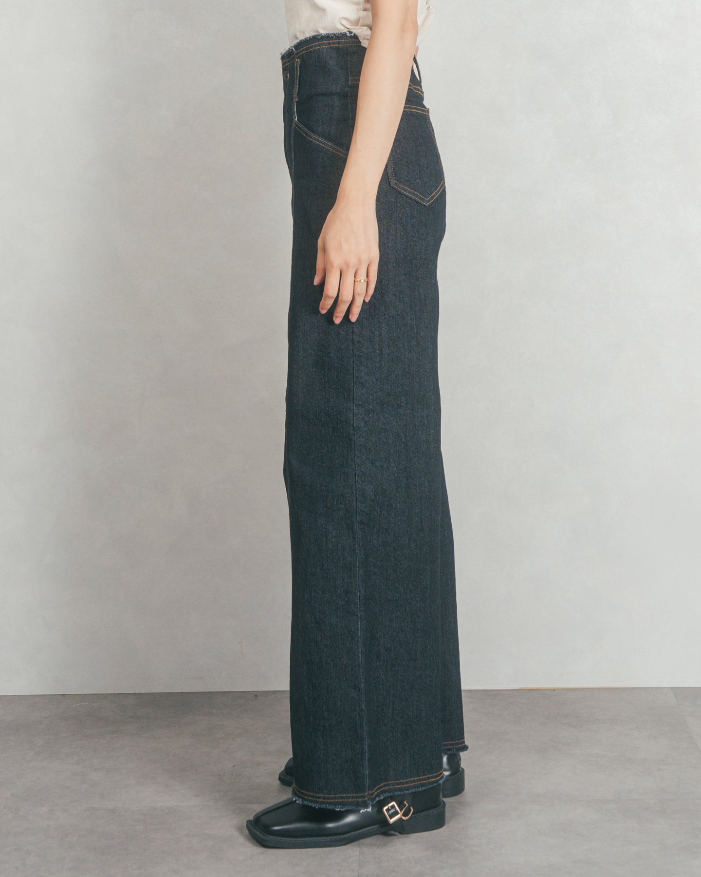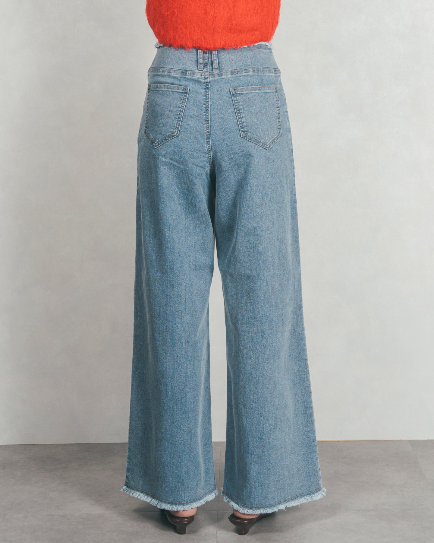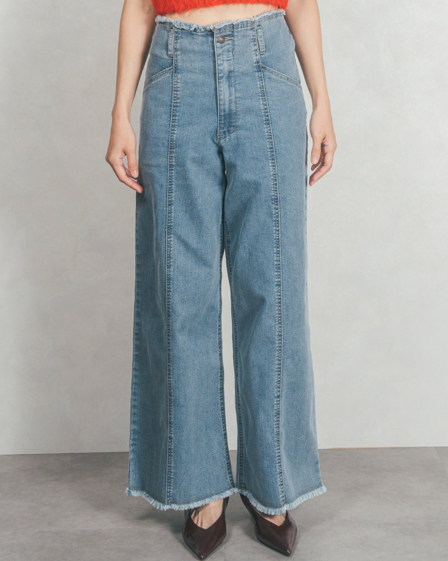 ハイウエスト+フロント中心に入ったステッチで、スタイルアップ効果◎ハイウエストのデザインは、ウエストまわりをスッキリとみせ、トレンドシルエットを作ります。カットオフで仕上げた裾とウエストは、いつものコーデにおしゃれな表情をプラスしてくれます。
