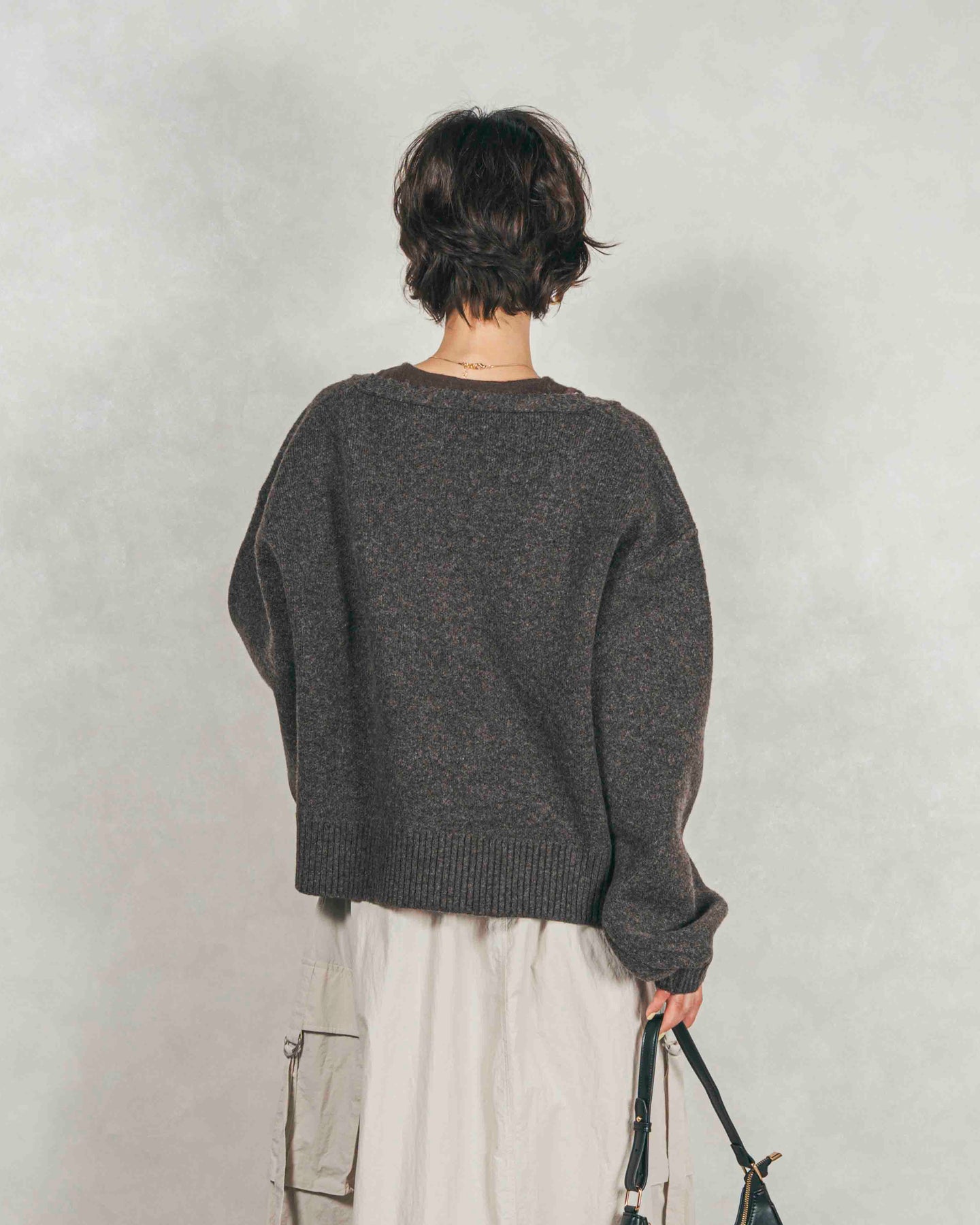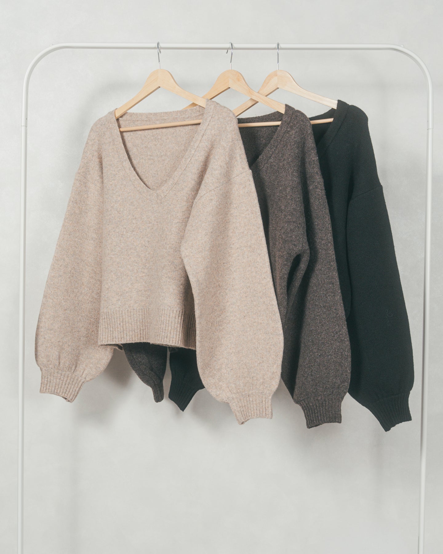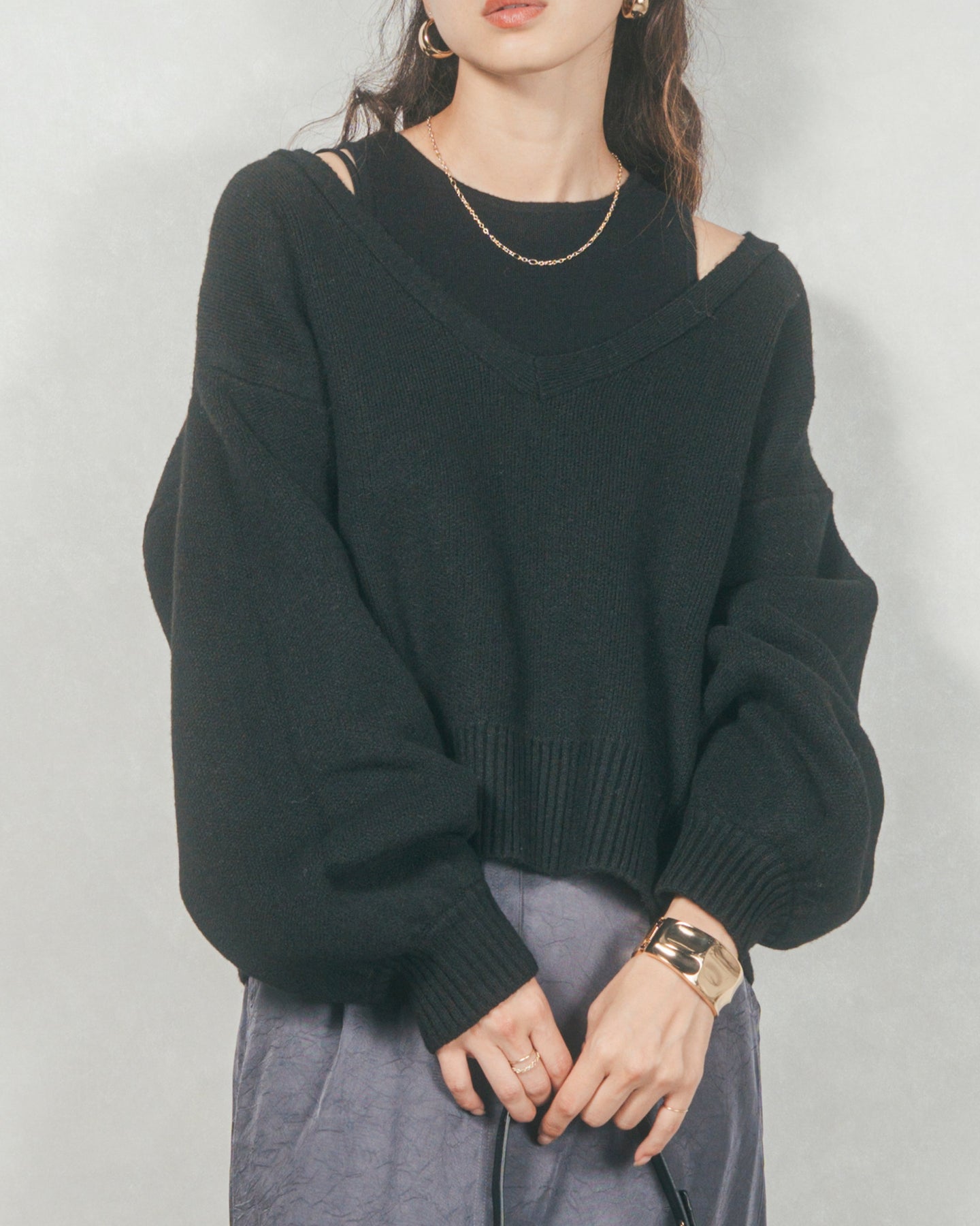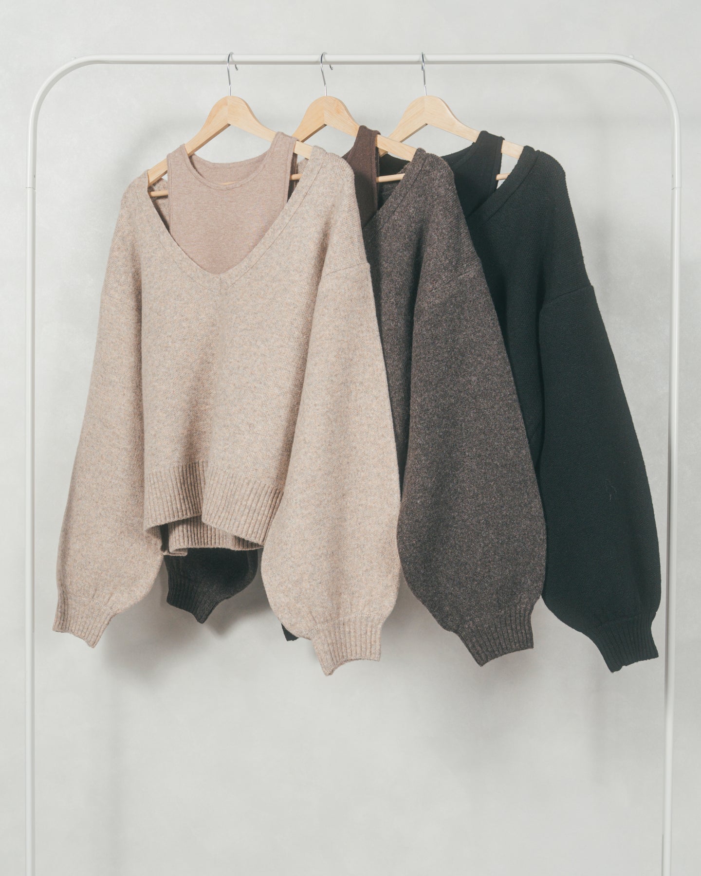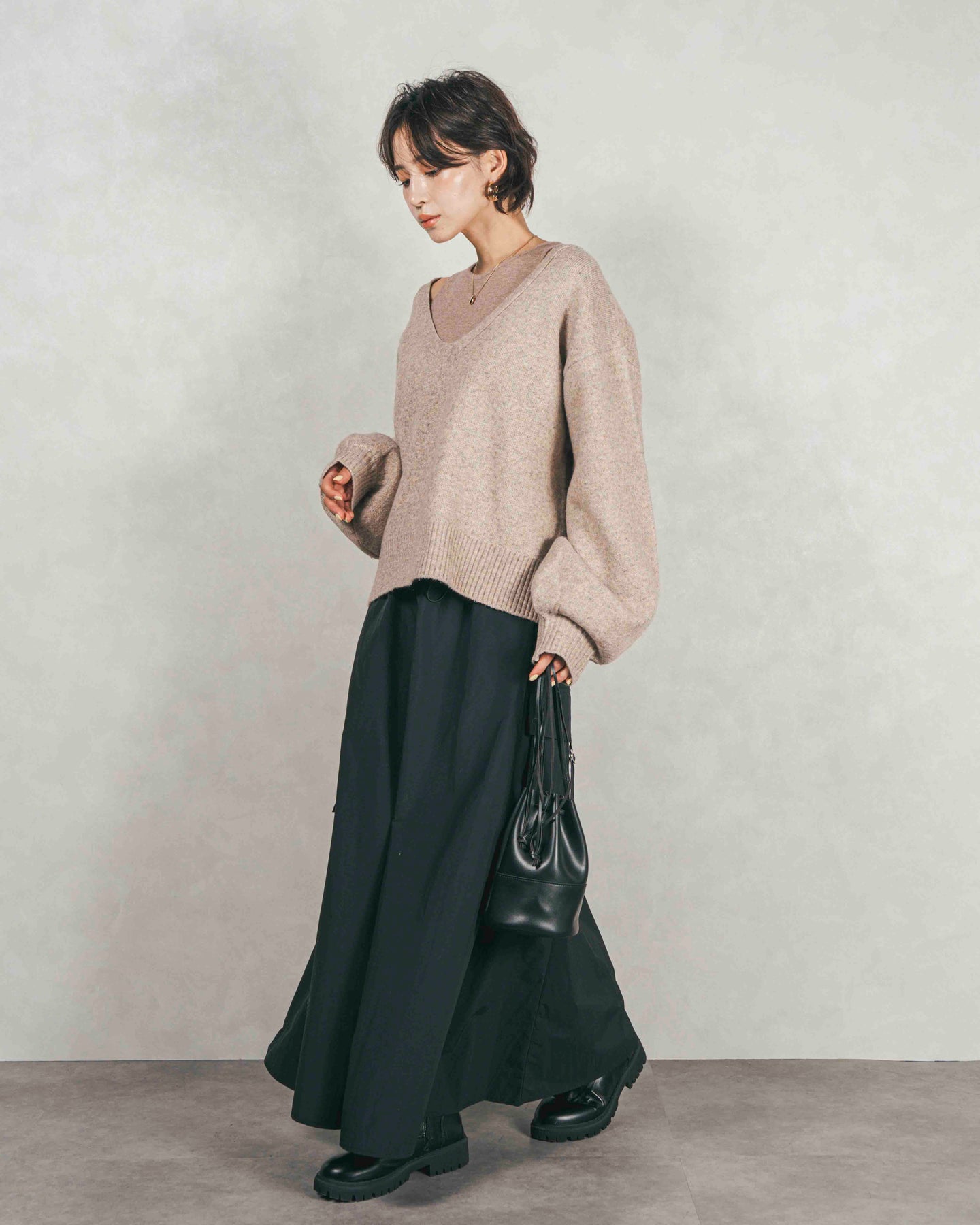 デコルテを綺麗に見せるVネックラインと、ふわっとしたボリュームスリーブが特徴。着丈はフロントが短めで、どんなボトムスともバランス良く決まります。セットのニットタンクトップとそれぞれ別で使える優秀デザイン。
