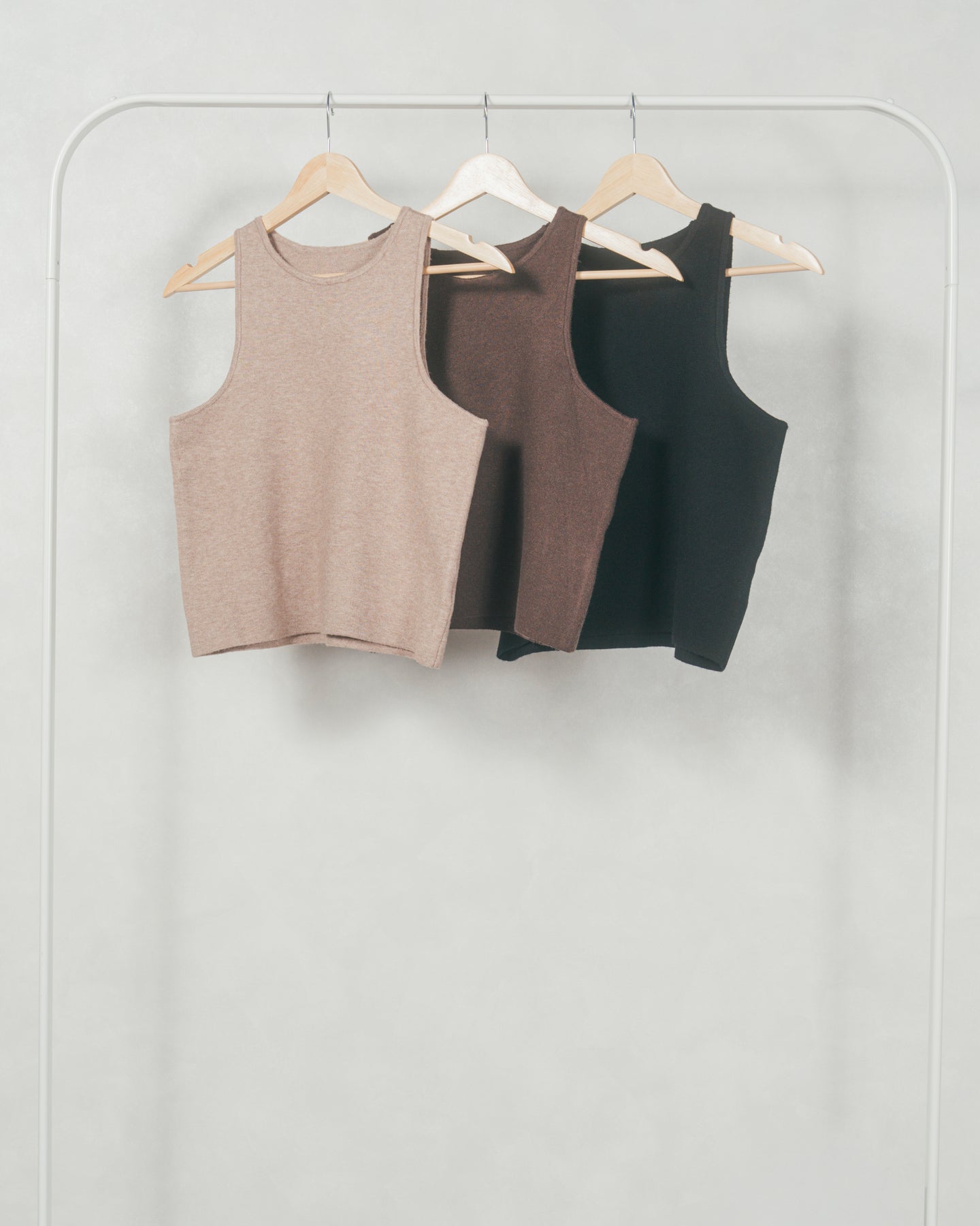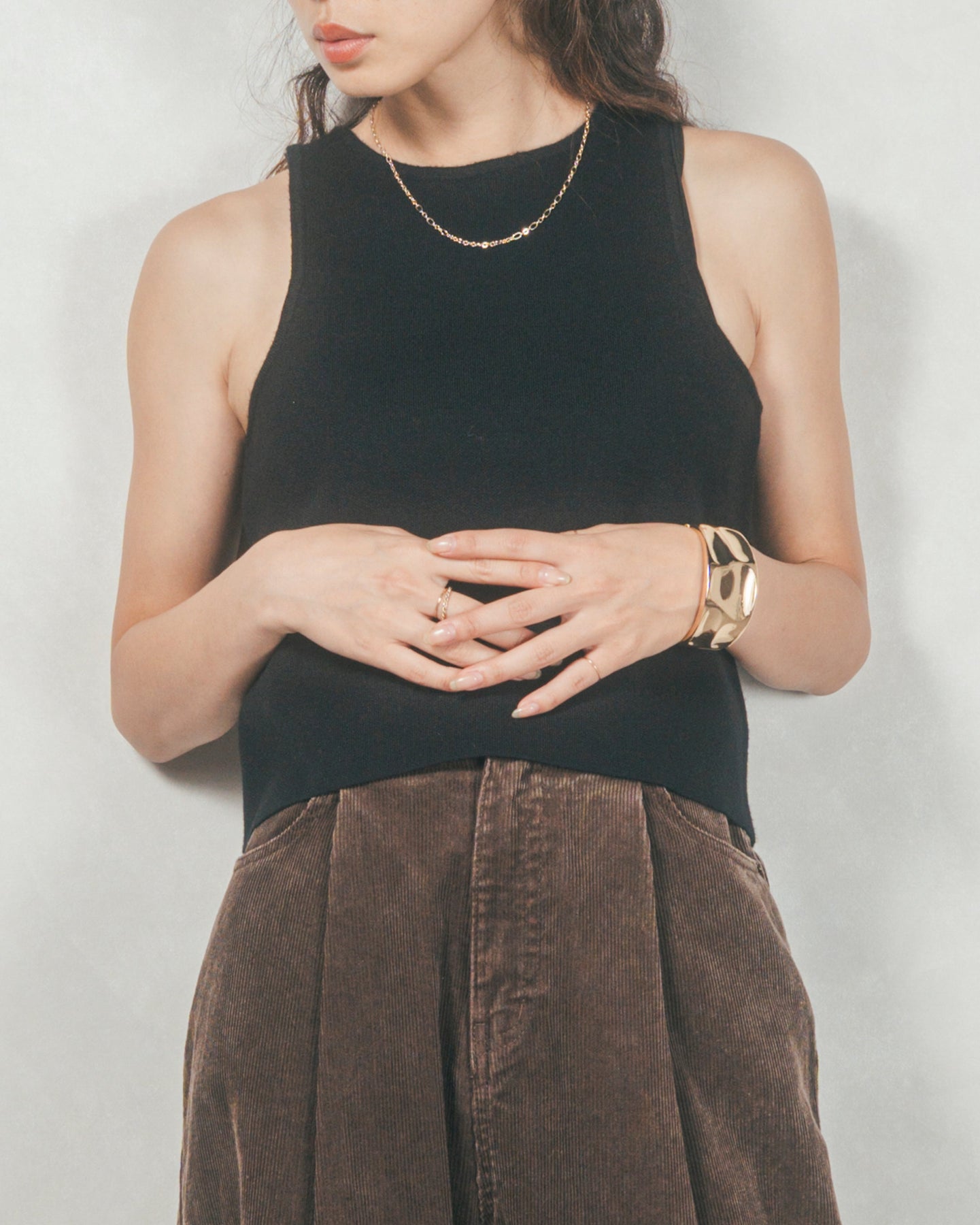 フロントが短めになっているニットは、ハイウエストのパンツやタイトスカートと合わせると、メリハリが効いた大人カジュアルに。インナーのタンクトップは、シアーブラウスと合わせて今っぽく着こなしても◎