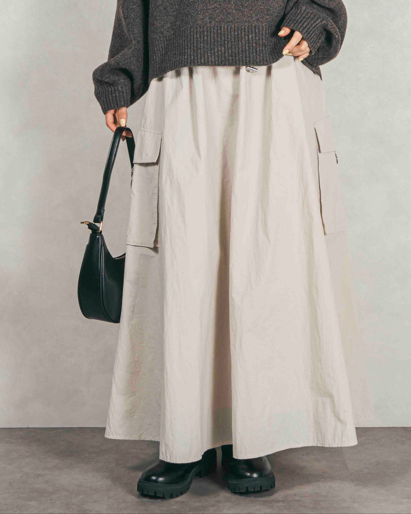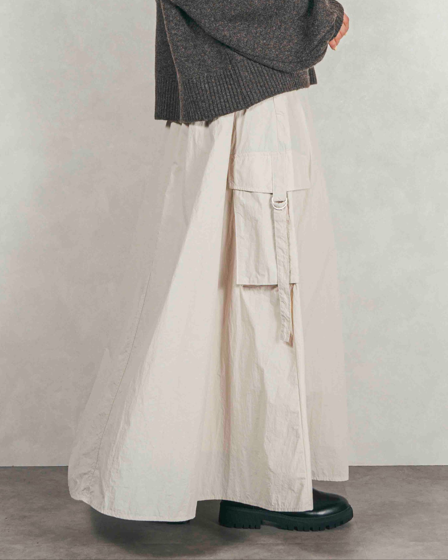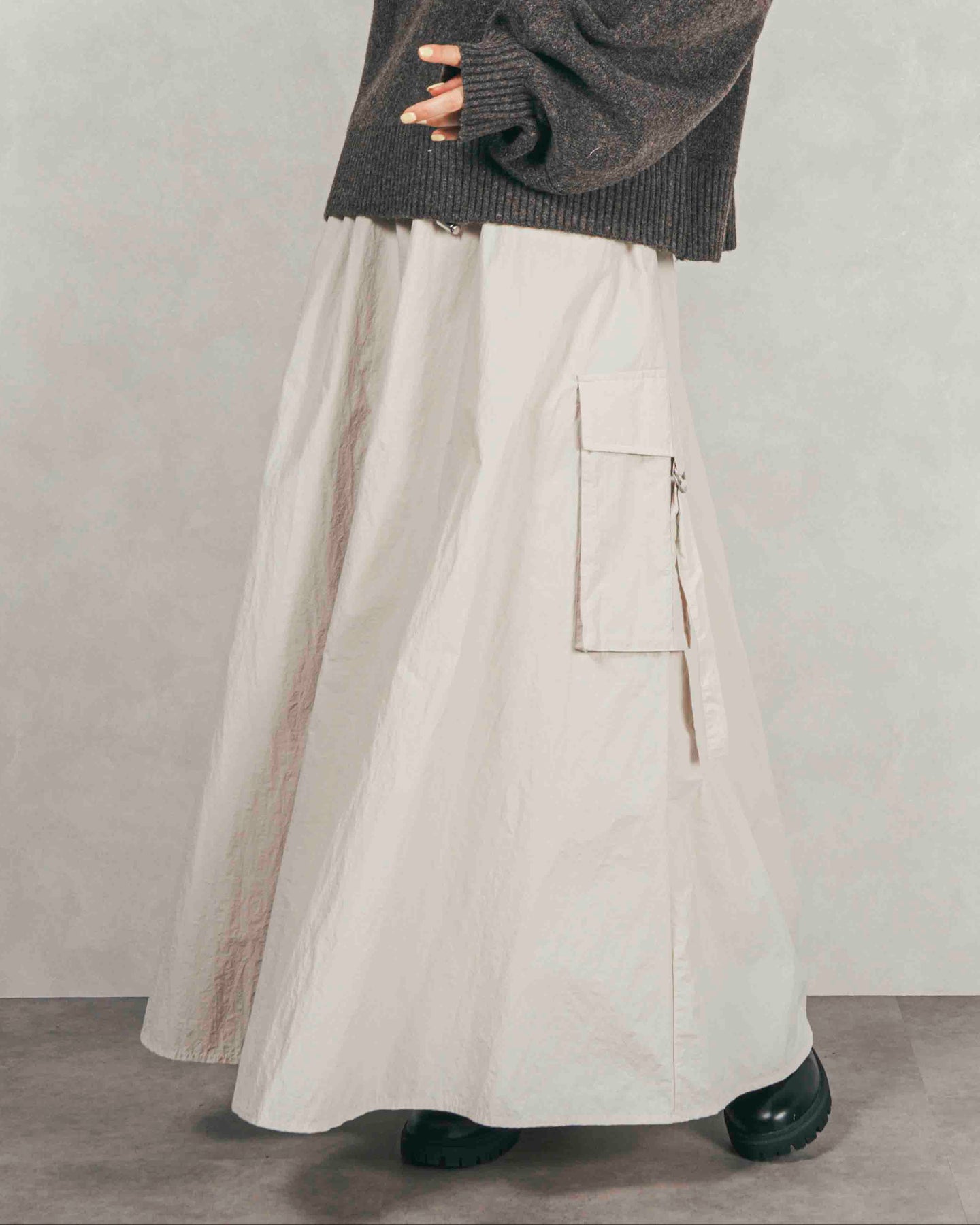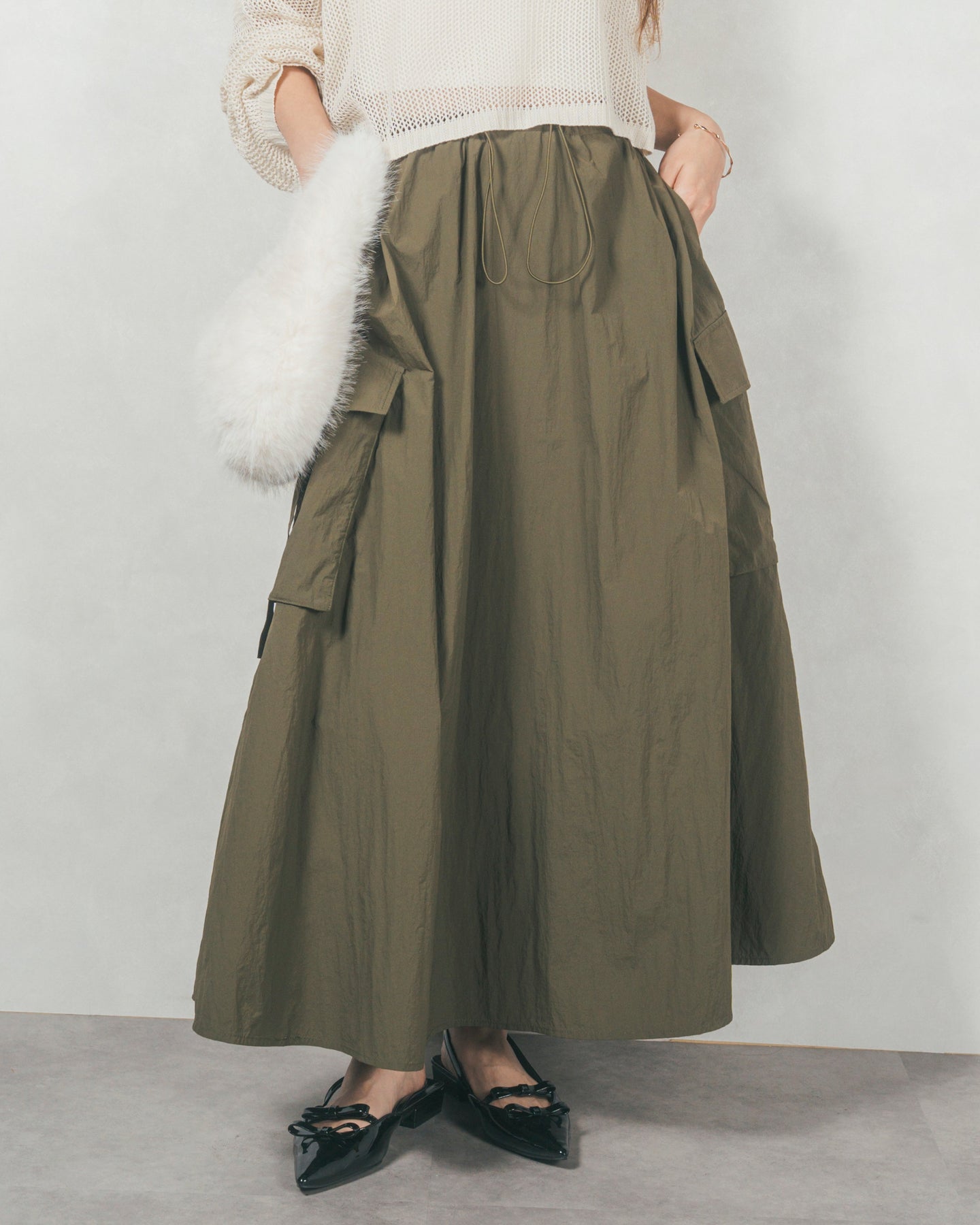 ポイントのカーゴポケットで、スカートの甘さをダウンしながらも、ウエストから裾にかけてふんわりと広がるフレアシルエットで、女性らしいムードをプラス。ウエストは総ゴムとドローストリングでサイズ調整ができ、はき心地もらくちん。