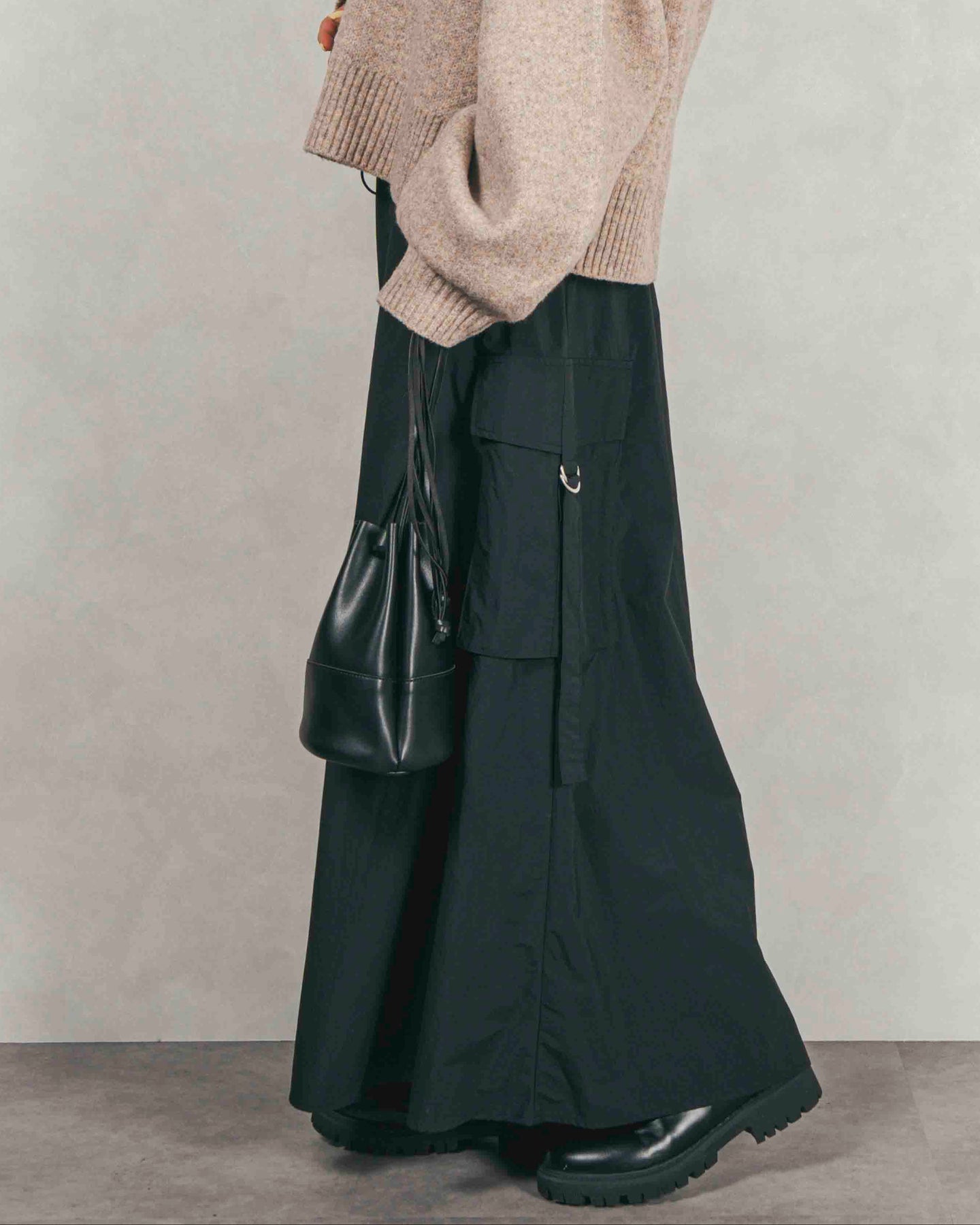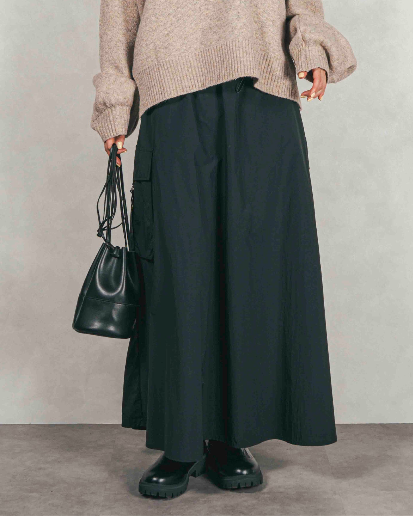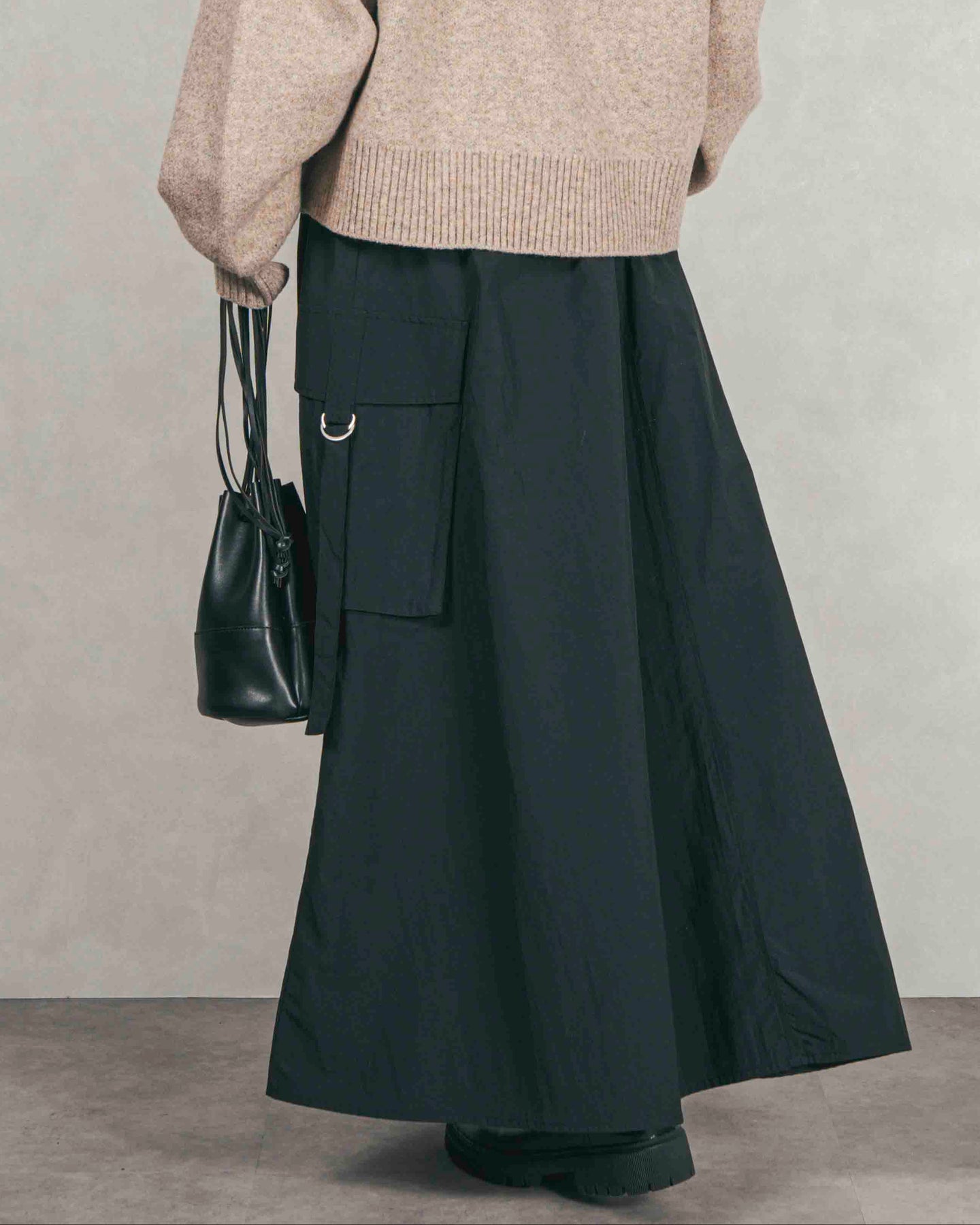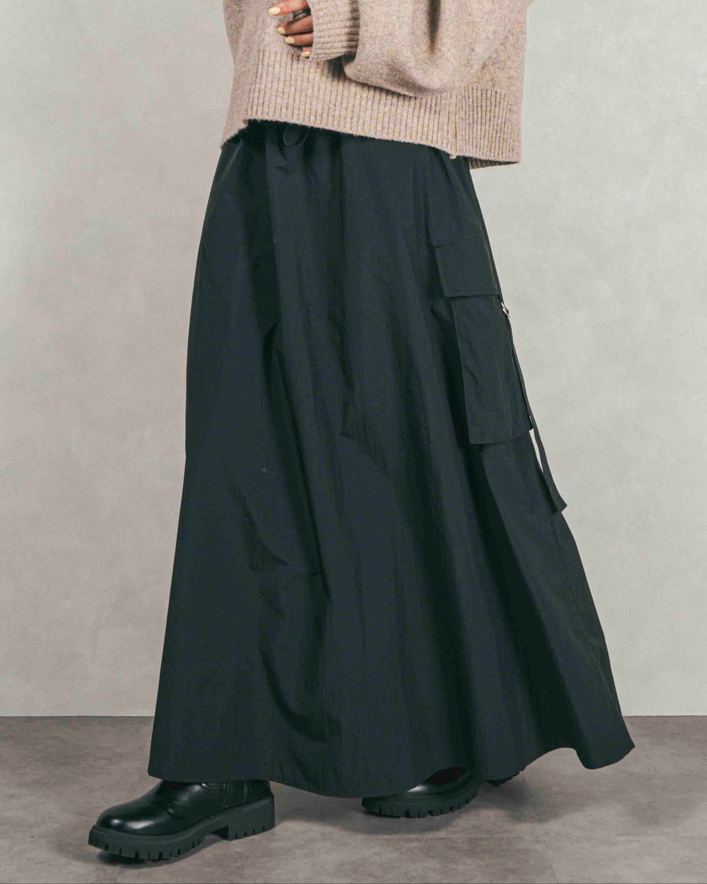 ポイントのカーゴポケットで、スカートの甘さをダウンしながらも、ウエストから裾にかけてふんわりと広がるフレアシルエットで、女性らしいムードをプラス。ウエストは総ゴムとドローストリングでサイズ調整ができ、はき心地もらくちん。