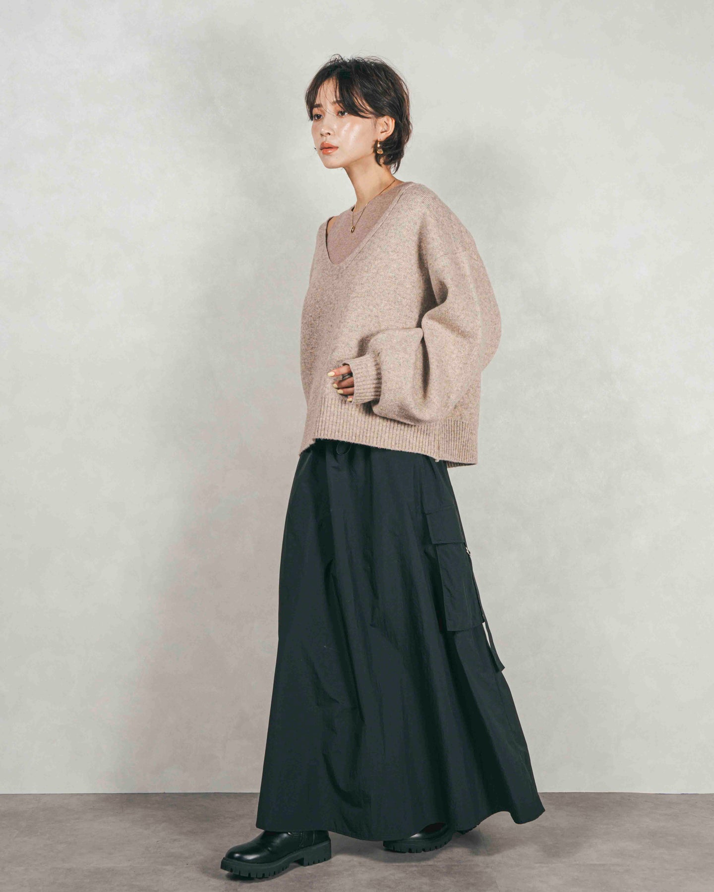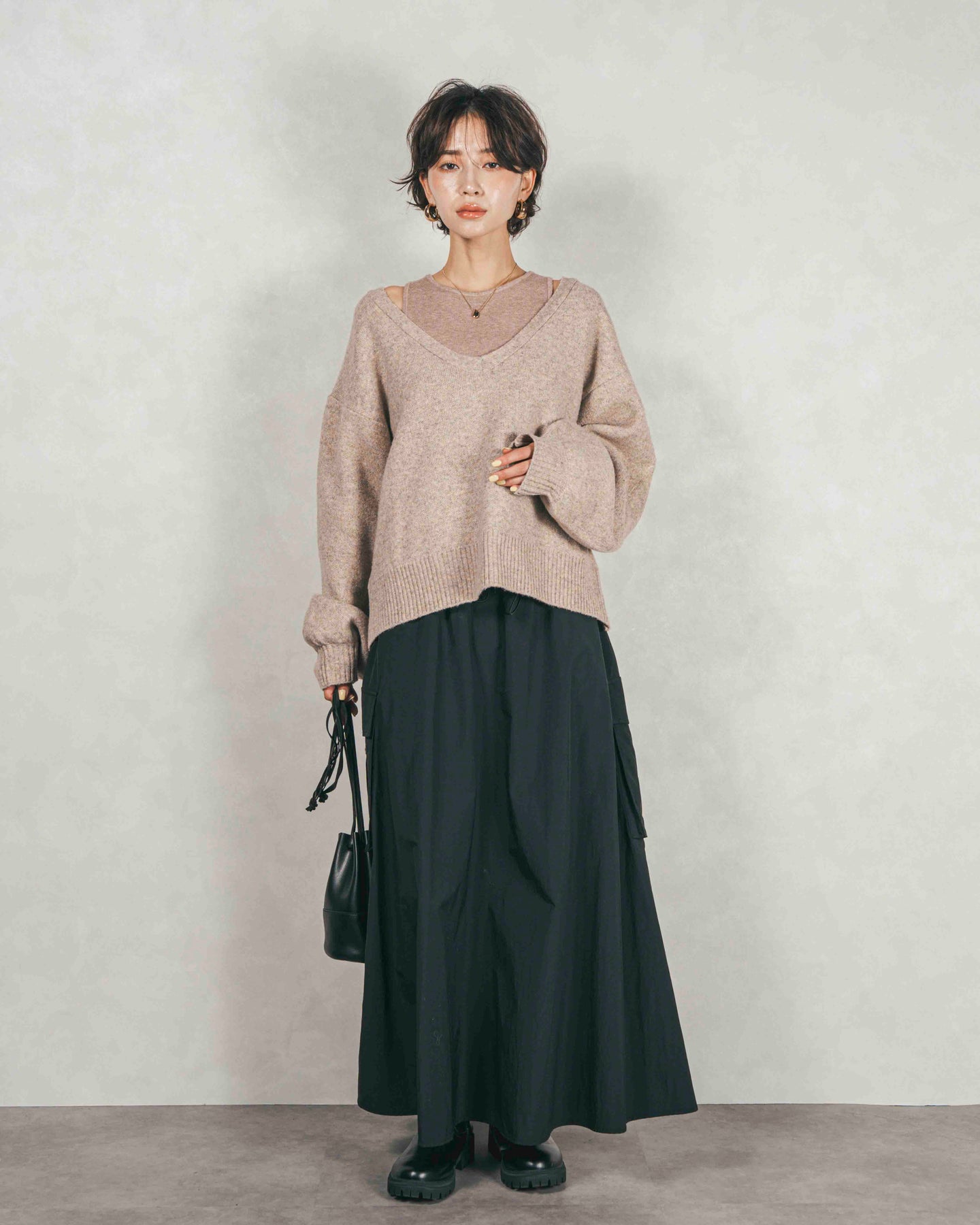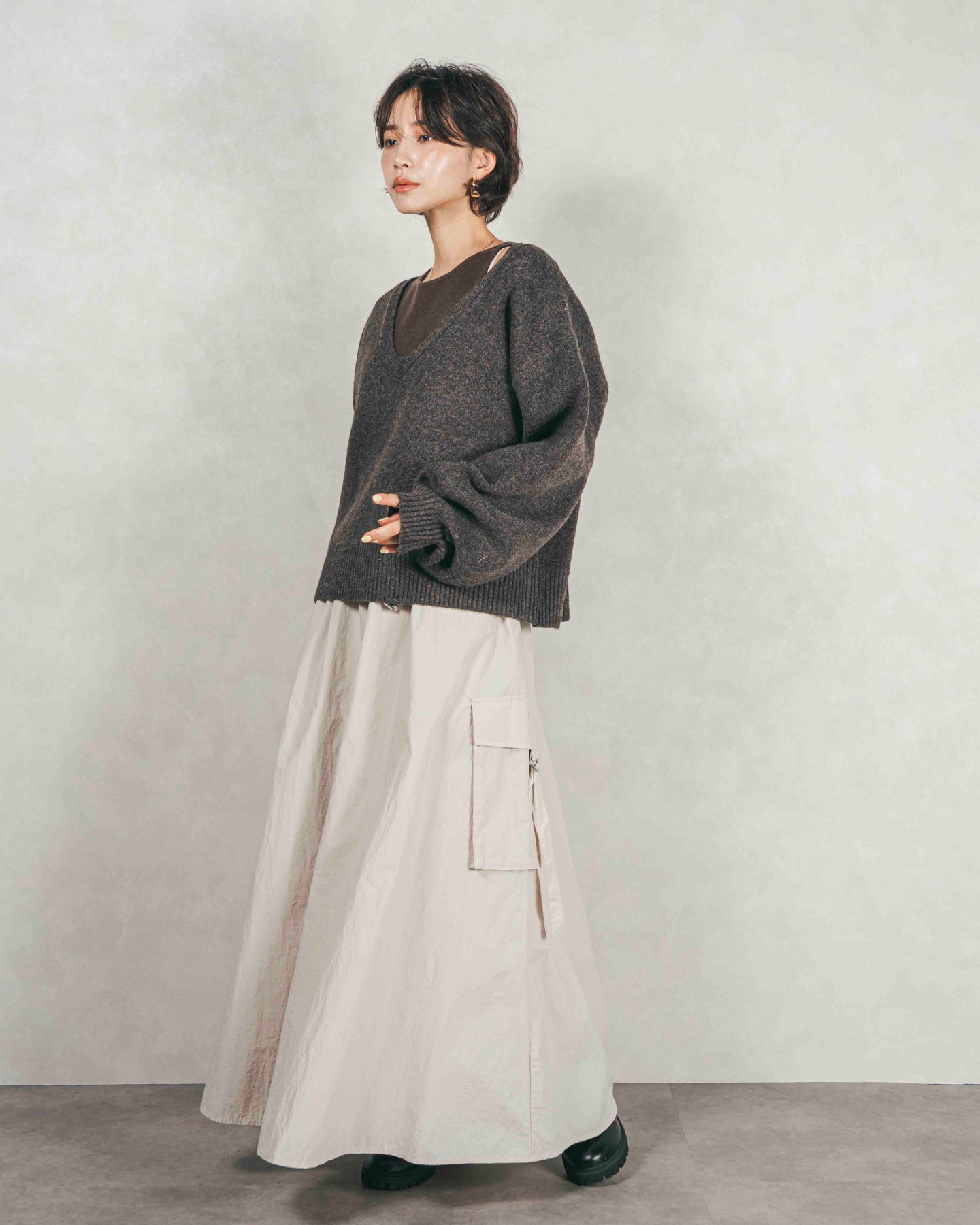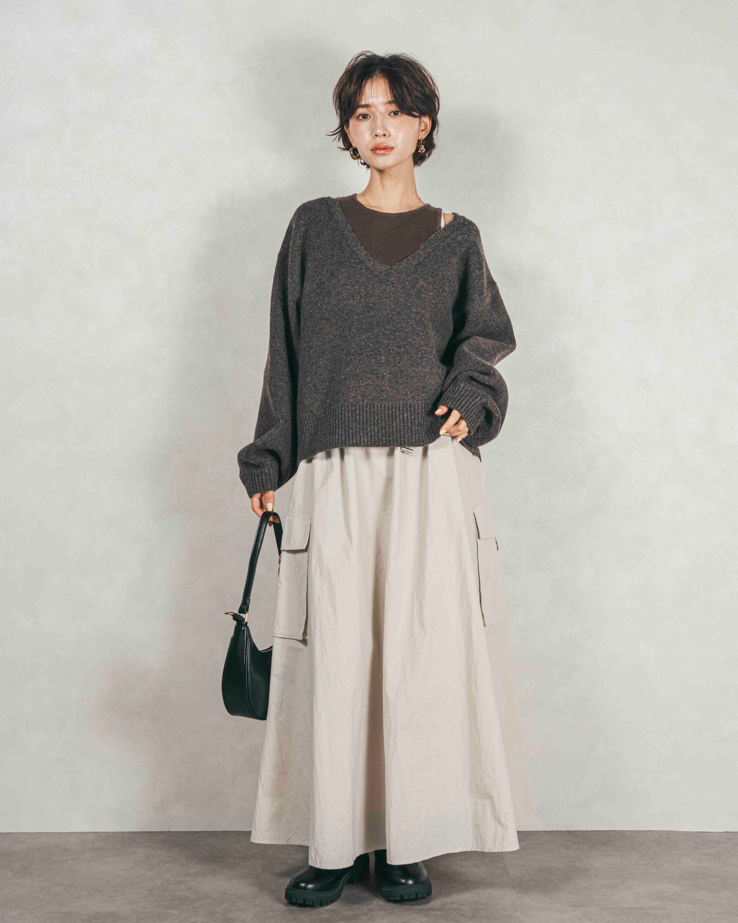 [SET]メランジVネックニットレイヤードセット+ドローストリングナイロンカーゴスカート(2SET)