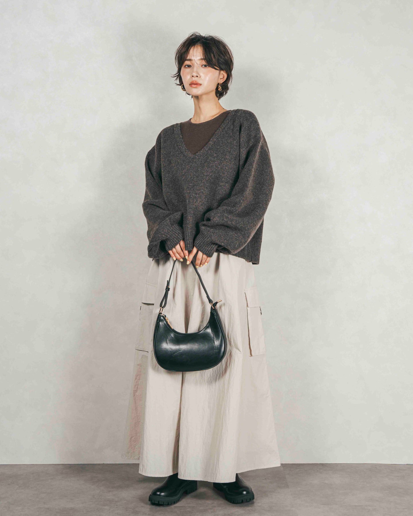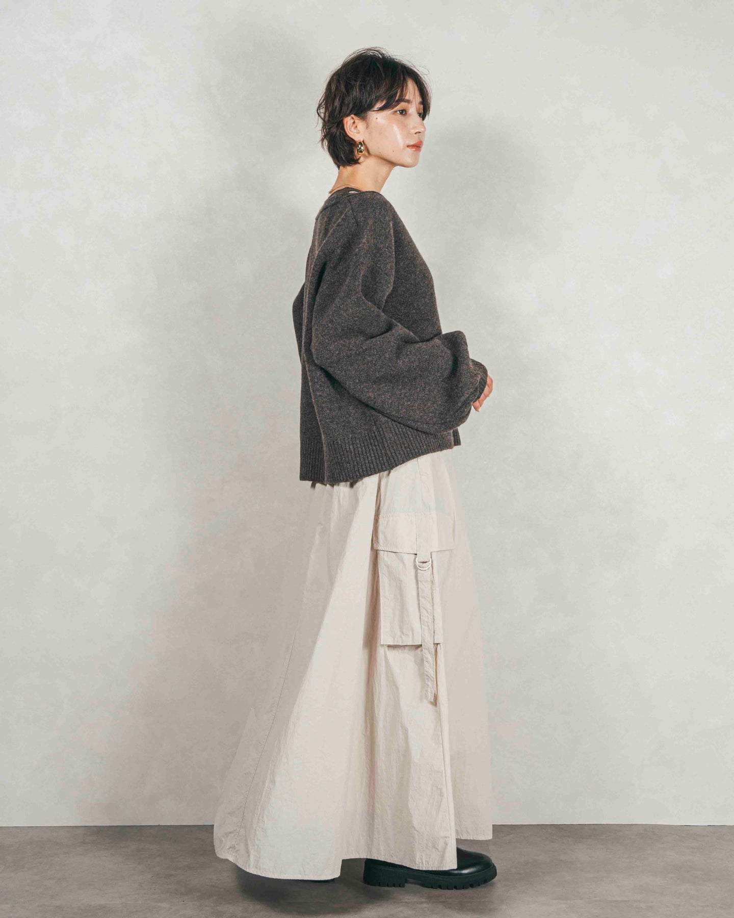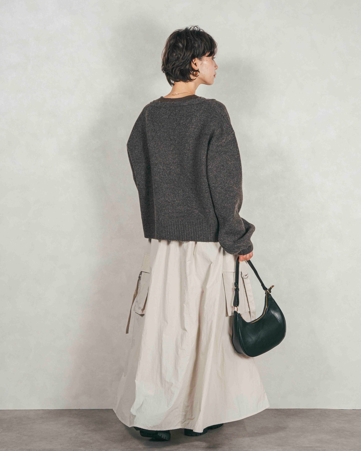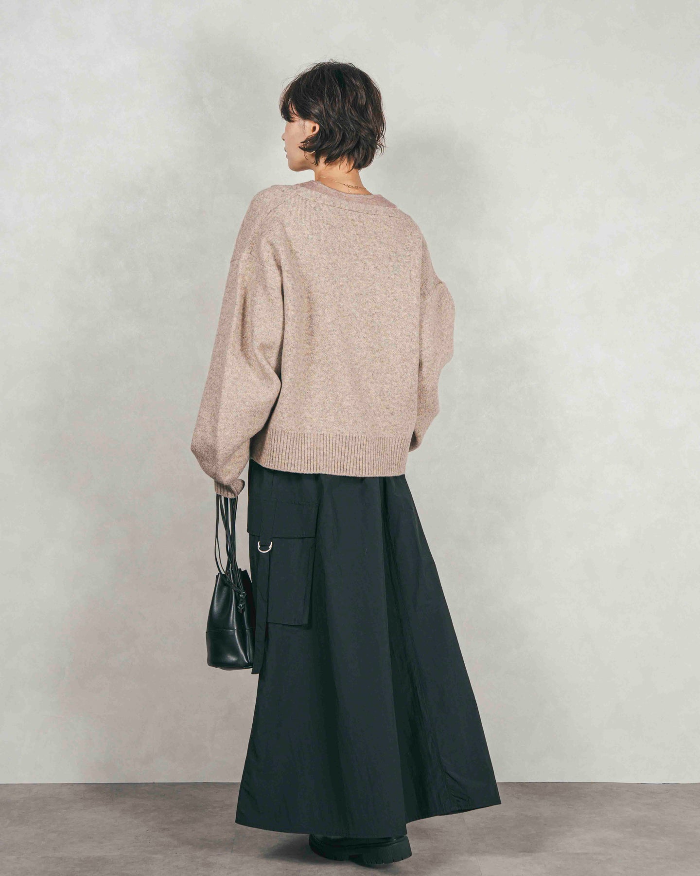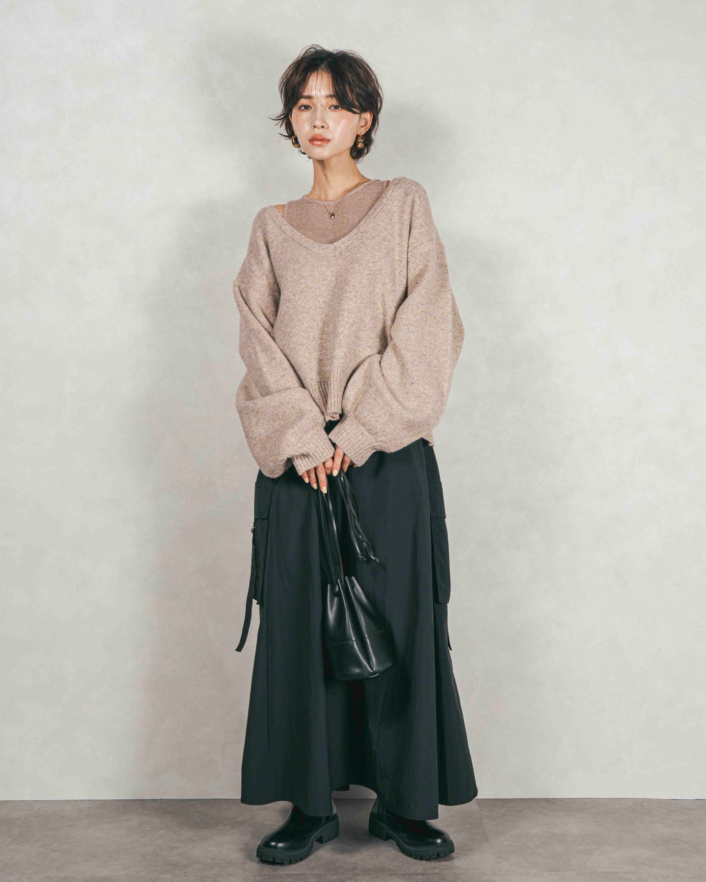 [SET]メランジVネックニットレイヤードセット+ドローストリングナイロンカーゴスカート(2SET)