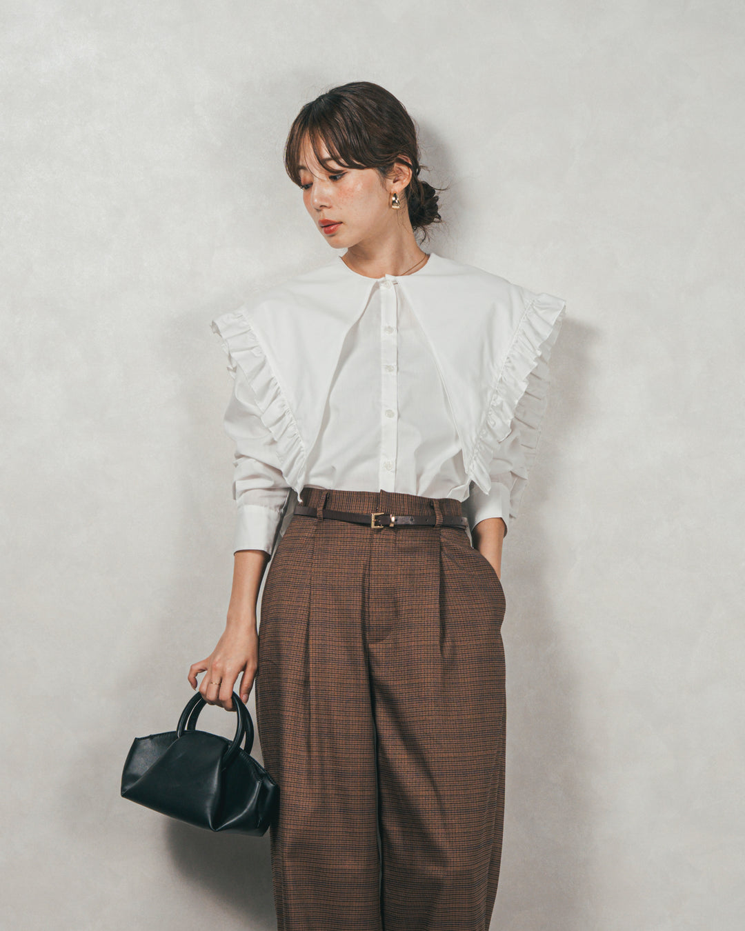 [SET]2WAYビッグフリルカラーブラウス+Effortless チェックタックパンツ(2SET)