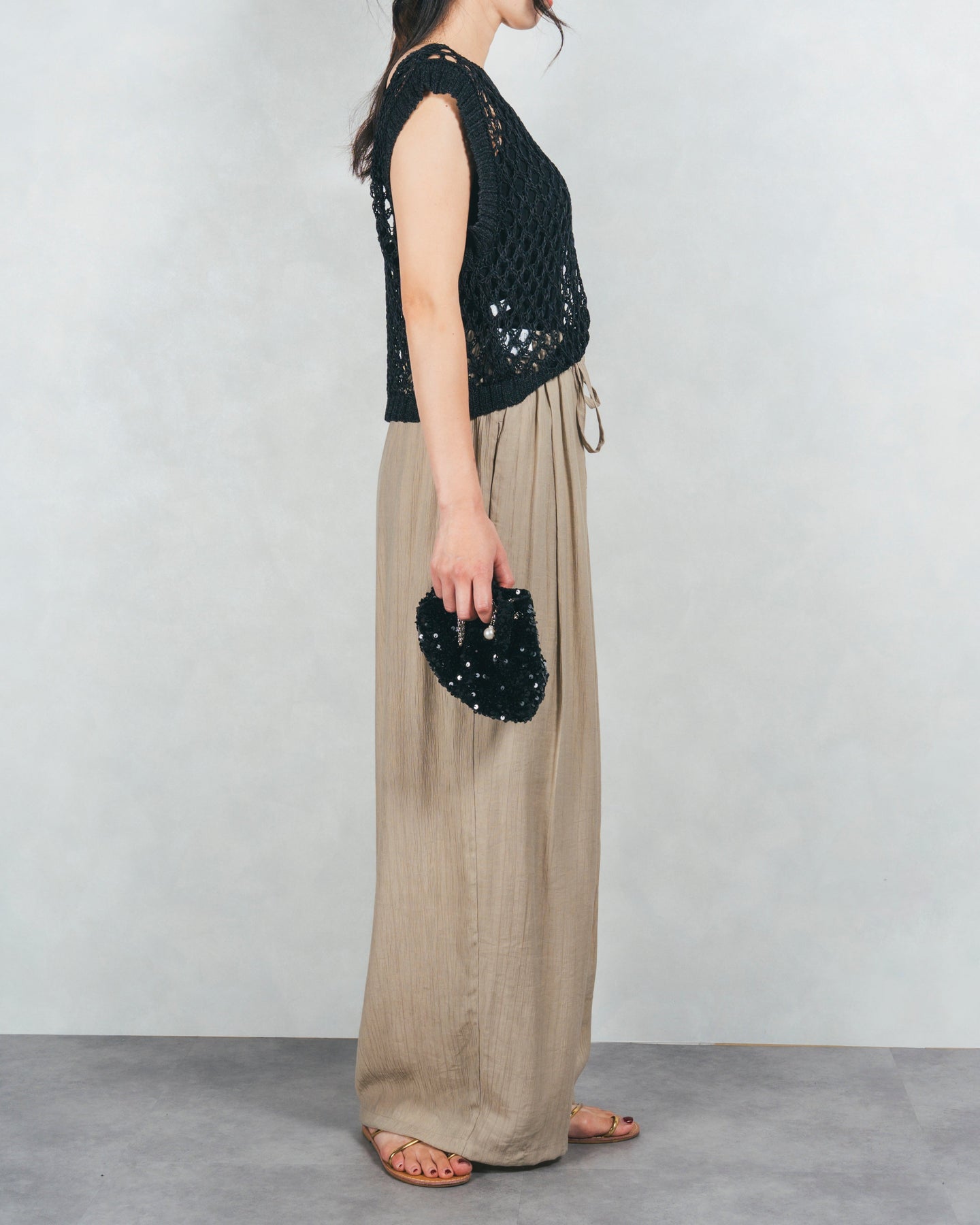 軽やかな落ち感と、ほんのり光沢感のある素材が魅力のワイドパンツ。ウエストはオールゴム仕様+ドロスト付きで、ストレスフリーな穿き心地ながら、シルエットはすっきり。たっぷりとしたギャザーが動くたびに揺れ、暑い季節でも涼やかな印象をキープします。腰まわりや脚のラインを自然にぼかしてくれるので、体型カバーできるのも嬉しいポイント◎