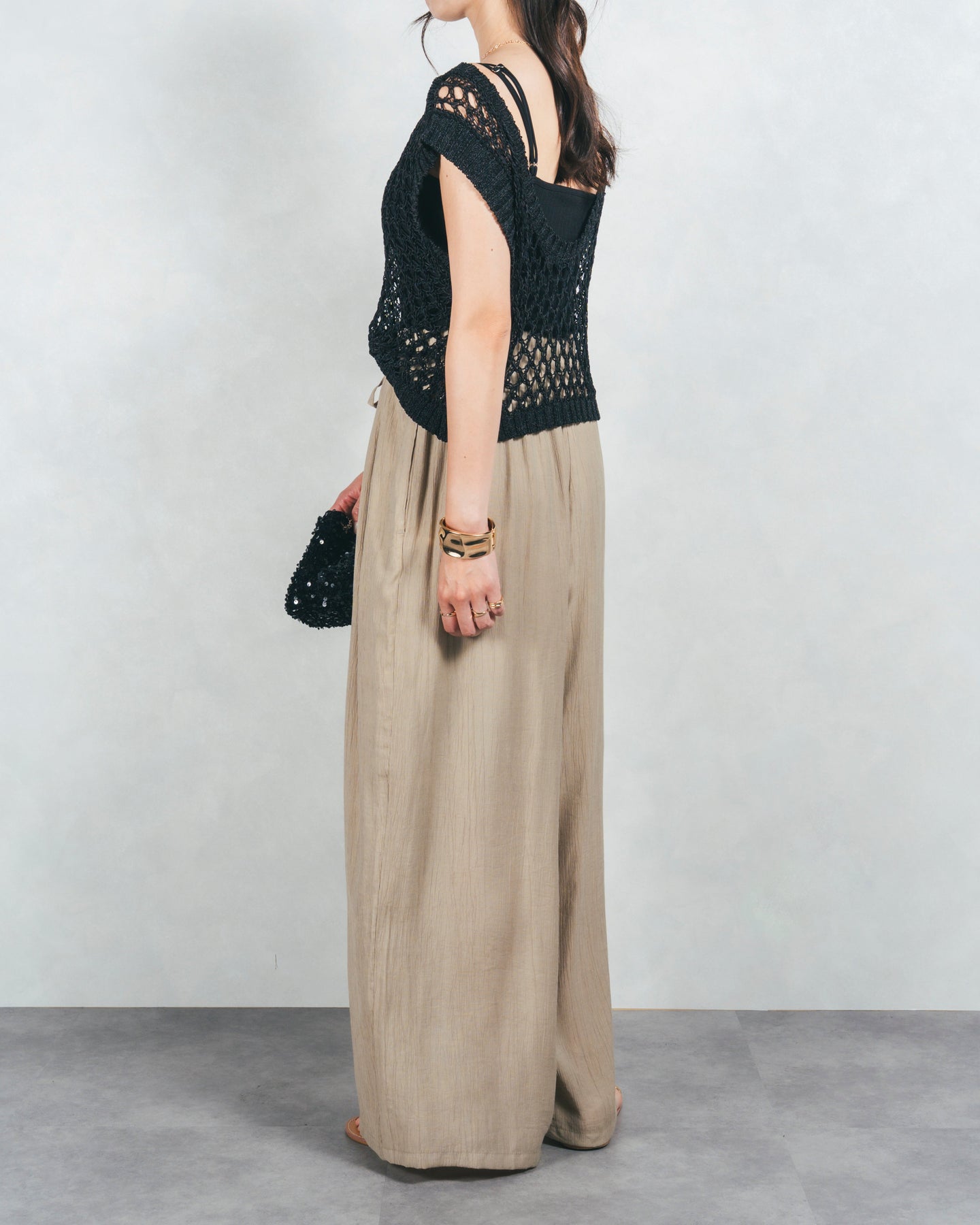 リネンのようなさらりとした質感が魅力のメッシュニットベスト。ざっくり編みのメッシュデザインが、夏のレイヤードにぴったりです。前後どちらでも着用できる2WAY仕様で、ネックラインの見え方を気分やスタイリングに合わせて変えられるのも嬉しいポイント。
