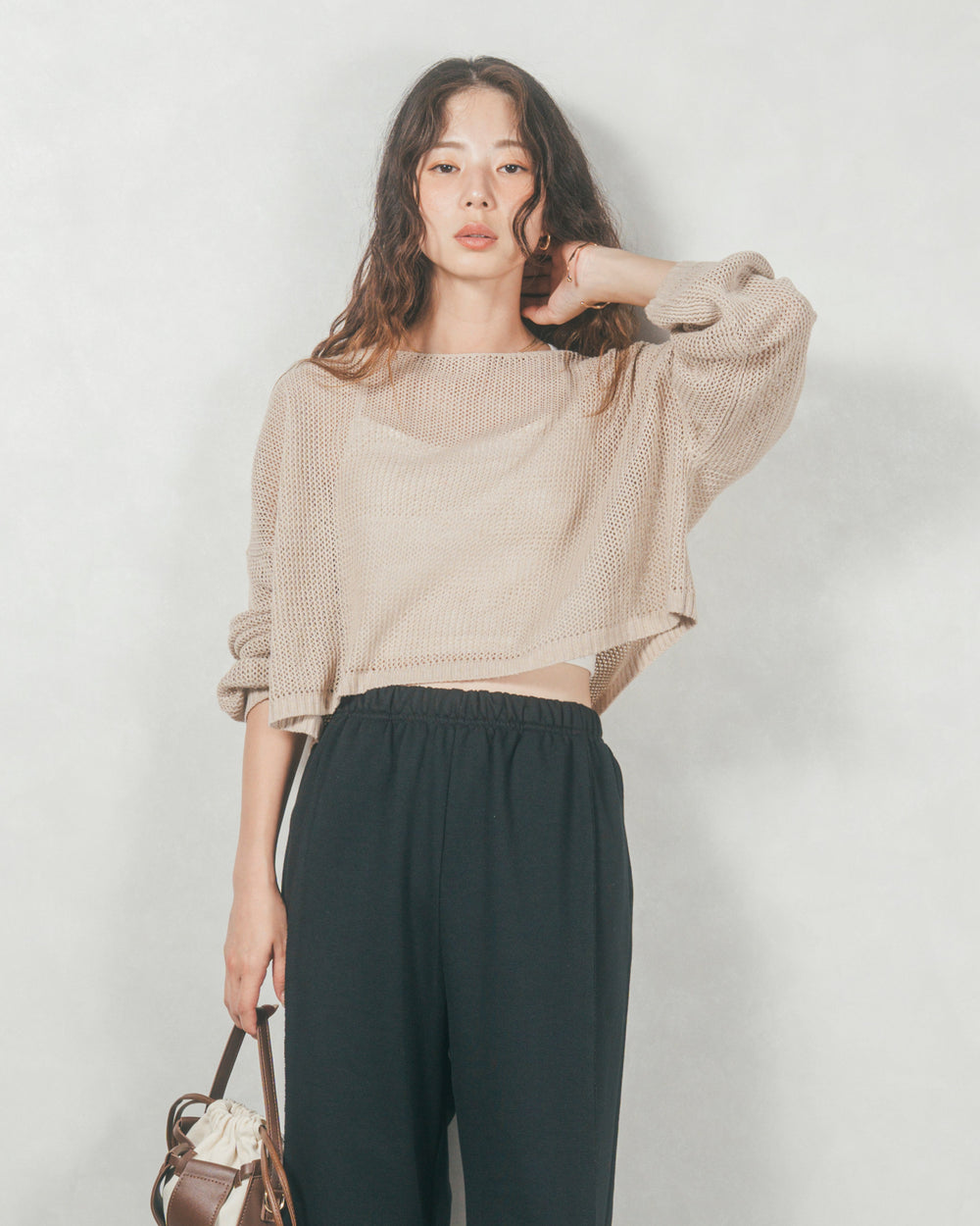 程よくルーズなシルエットとショート丈が絶妙なバランスのメッシュショートプルオーバー。軽やかなポリエステル素材で、ほんのり透け感のある編み地が抜け感を演出。