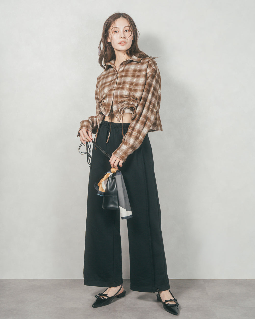 [SET]裾ドロストクロップドチェックシャツ+2-Way ウェーブデザインスウェットパンツ(2SET)
