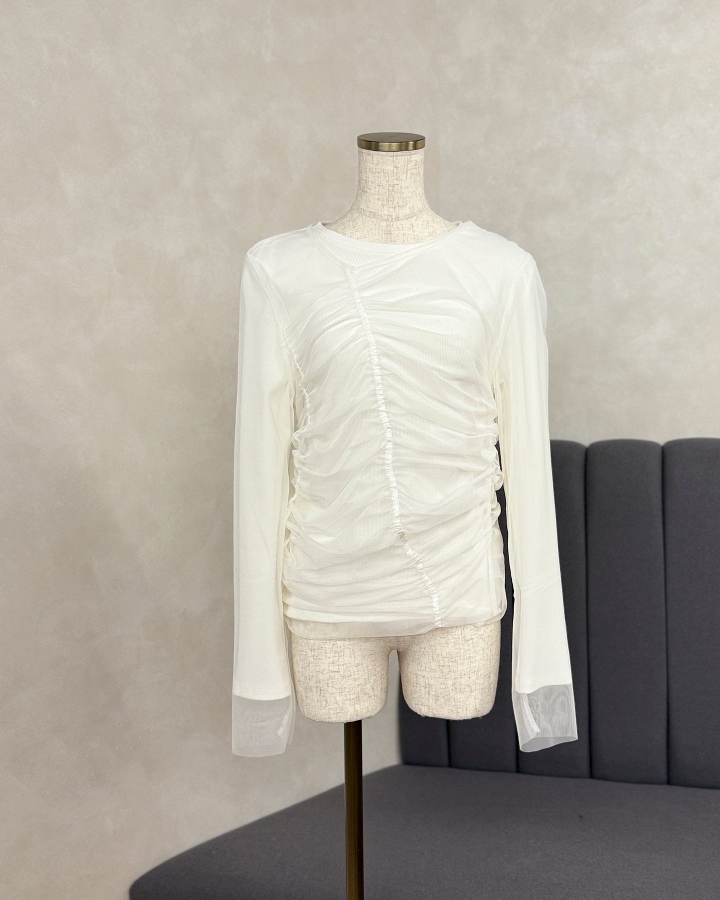 繊細な透け感が魅力のチュールトップスは、ほどよいフィット感とシャーリングディテールで女性らしさを演出。インナーとしても、一枚でレイヤードの主役としても活躍してくれる万能アイテムです。