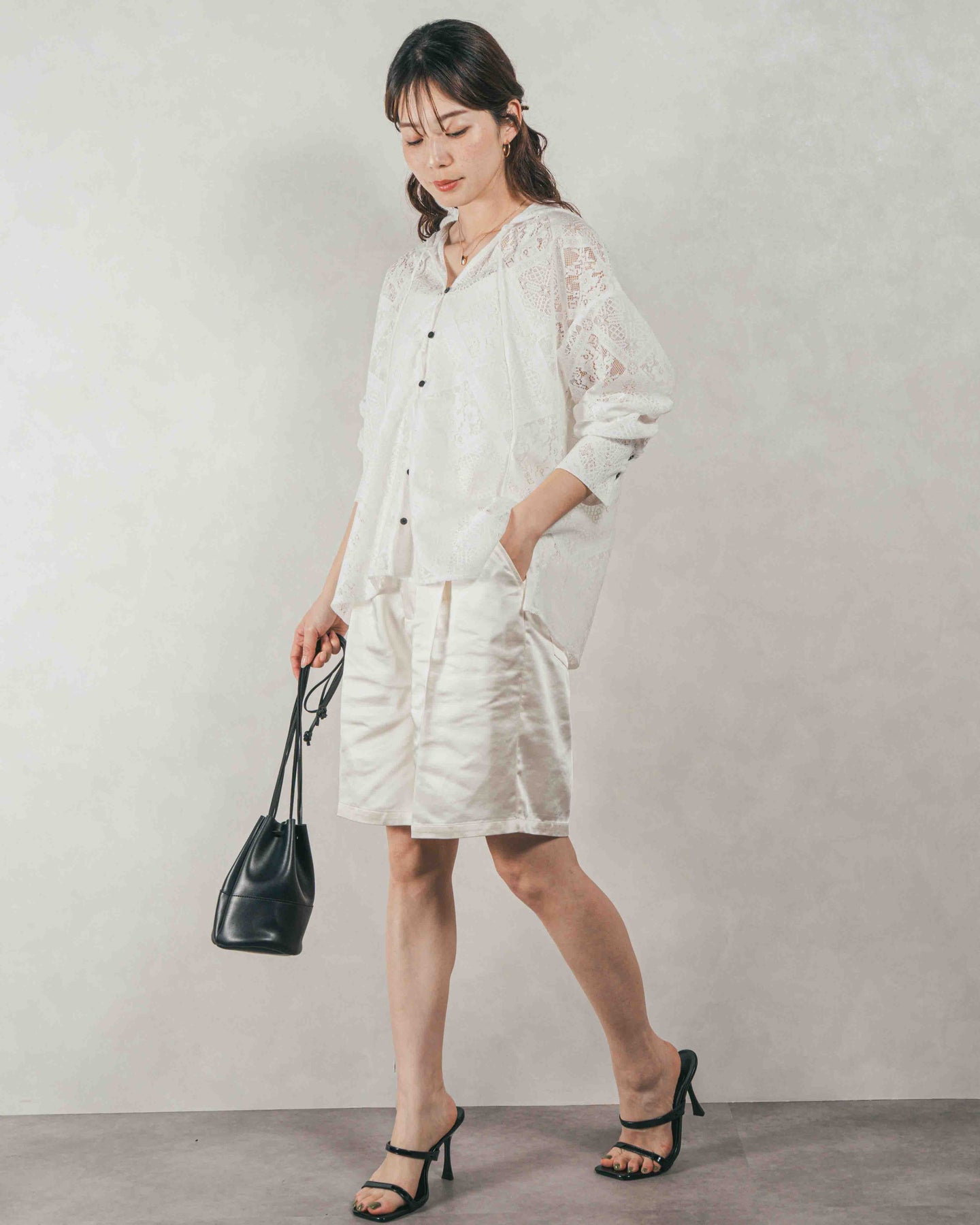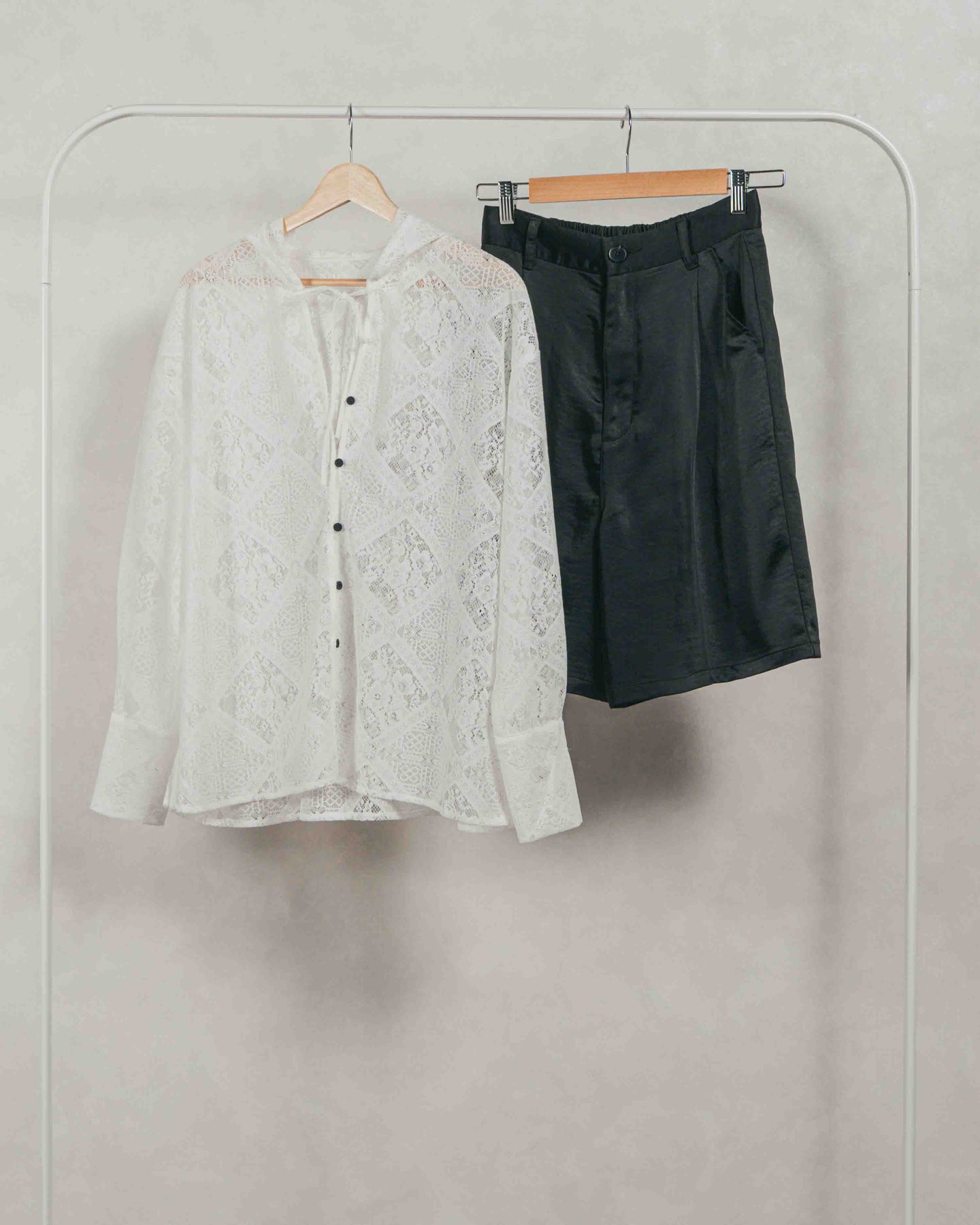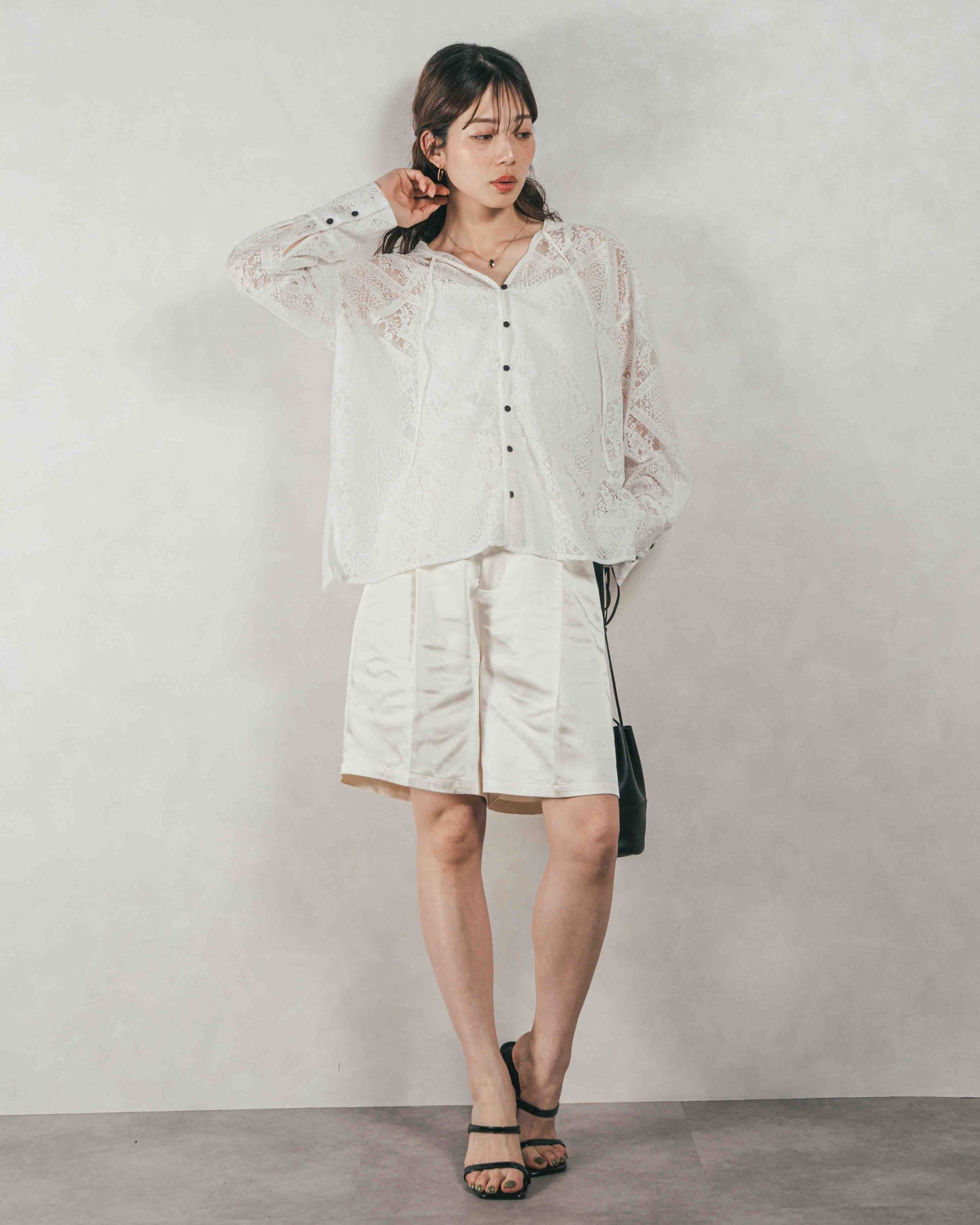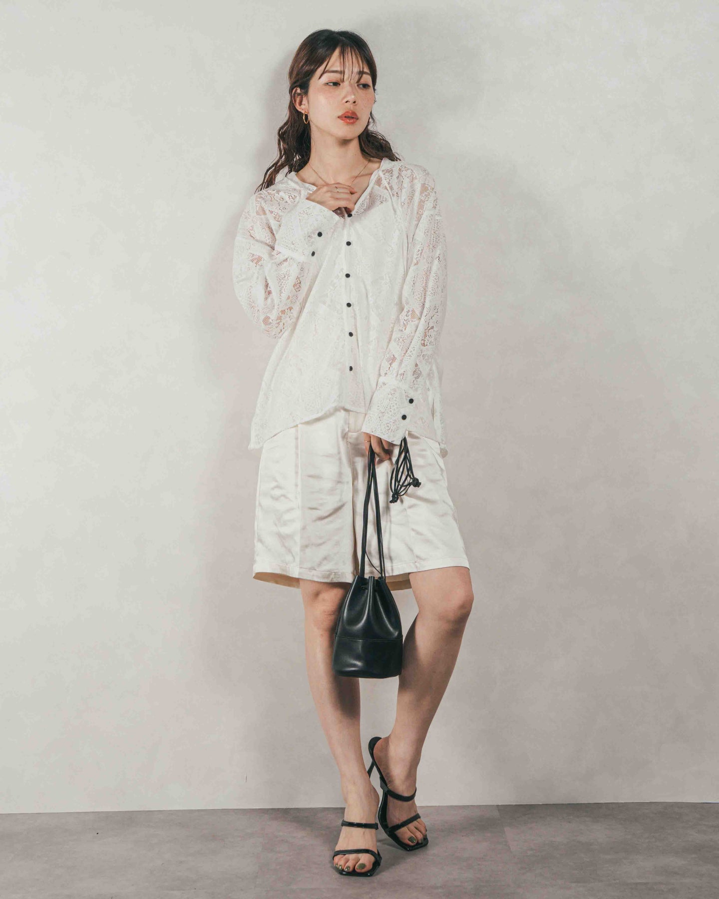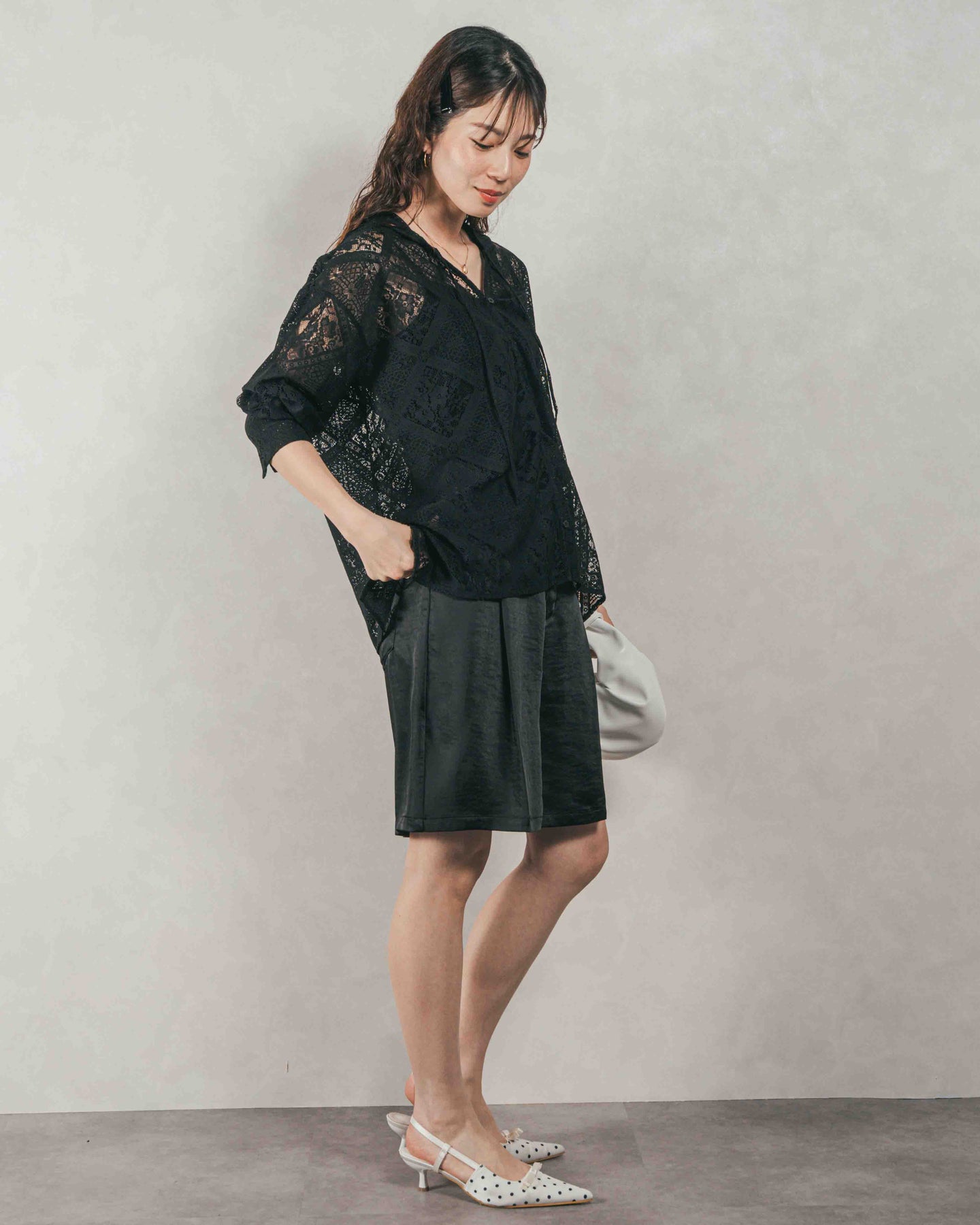 [SET]Blockレース フーディーブラウス + Vintageサテンハーフパンツ(2SET)