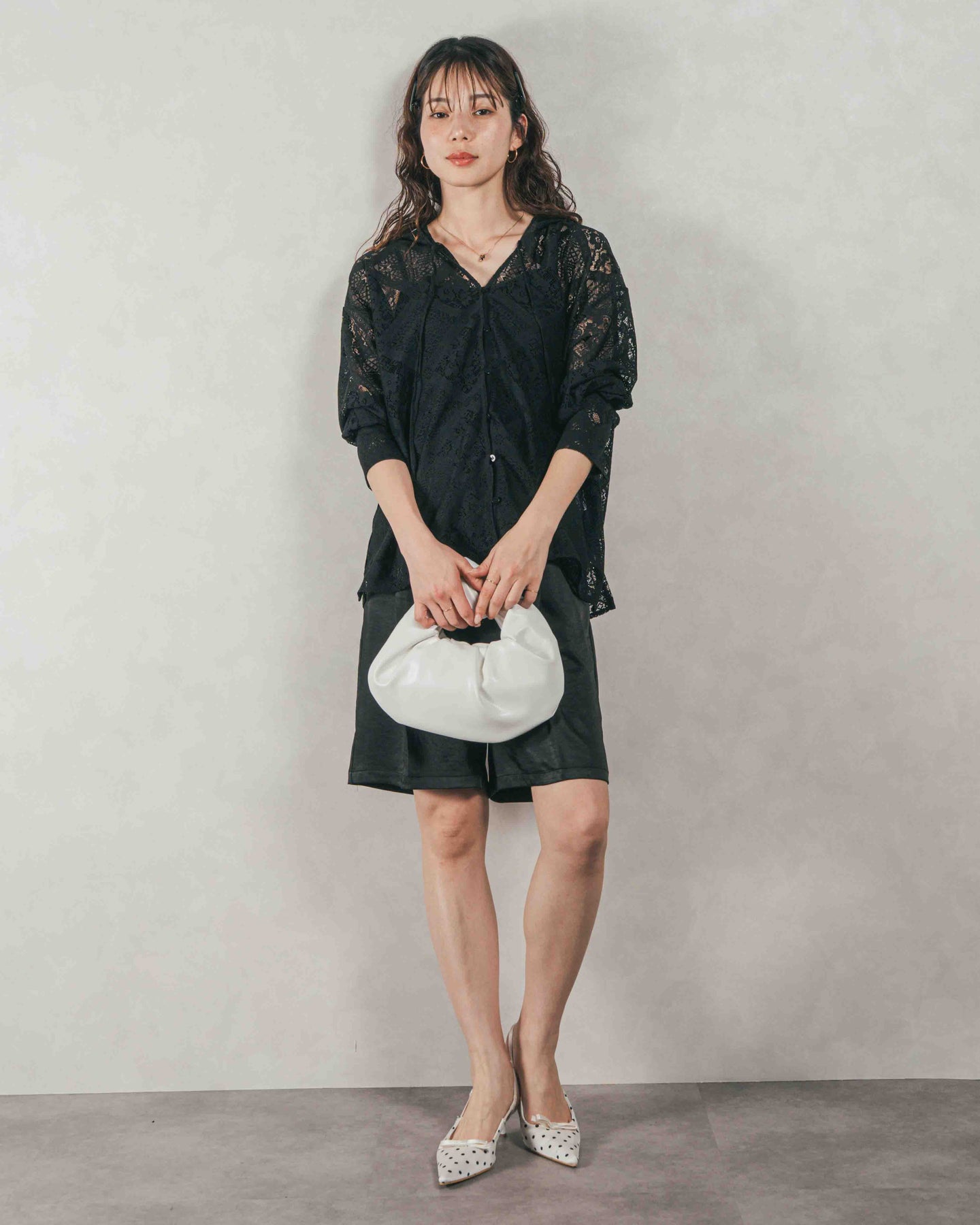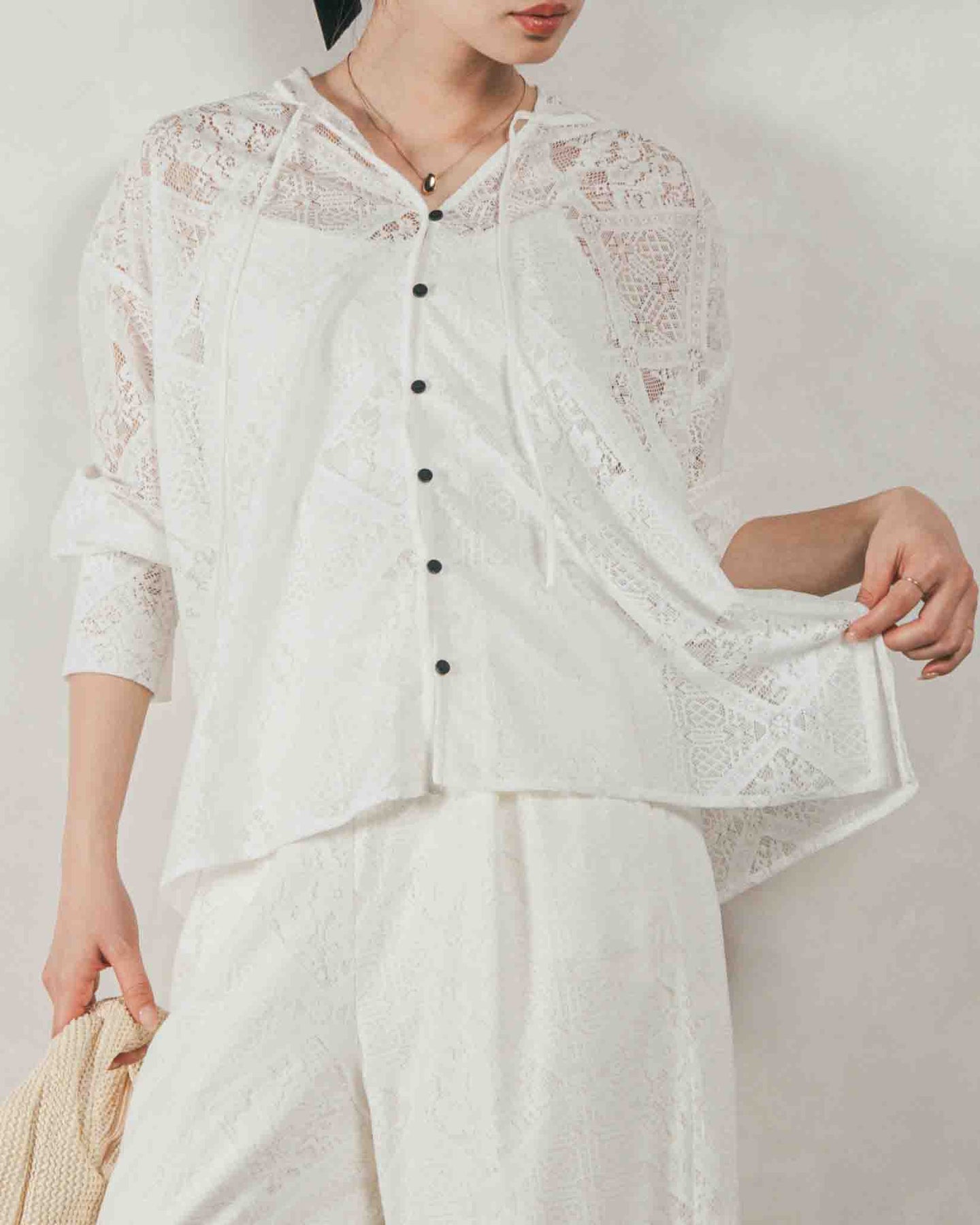 カジュアルになりがちなパーカのデザインを、あえて繊細なレース素材でデザインした遊び心のある1枚です。サイドにはスリット入り。ボタンを開けて羽織りにすると、ぐっとコーデが華やかに。