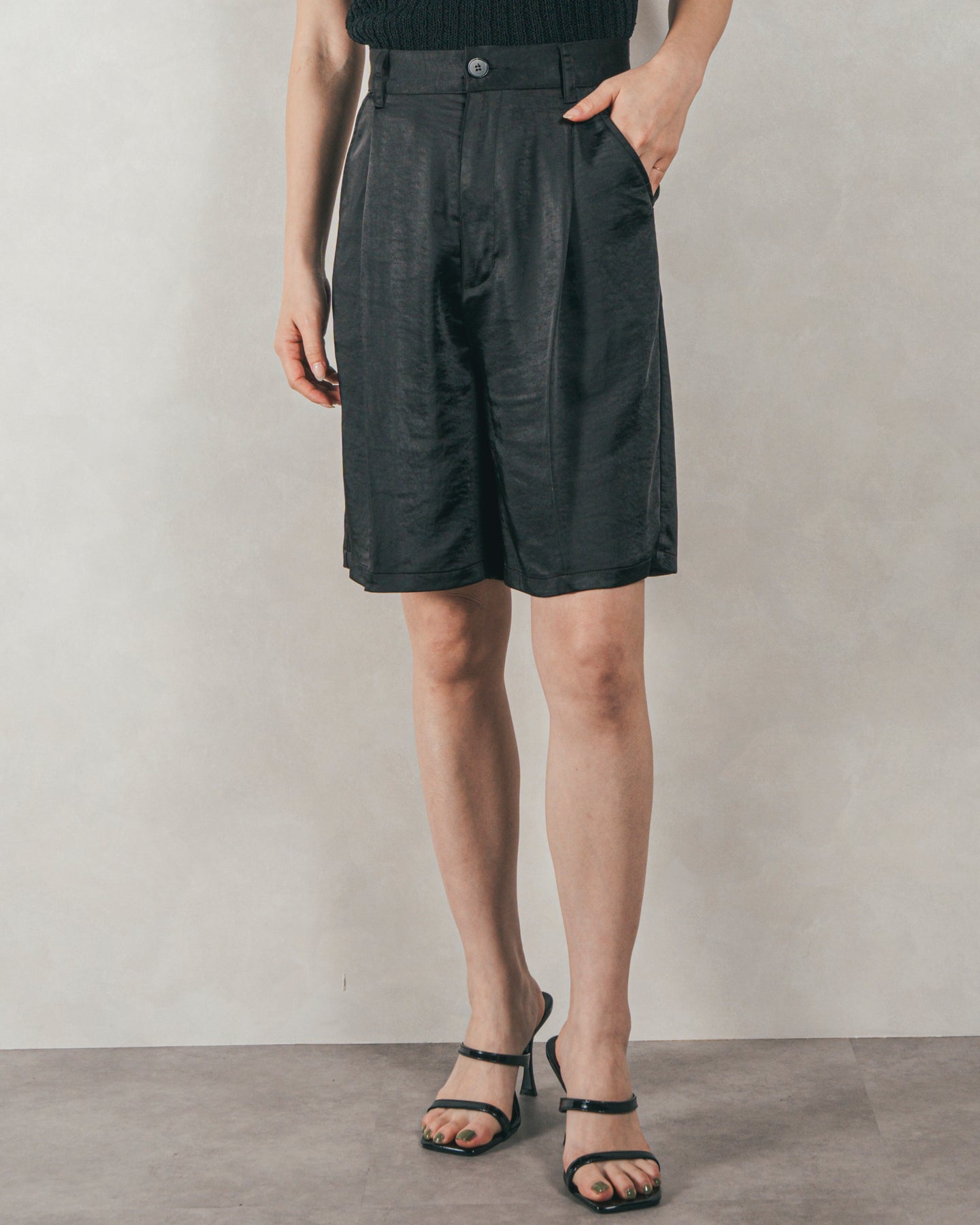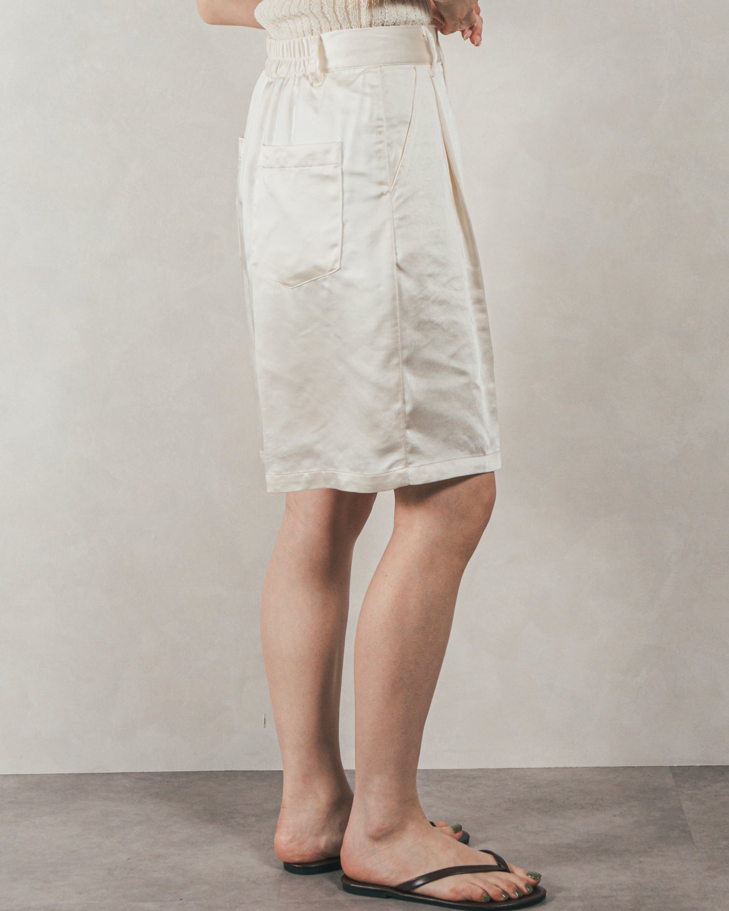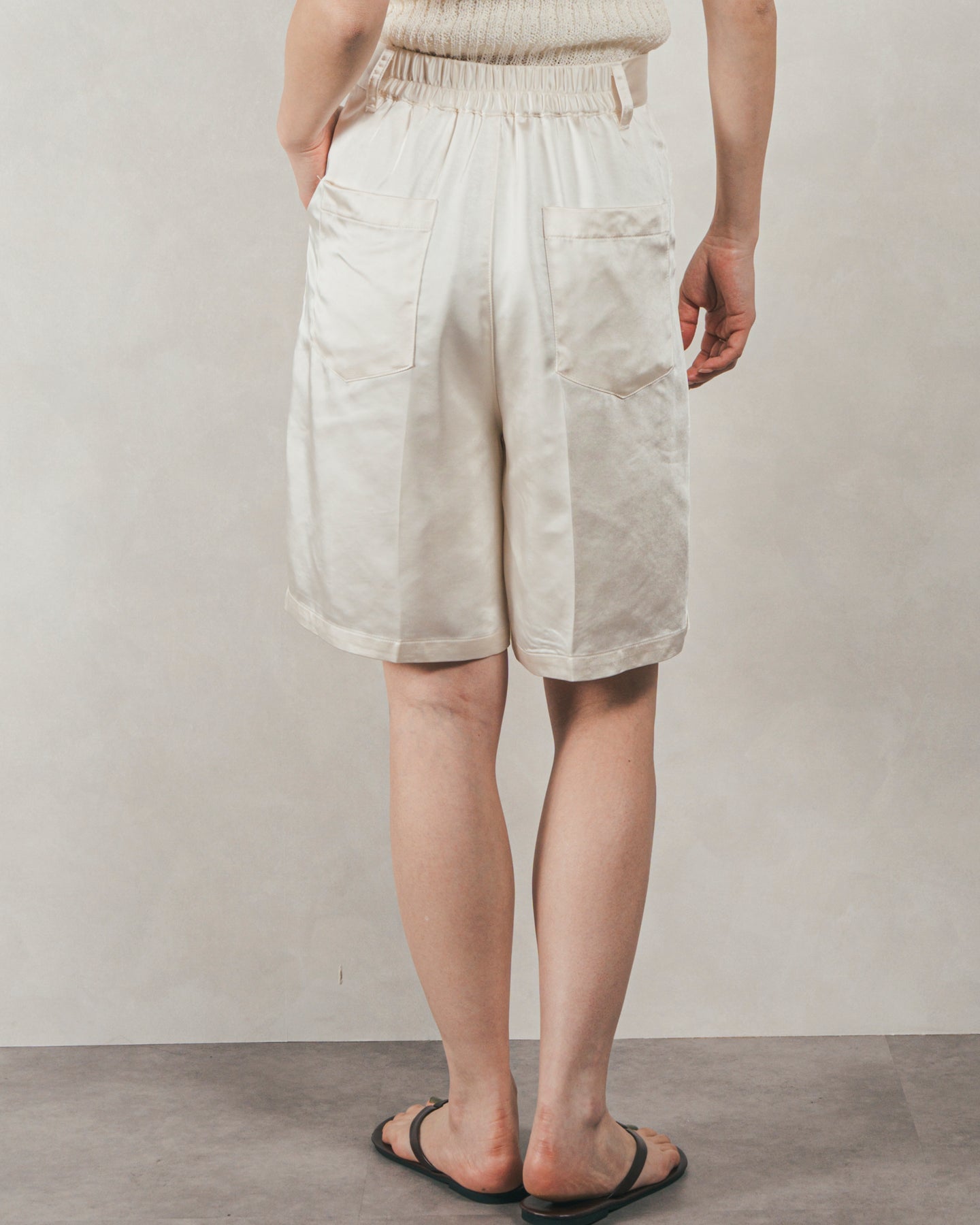 短すぎない絶妙な丈感と程よくゆとりのあるシルエットが脚のラインをカバーします。センタータックがあることでラフになりすぎず、きれいめなニュアンスに。バックはゴムで履き心地も◎