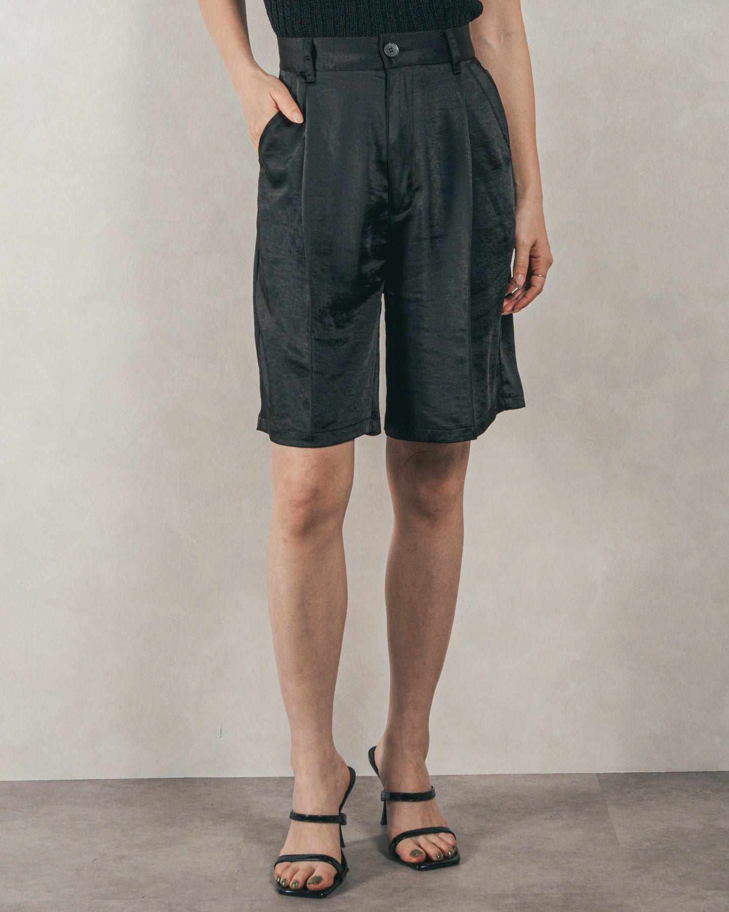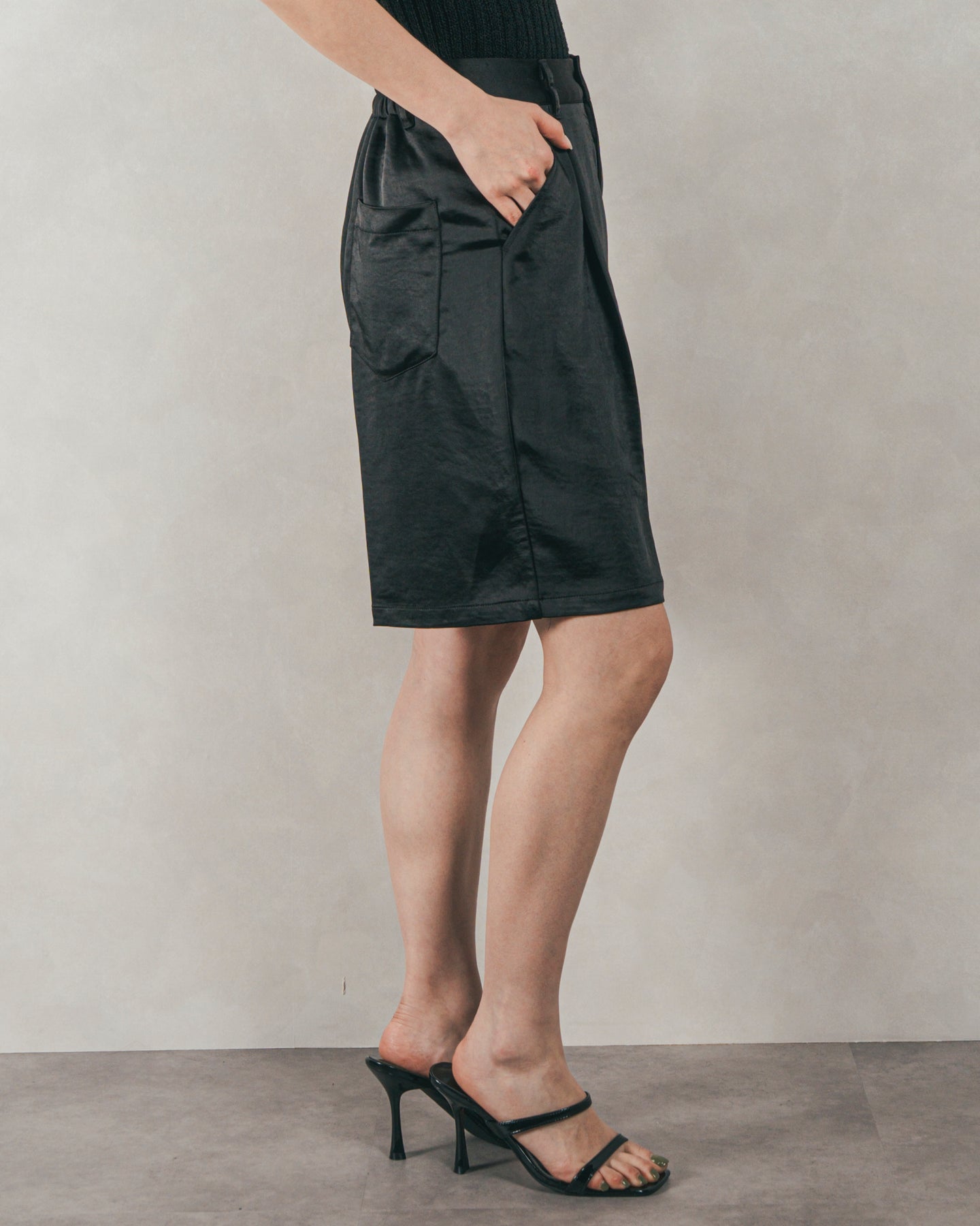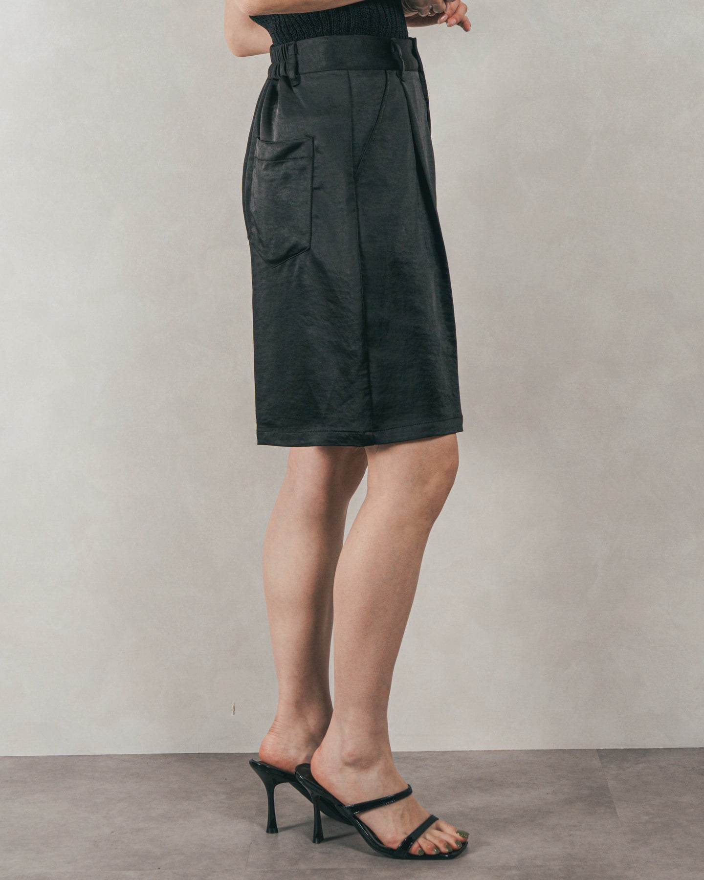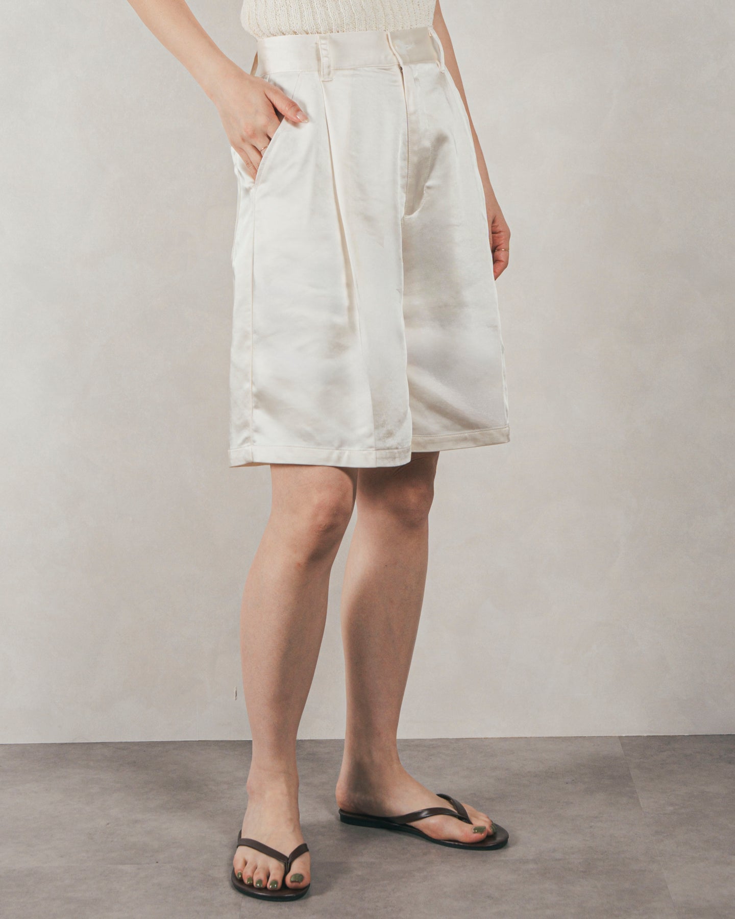短すぎない絶妙な丈感と程よくゆとりのあるシルエットが脚のラインをカバーします。センタータックがあることでラフになりすぎず、きれいめなニュアンスに。バックはゴムで履き心地も◎