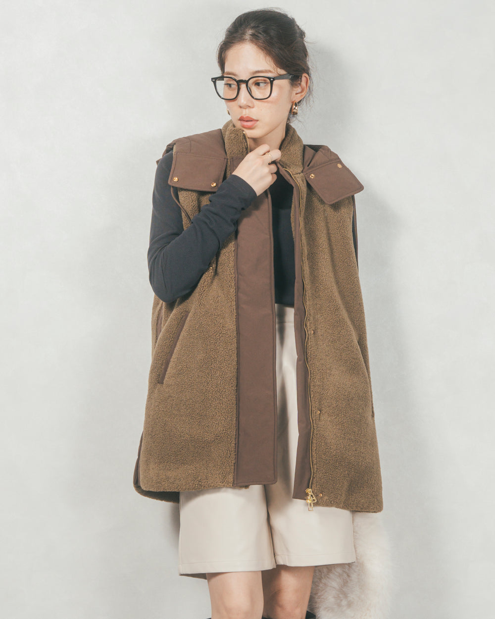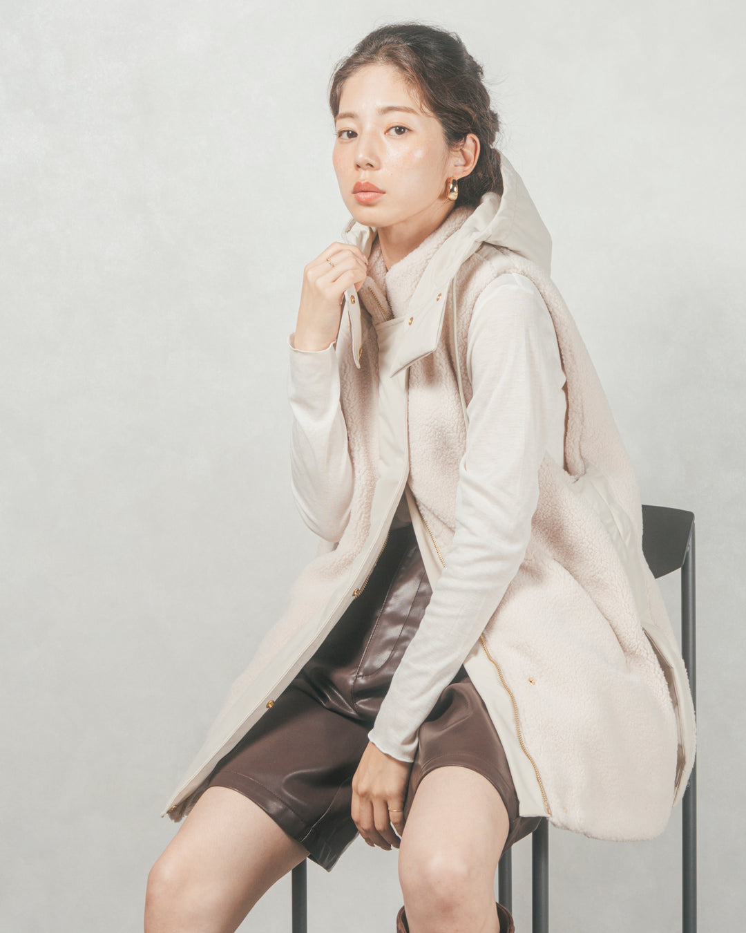 [SET]ボアxナイロン フーディーベスト+レザーライクハーフパンツ(2SET)
