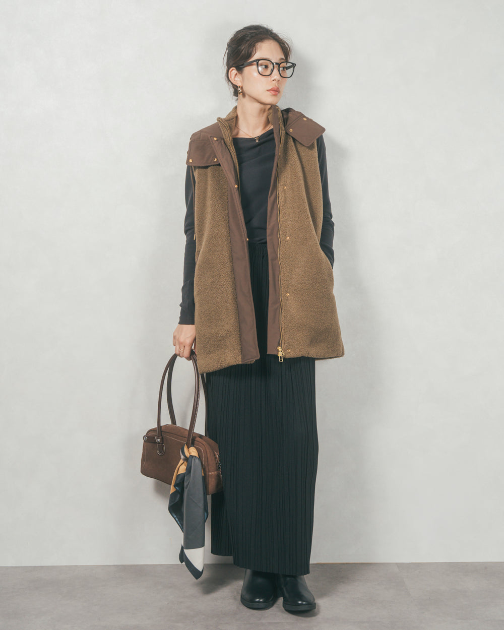 [SET]ボアxナイロン フーディーベスト+プリーツNarrowロングスカート(2SET)