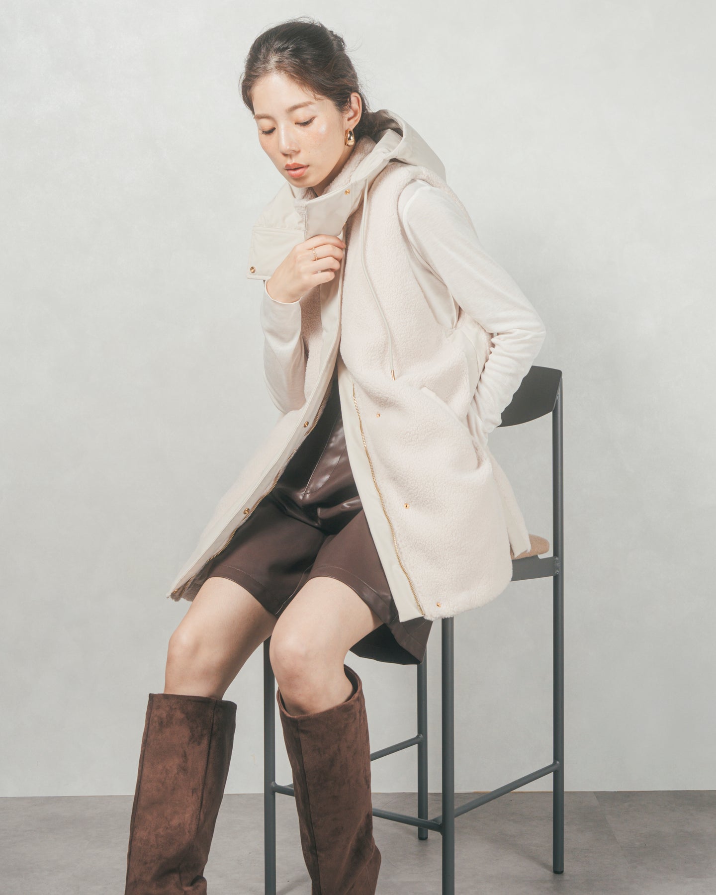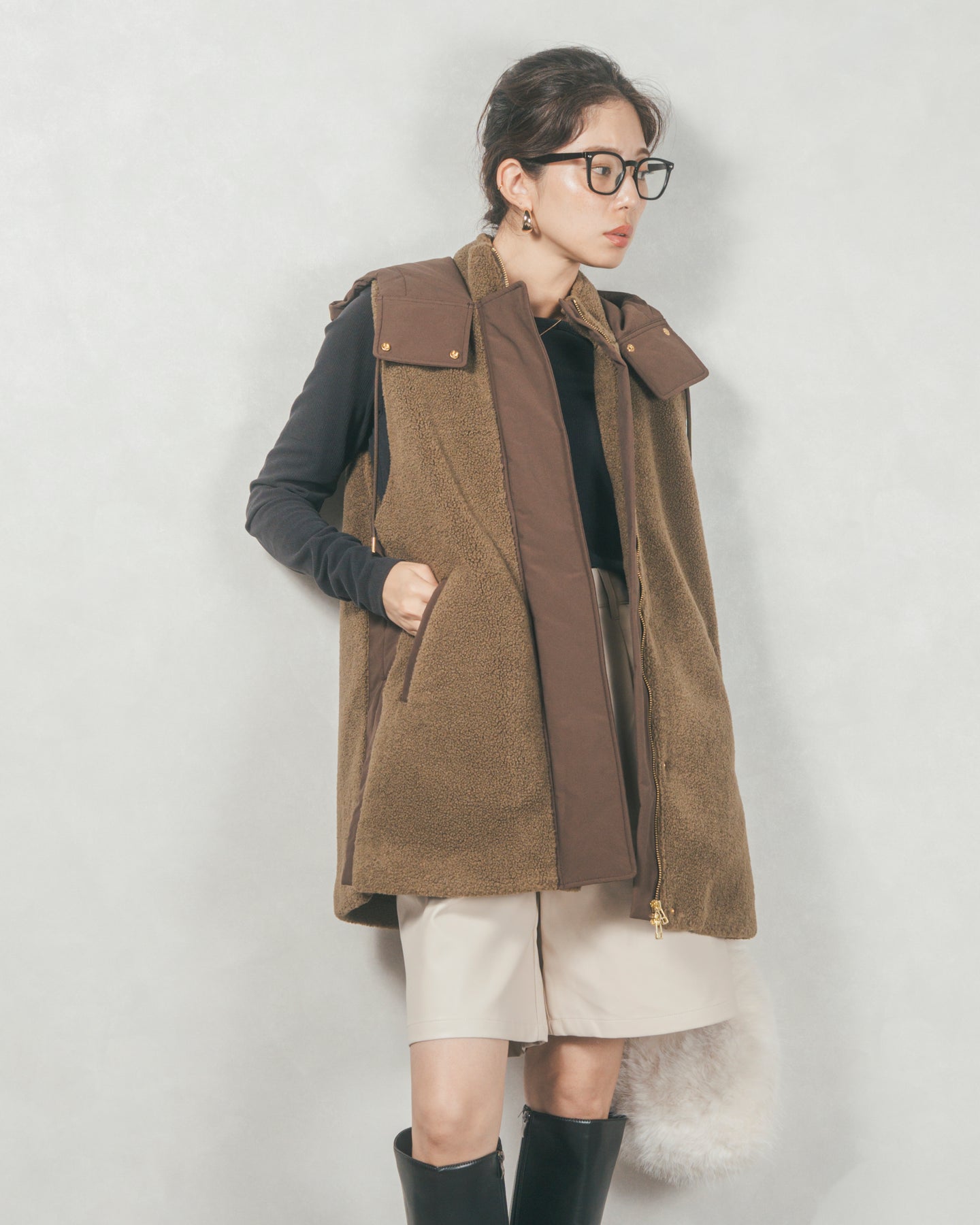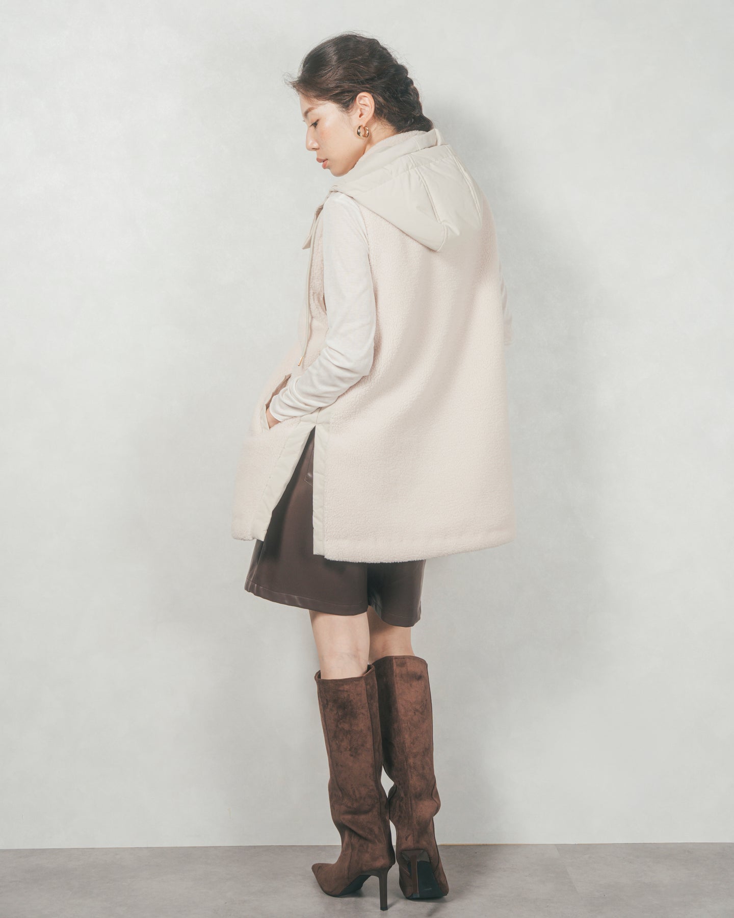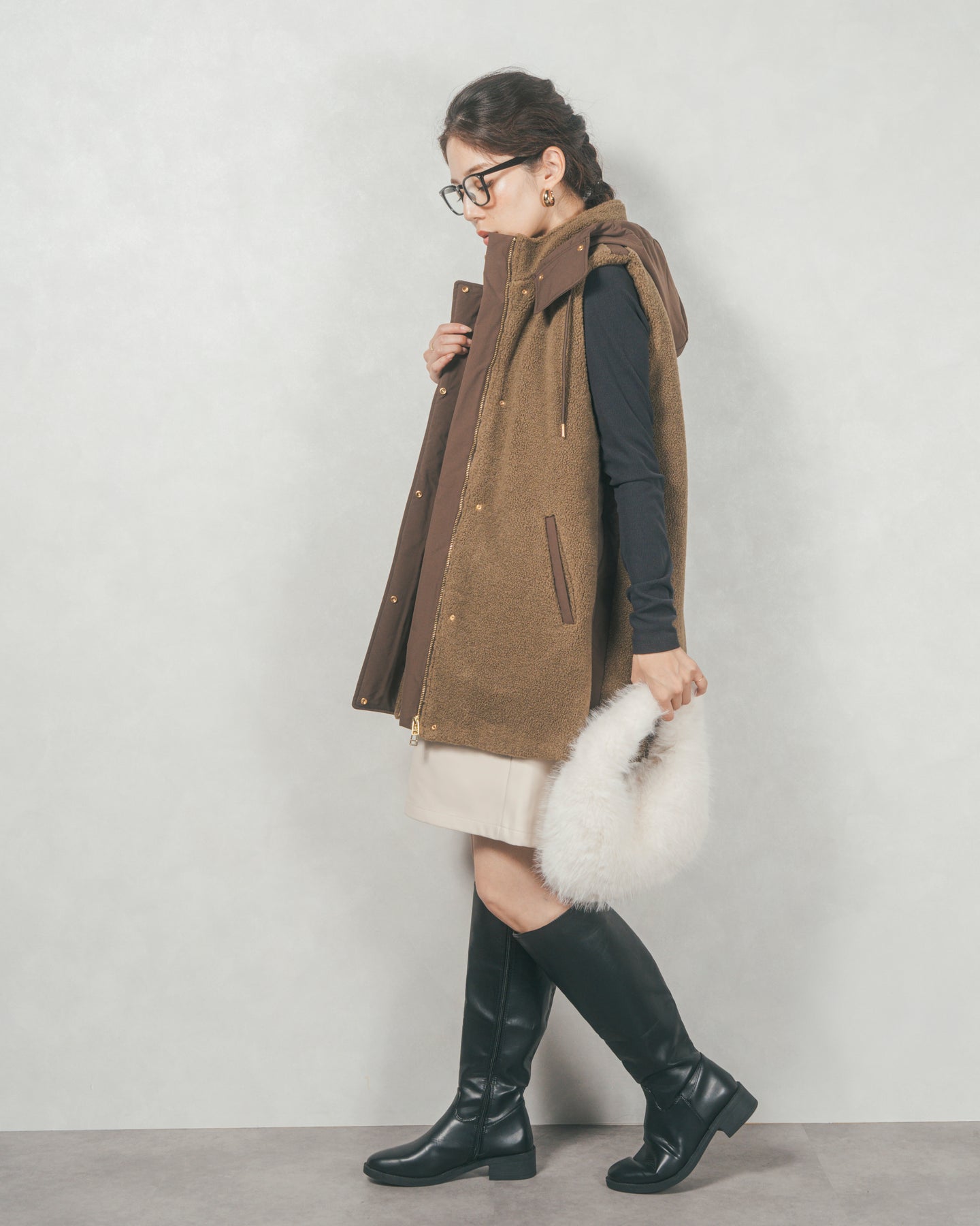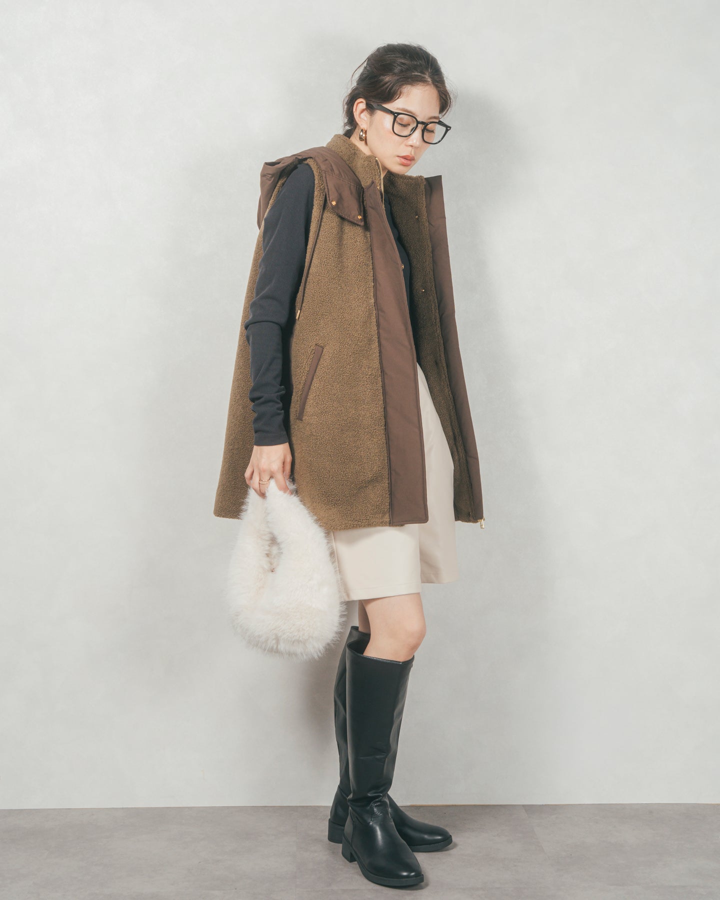 羽織るだけで、シンプルコーデがぐっと垢抜ける。柔らかなボアとマットなポリエステル素材を組み合わせた、異素材MIXのベストが登場です。
