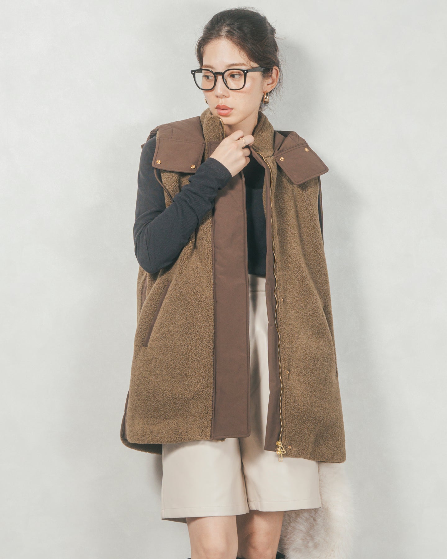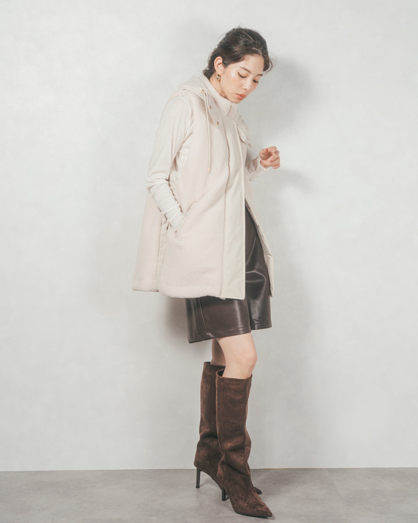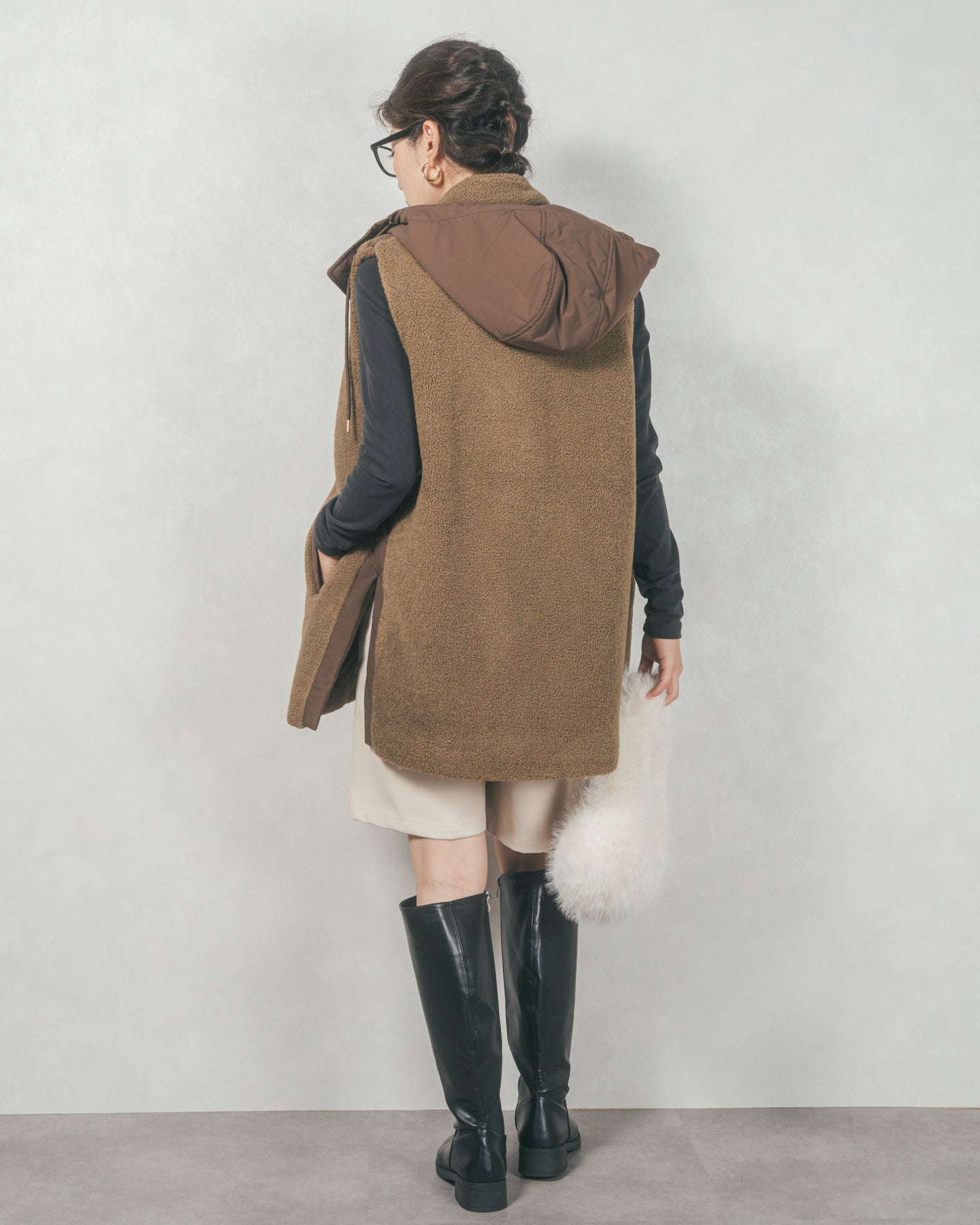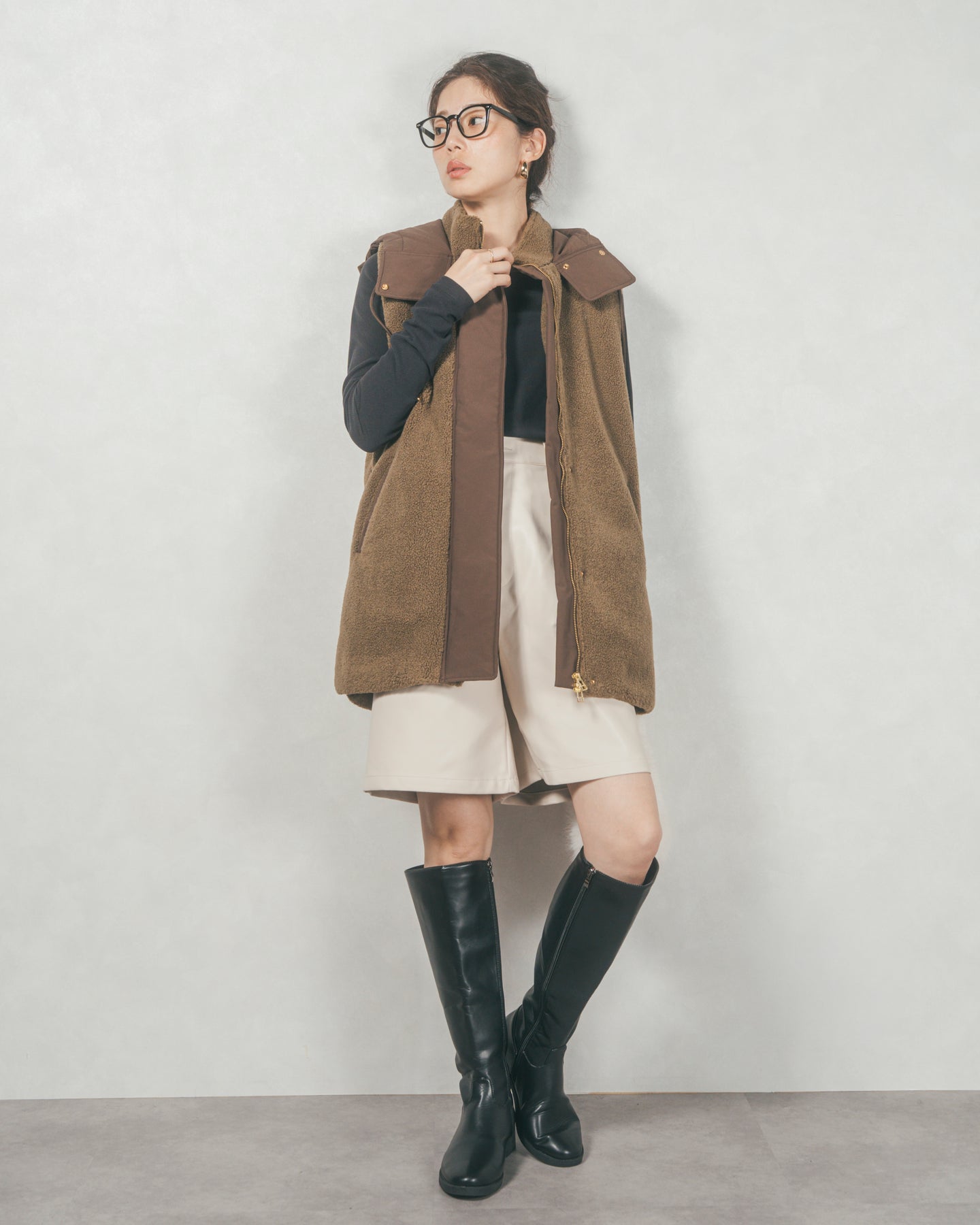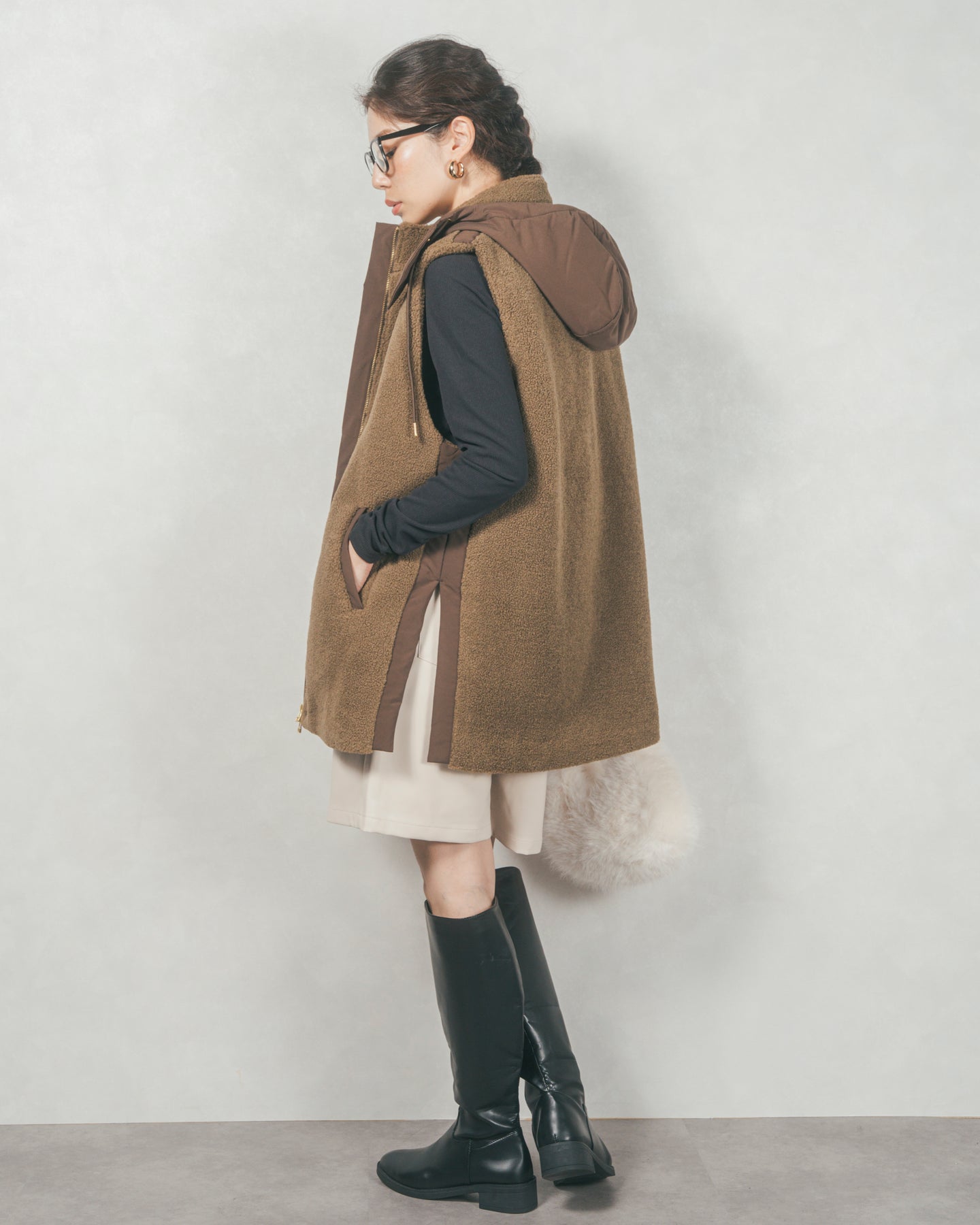 羽織るだけで、シンプルコーデがぐっと垢抜ける。柔らかなボアとマットなポリエステル素材を組み合わせた、異素材MIXのベストが登場です。