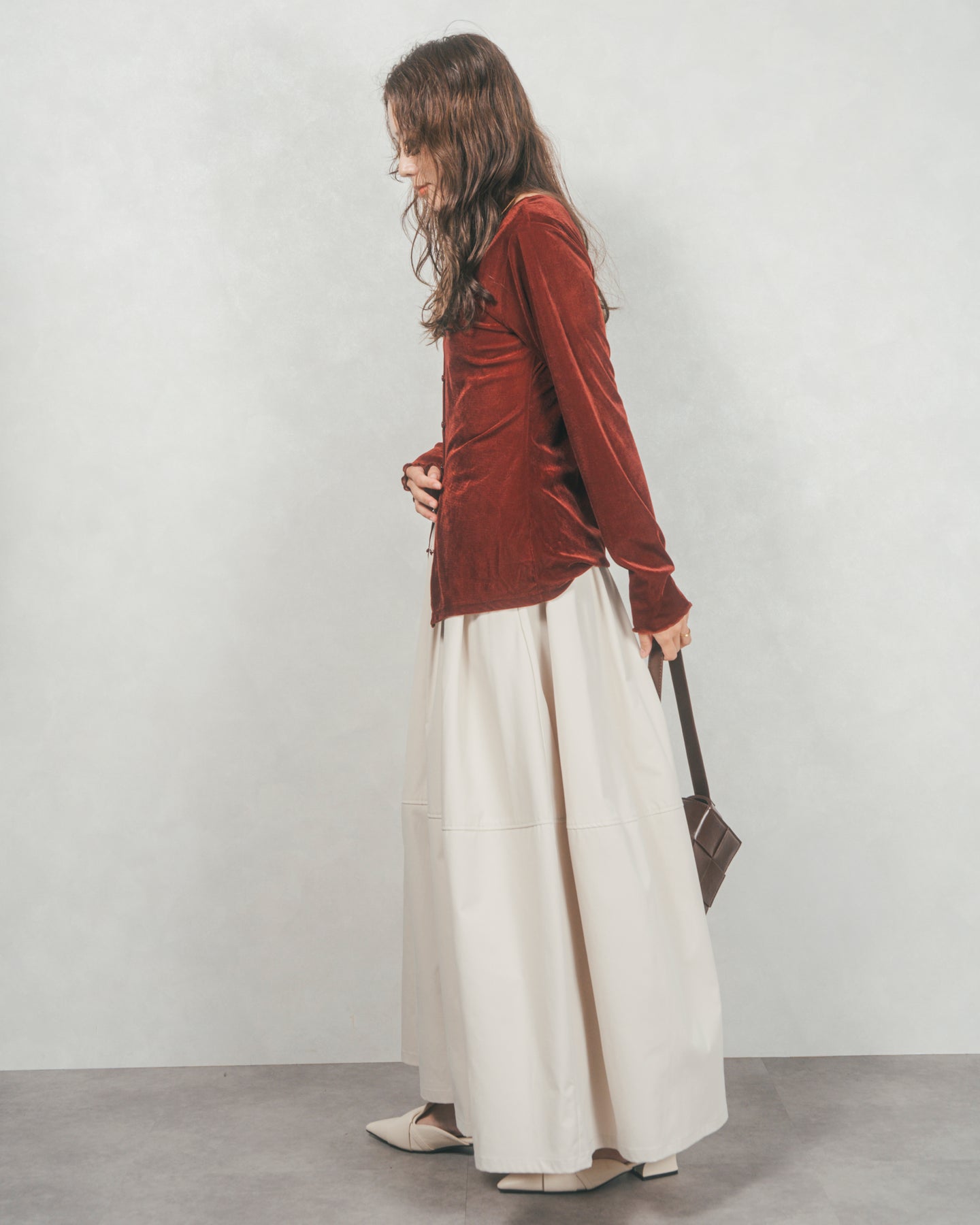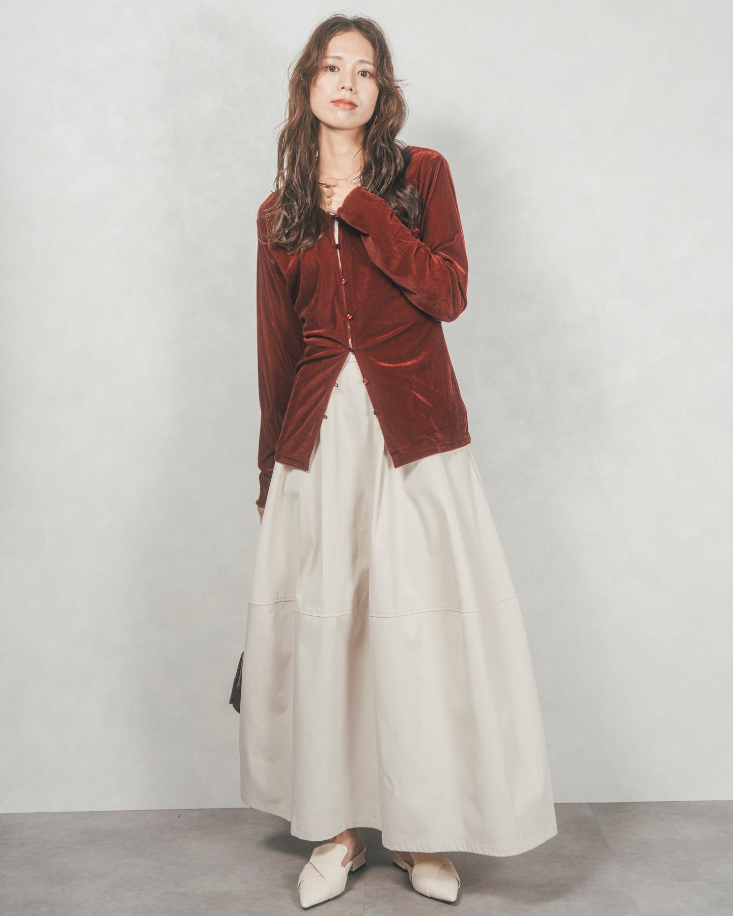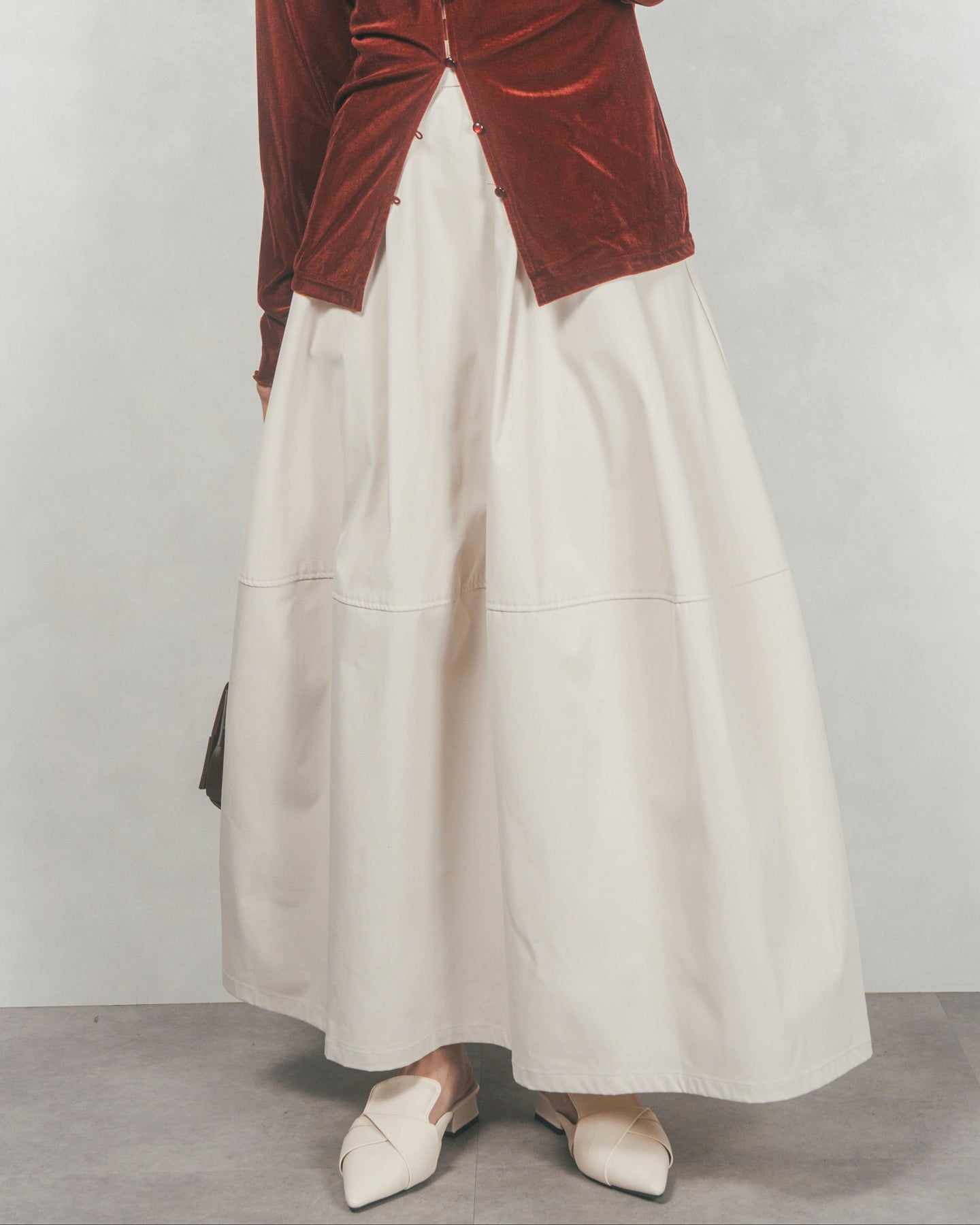 すっきりとしたウエストまわりとのコントラストで、ボリュームがありつつもバランスよく着られるのが魅力。合わせるだけでこなれ感が生まれる、絶妙なニュアンスカラー展開もポイントです。