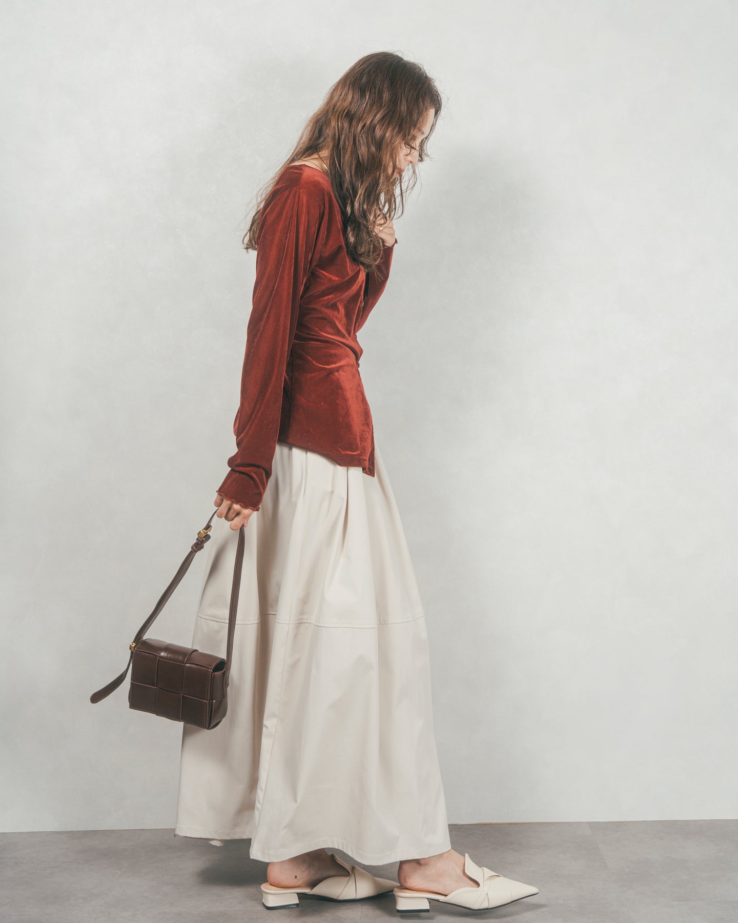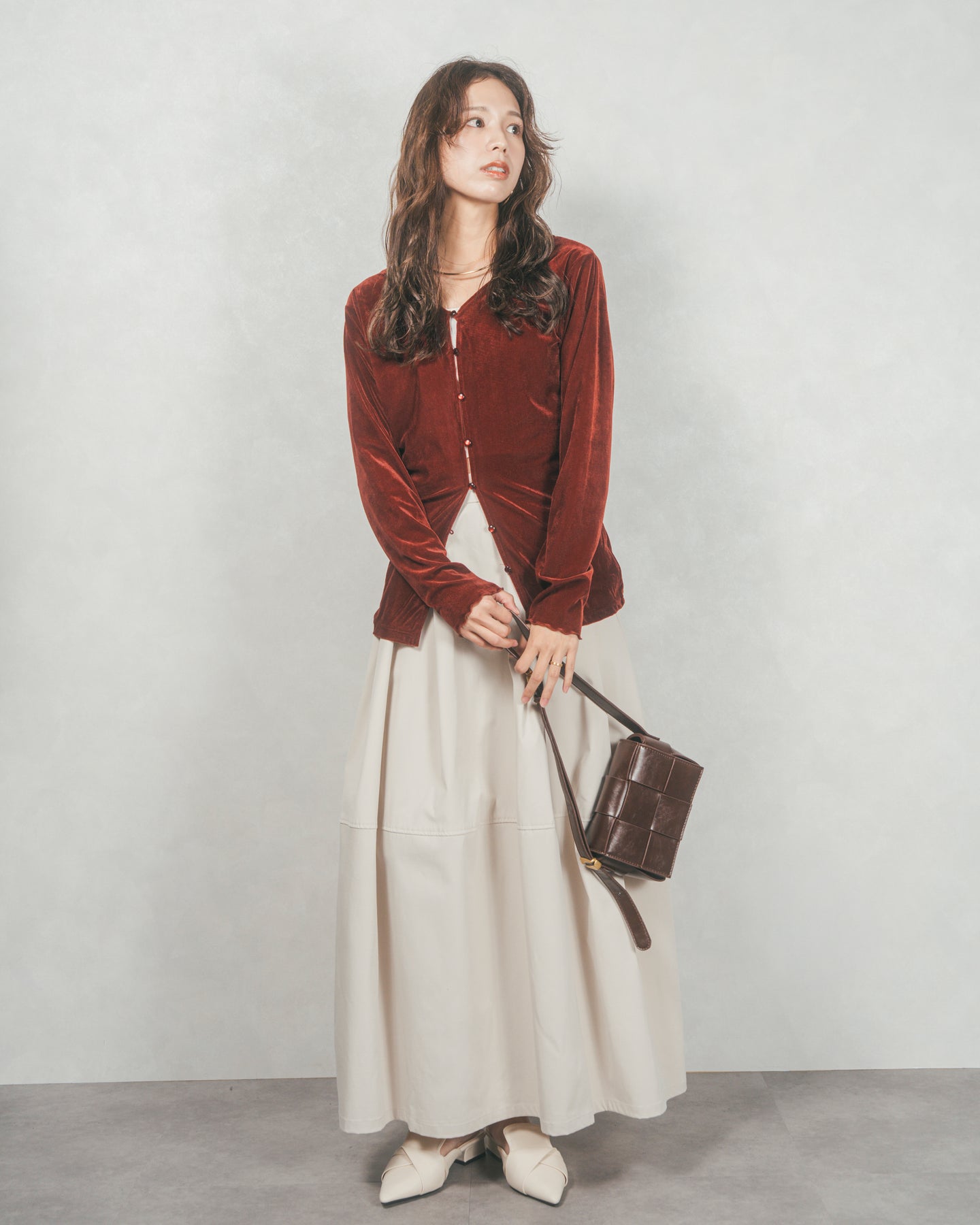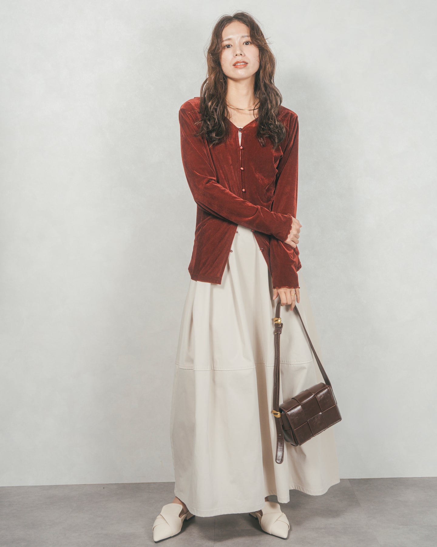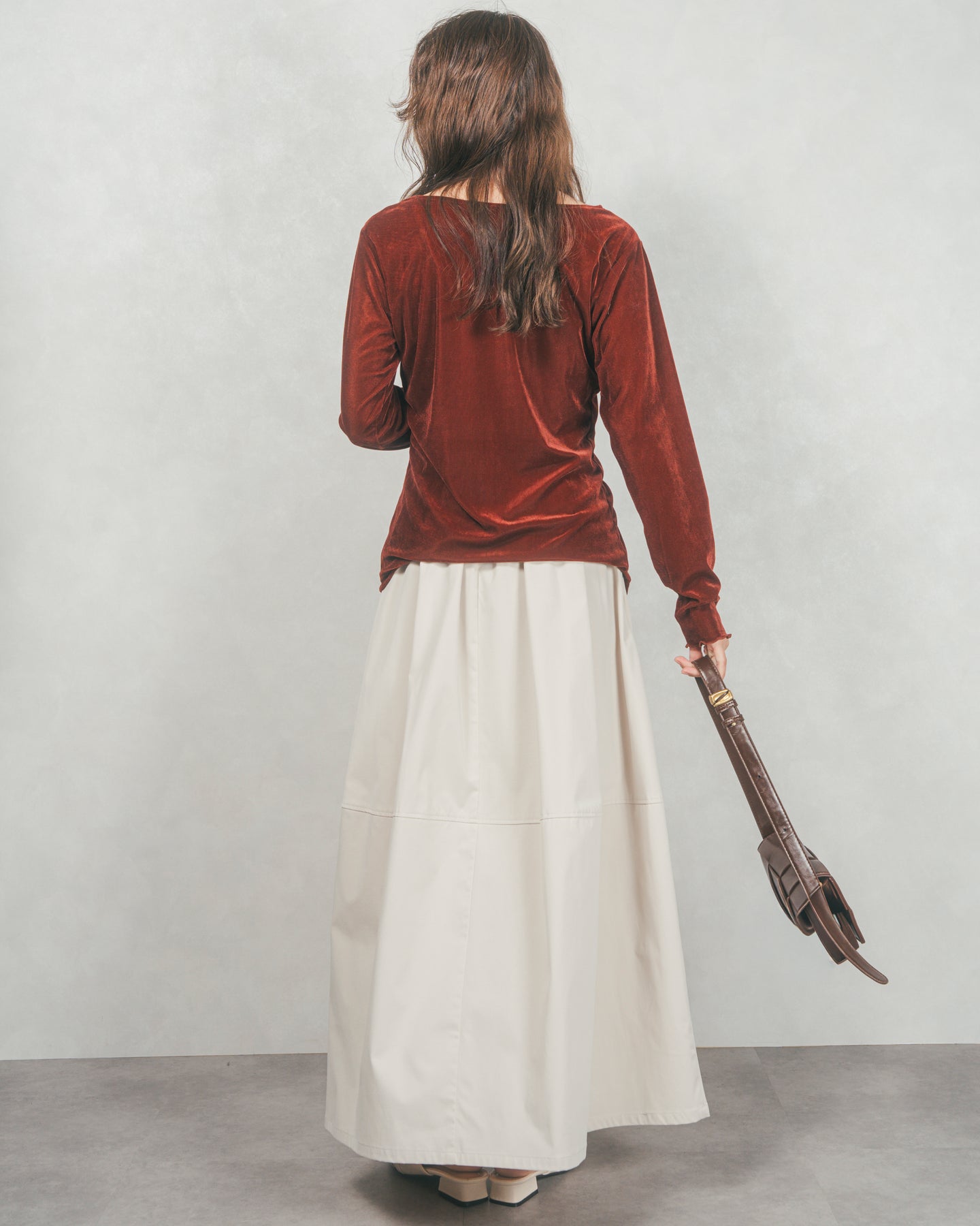 すっきりとしたウエストまわりとのコントラストで、ボリュームがありつつもバランスよく着られるのが魅力。合わせるだけでこなれ感が生まれる、絶妙なニュアンスカラー展開もポイントです。