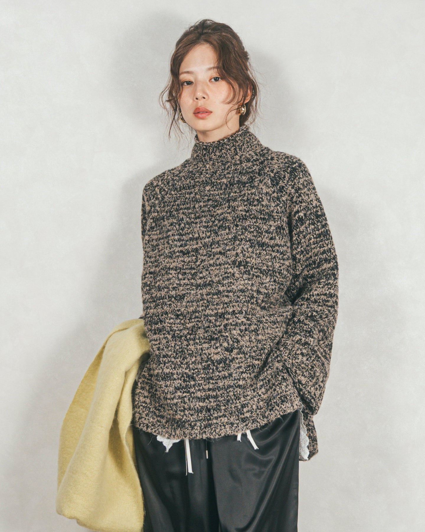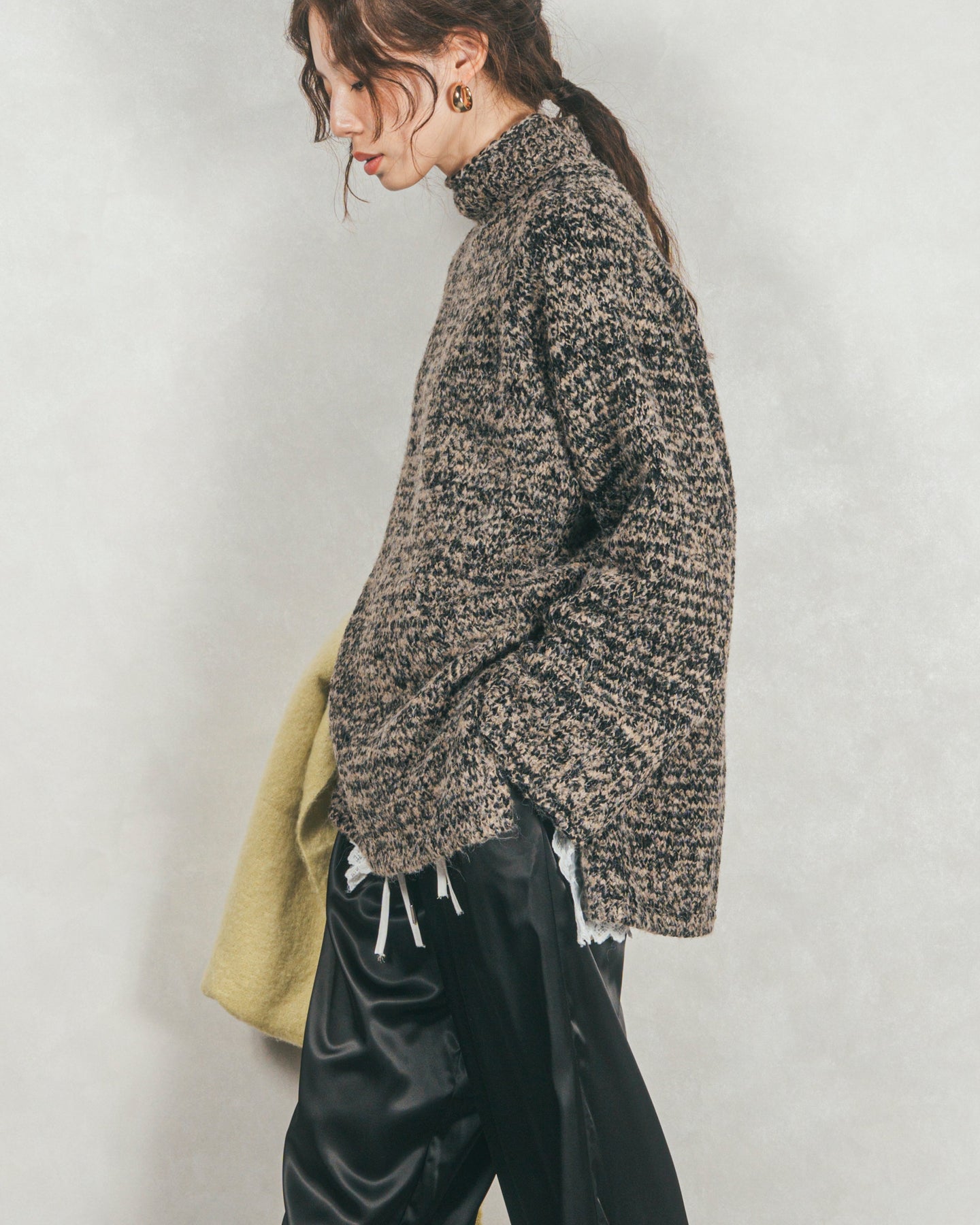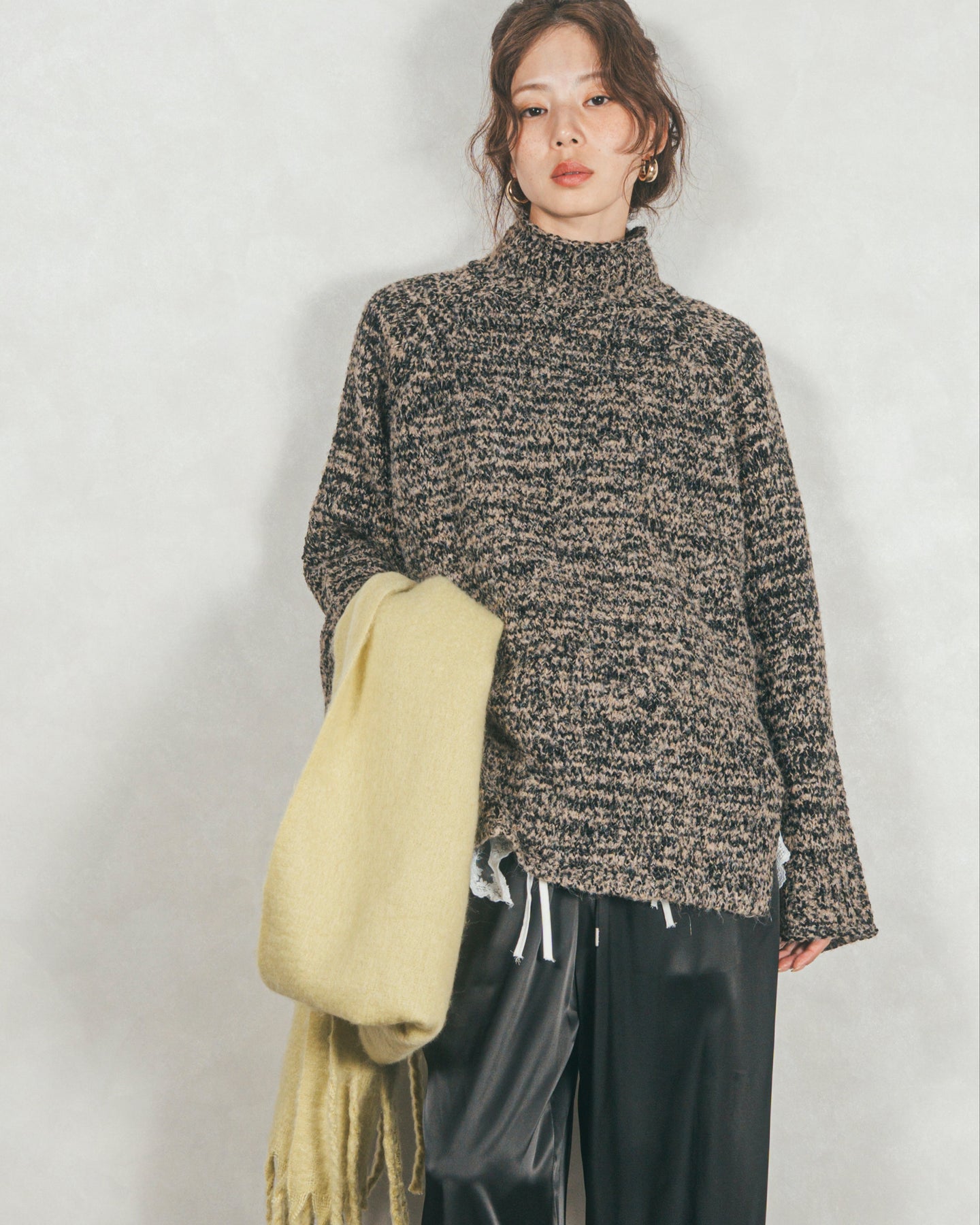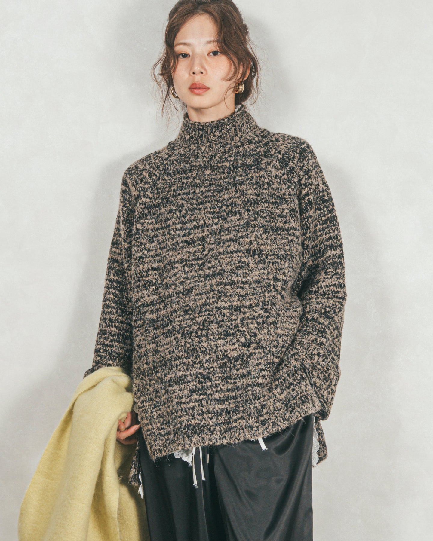 首元をあたたかく包み込むハイネックと、リラックス感のあるオーバーサイズシルエットがかわいいデザイン。特殊な糸をMIXした表情のあるニットで、サイドのスリットが抜け感を演出。