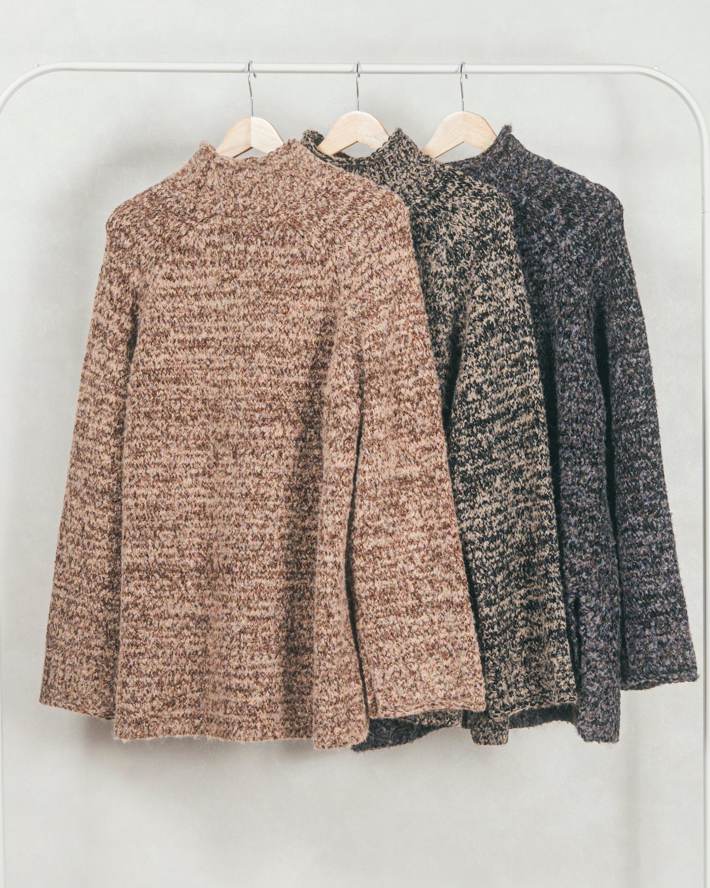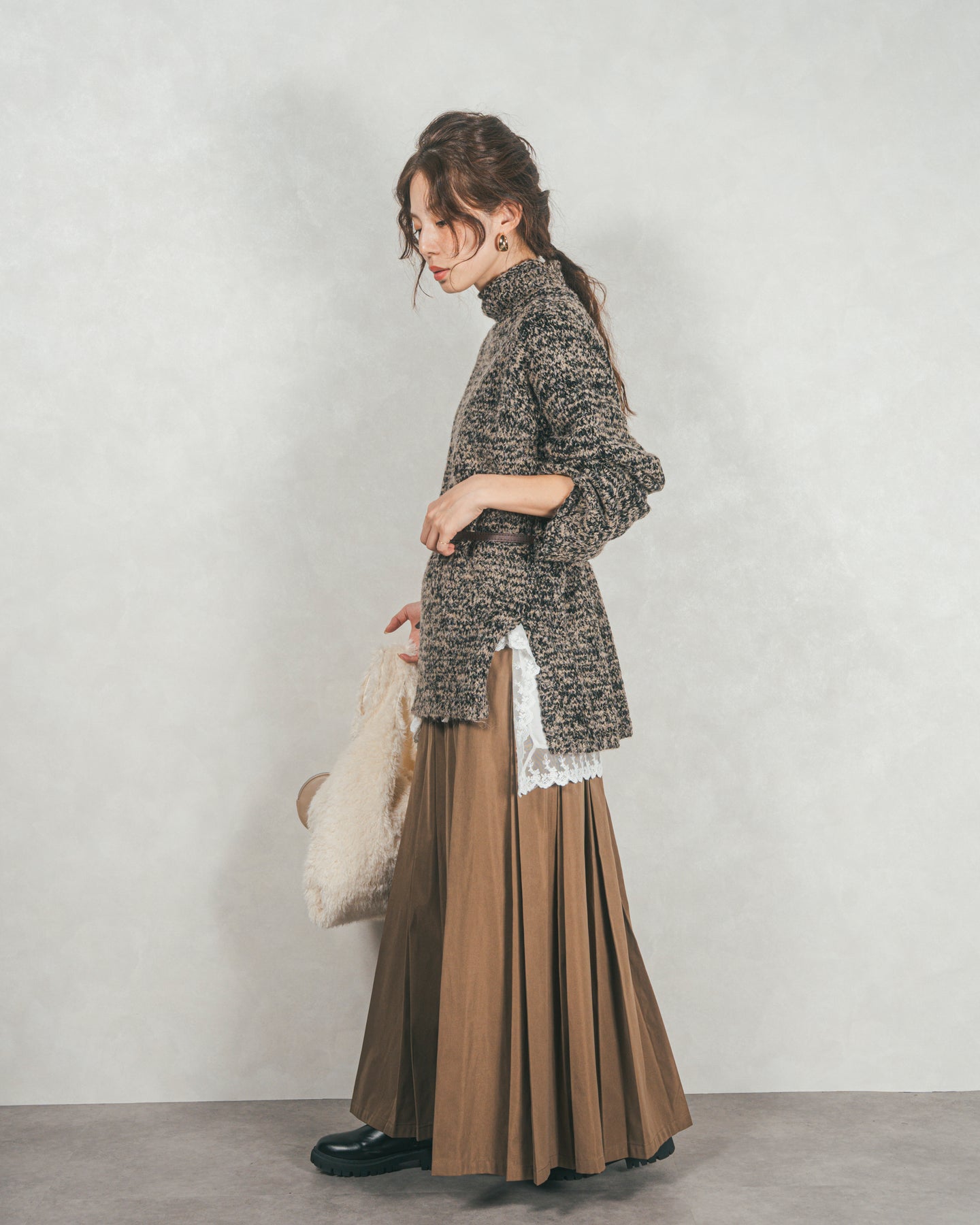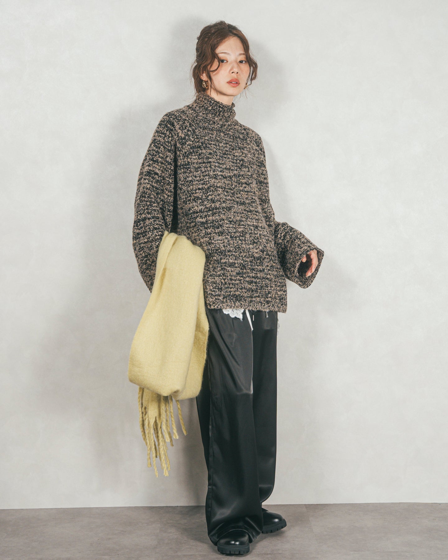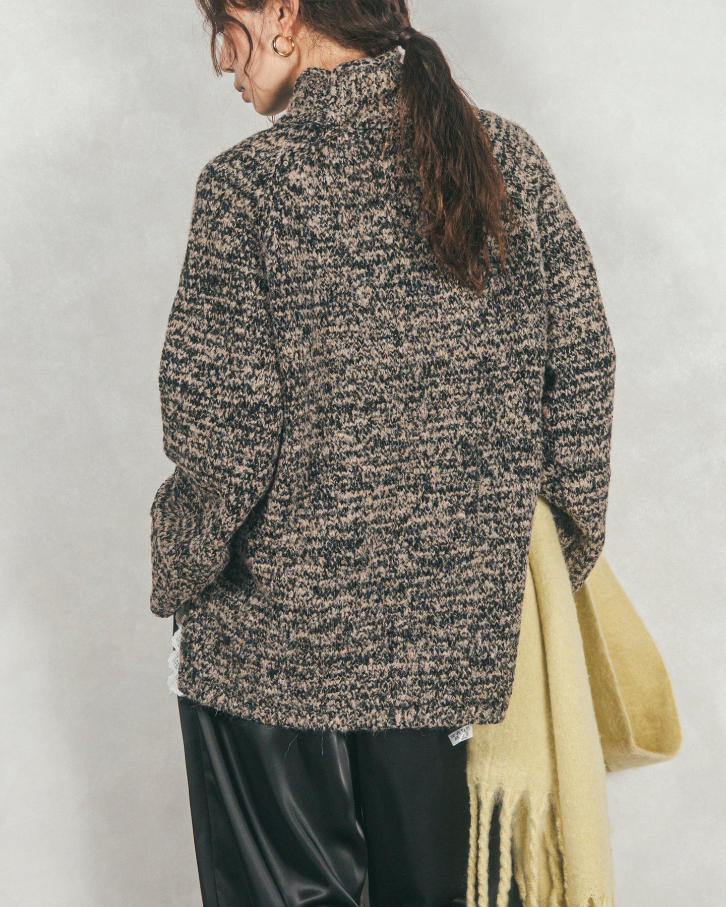 首元をあたたかく包み込むハイネックと、リラックス感のあるオーバーサイズシルエットがかわいいデザイン。特殊な糸をMIXした表情のあるニットで、サイドのスリットが抜け感を演出。