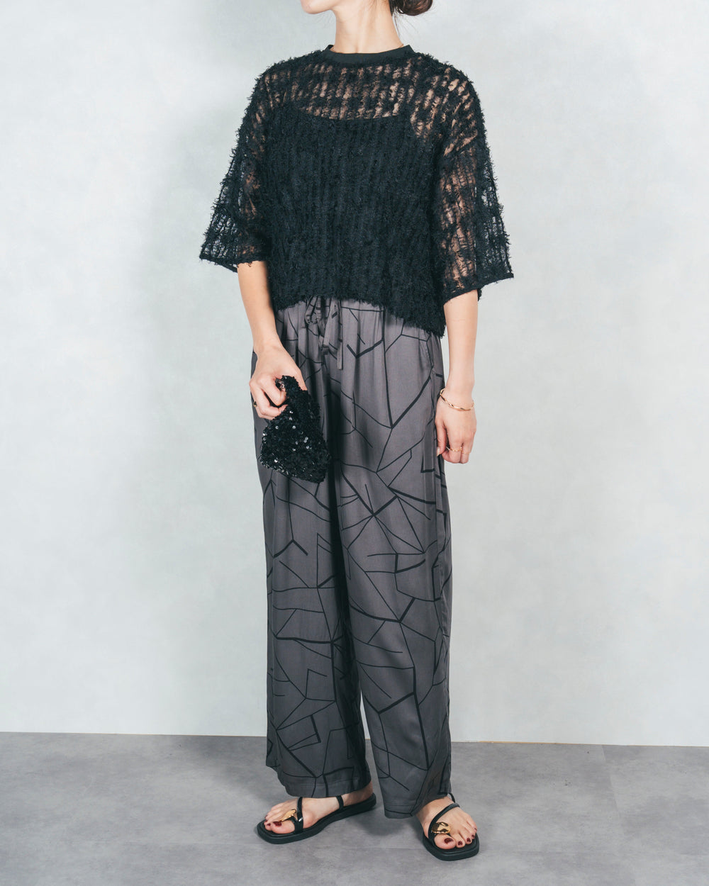 [SET]シアーフリンジトップス+シルキーリラックスプリントパンツ+すっきり見えカップ付きキャミ(3SET)