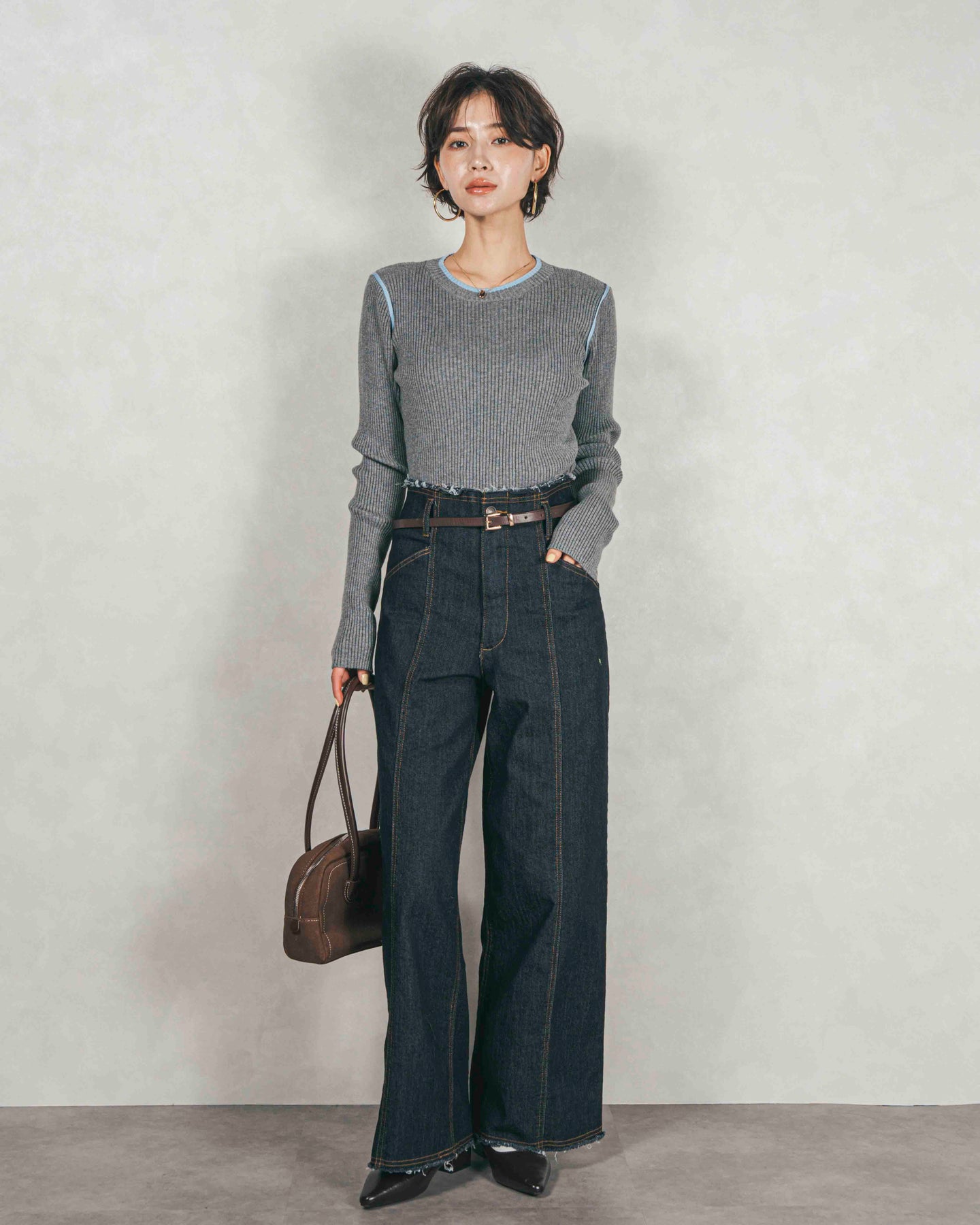 [SET]バイカラークルーネックニットトップス+センターシーム リラックスワイドデニム(2SET)