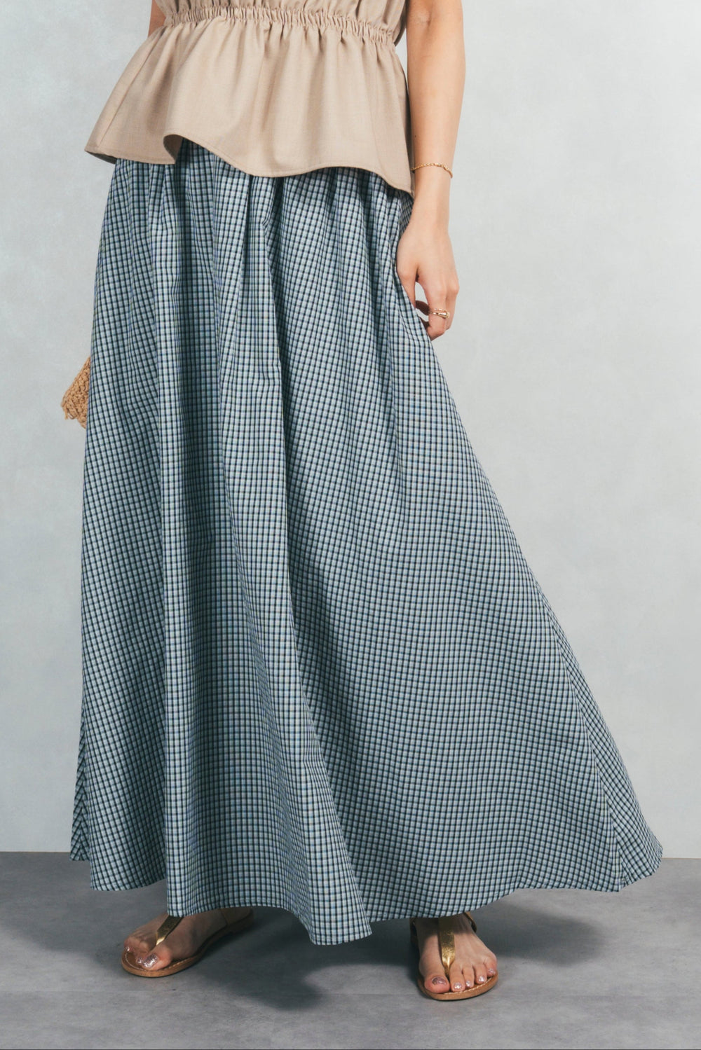 上品なチェックの色味が、大人のカジュアルスタイルにぴったりのマキシスカート。たっぷり布地を使ったフレアシルエットなので、歩くたびに揺れて存在感あるコーデに仕上がります。どんなトップスとも相性が良く、日常からお出かけシーンまで幅広く活躍◎