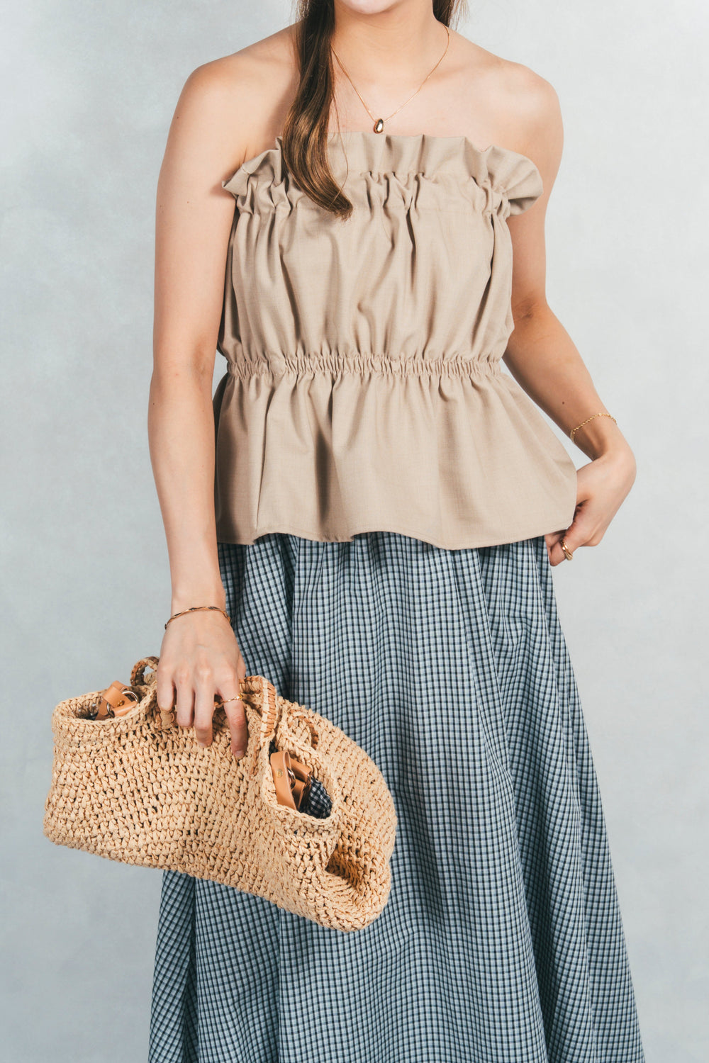 [SET]リネンタッチギャザーベアトップス+チェックギャザーマキシスカート(2SET)