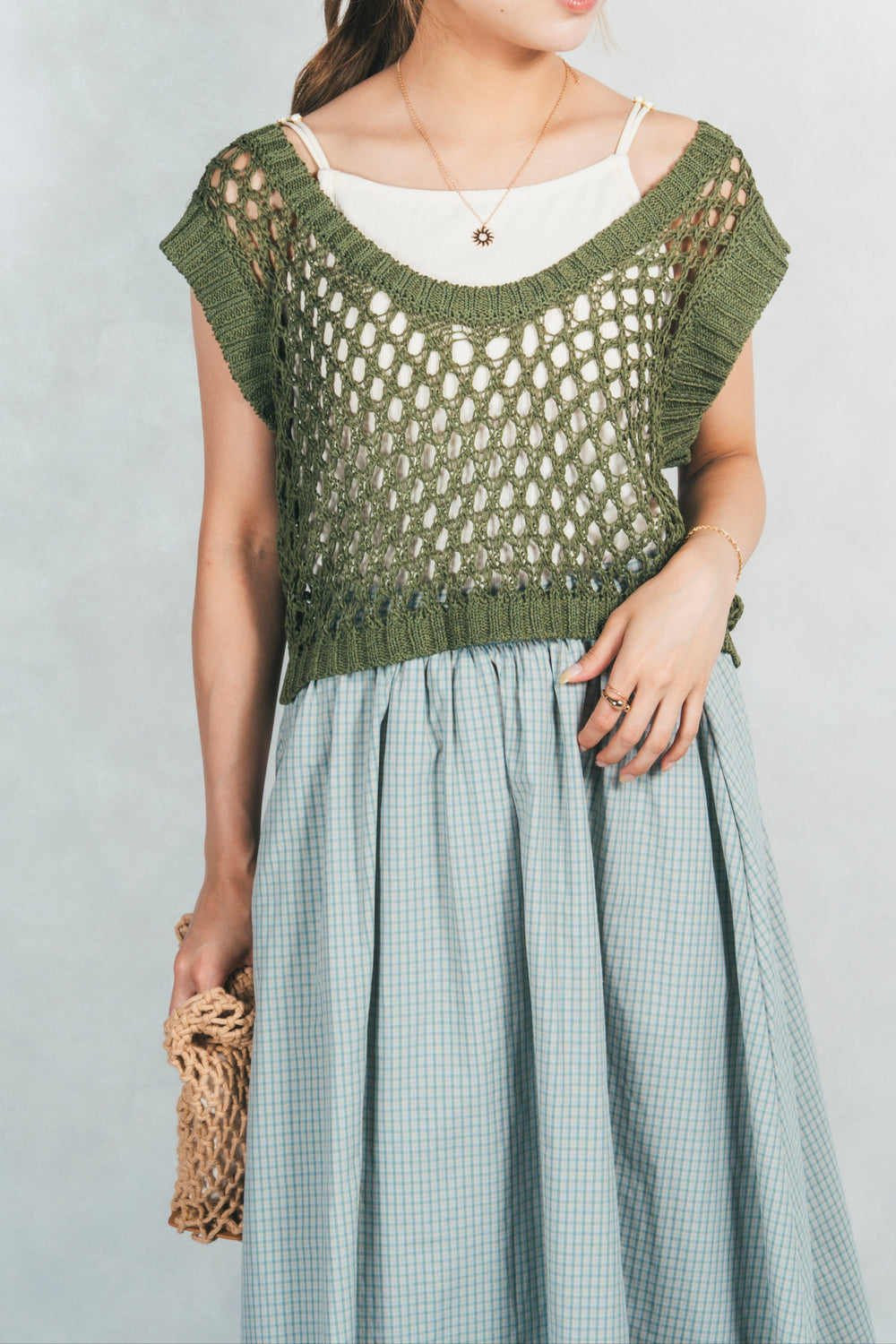[SET]2-Way Uネックメッシュニットベスト+チェックギャザーマキシスカート(2SET)