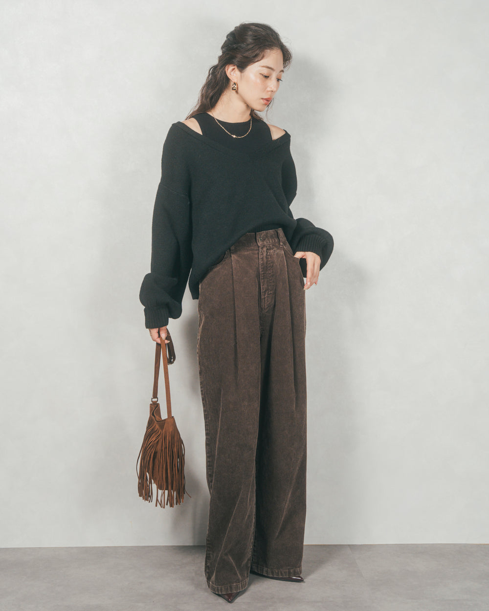 [SET]メランジVネックニットレイヤードセット+コーデュロイWideストレートパンツ(2SET)