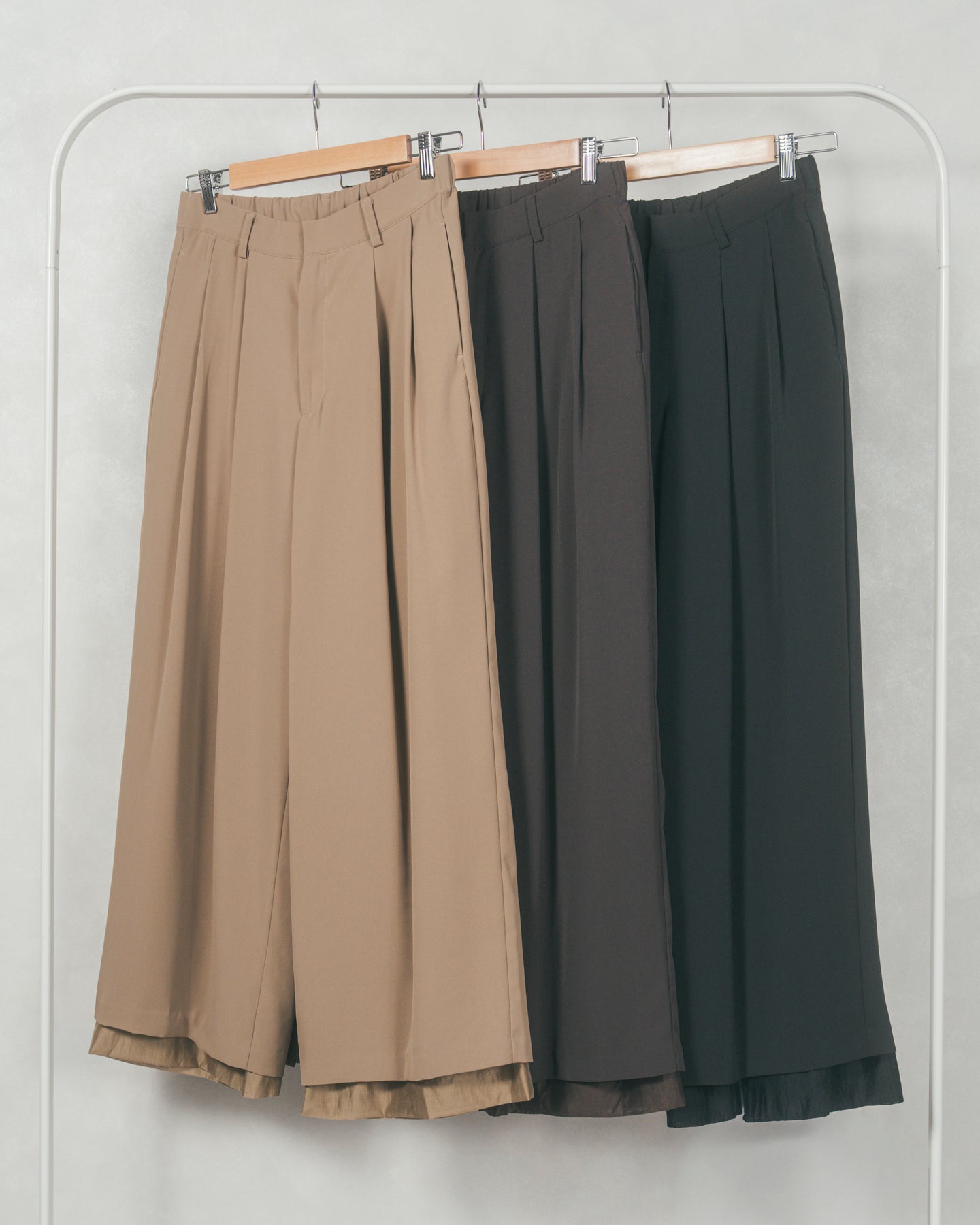 裾にさりげなくシアー素材をあしらい抜け感をプラスしたヘムシアーパンツ。ストンと落ちるワイドストレートシルエットにセンタープレスが施され、すっきりとした印象に。タック入りで程よいボリューム感があり、オケージョンシーンはもちろん、トップス次第でカジュアルにも対応可能な万能アイテムです。バックウエストは平ゴム仕様でストレスなく着用でき、ポケット付きで機能性も◎