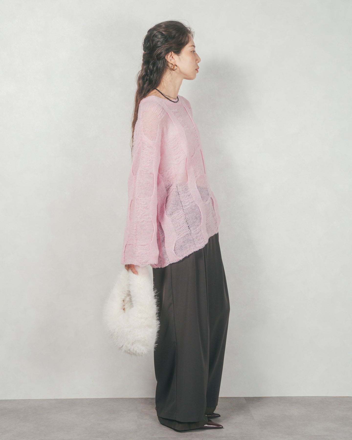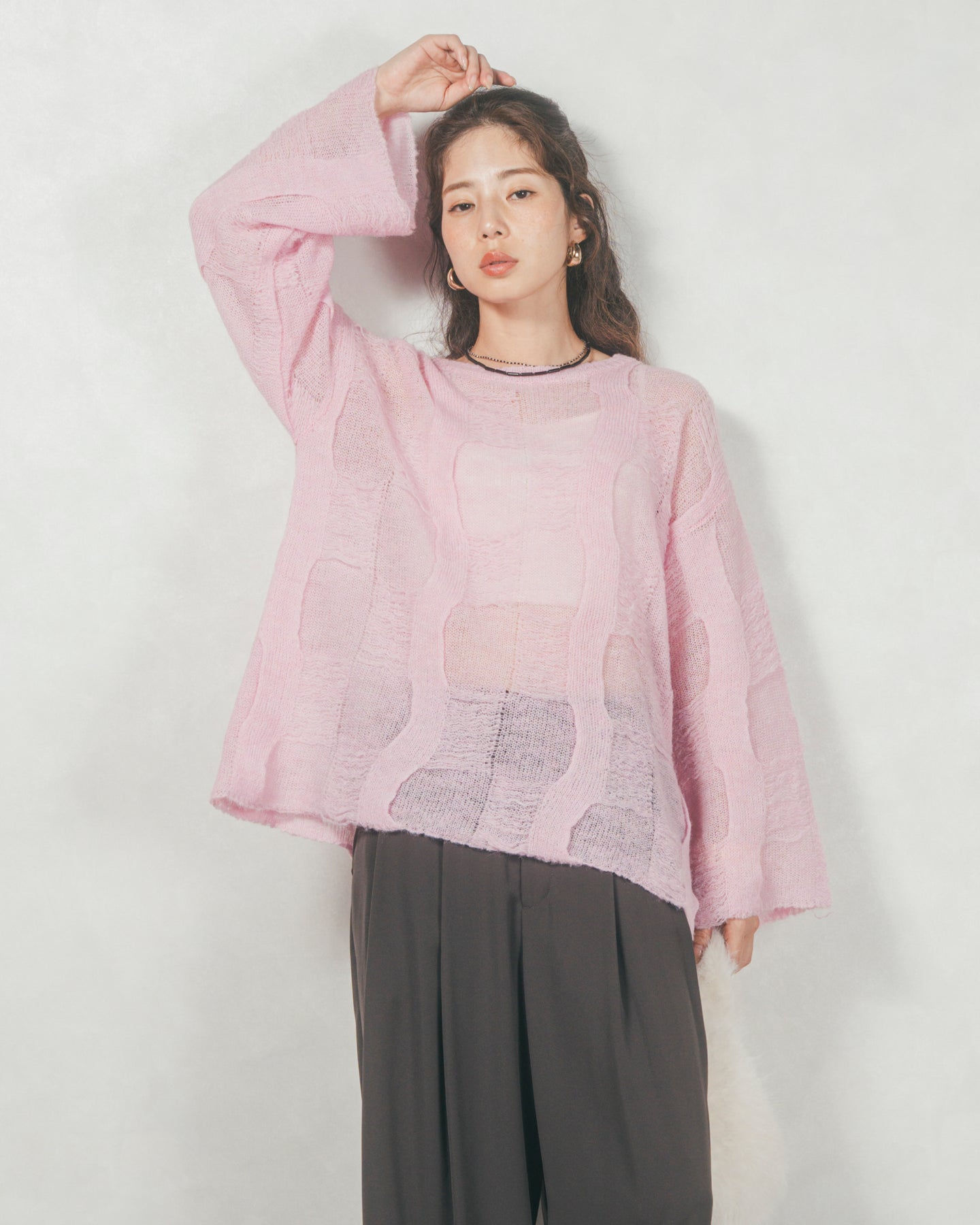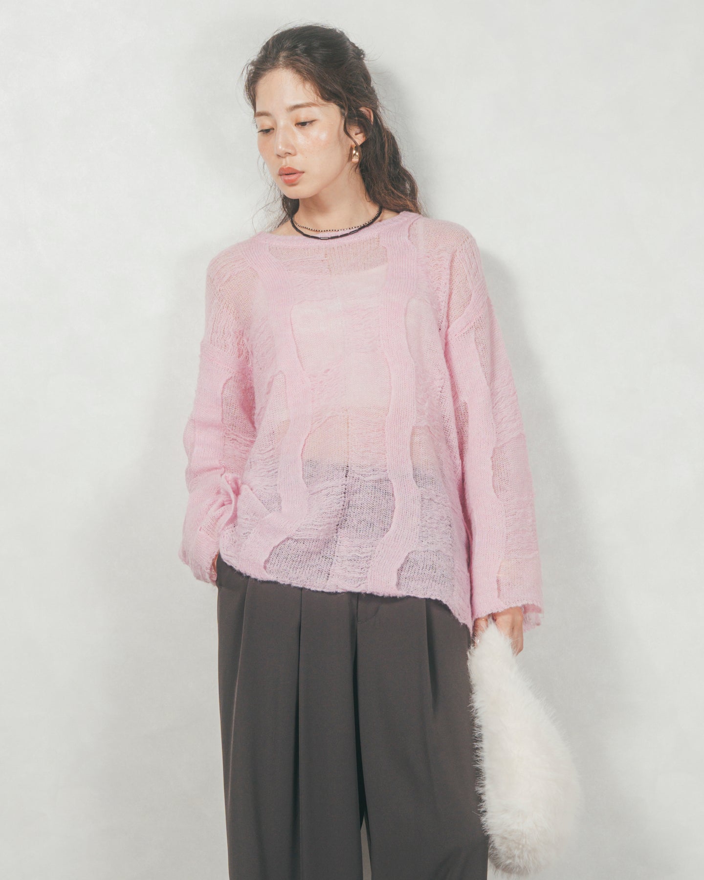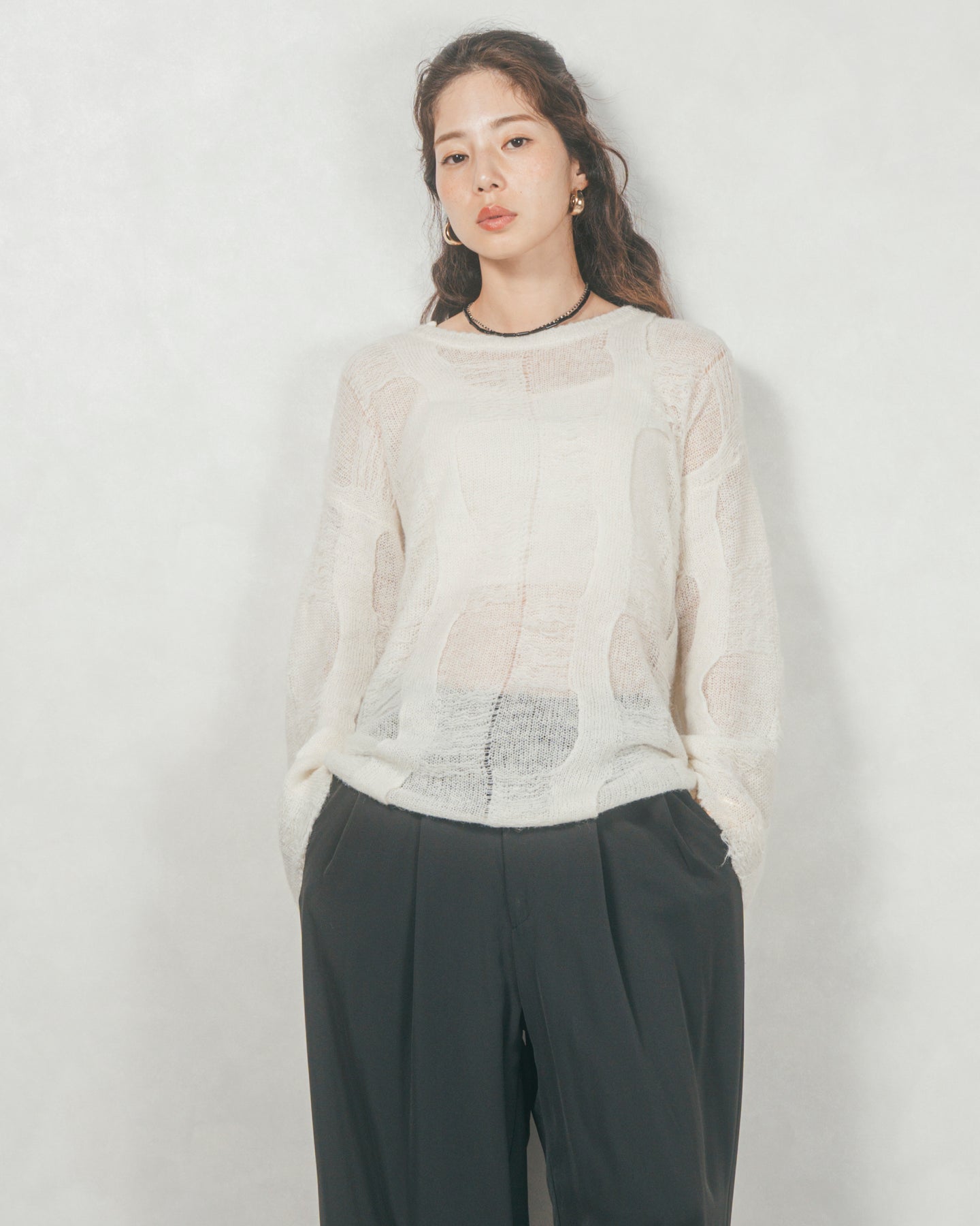 柔らかなモヘア混素材を贅沢に使用したローゲージニットプルオーバーが登場。存在感のあるパターン編みが温かみを感じさせ、秋冬のスタイリングに自然なアクセントをプラスします。リラックス感のあるゆったりシルエットは、抜け感を演出しつつも女性らしい柔らかなラインをキープ。デイリーユースにぴったりで、休日のリラックスタイムはデニムやワイドパンツと合わせてラフに、またちょっとしたお出かけにはスカートやレザーアイテムとコーディネートしても◎秋冬のワードローブに欠かせない一着です。