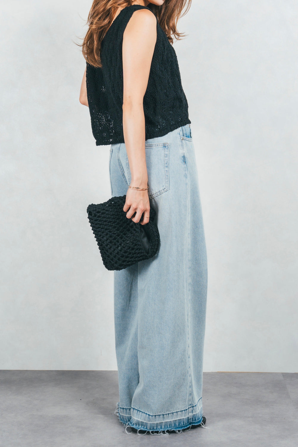 [SET]透かし編みクロップドニットベスト+[SIDE ウエストゴム入り]ワイドバギーデニム+すっきり見えカップ付きキャミ(3SET)
