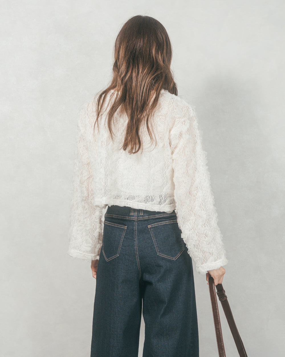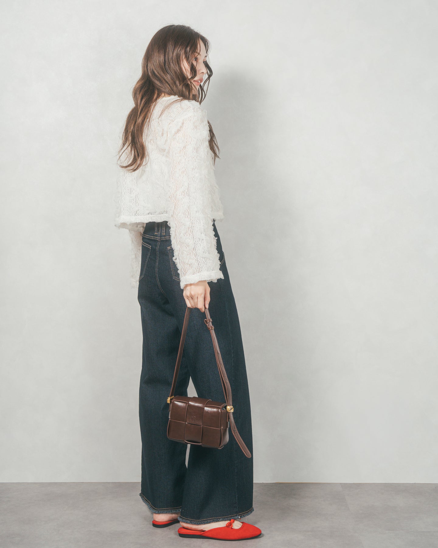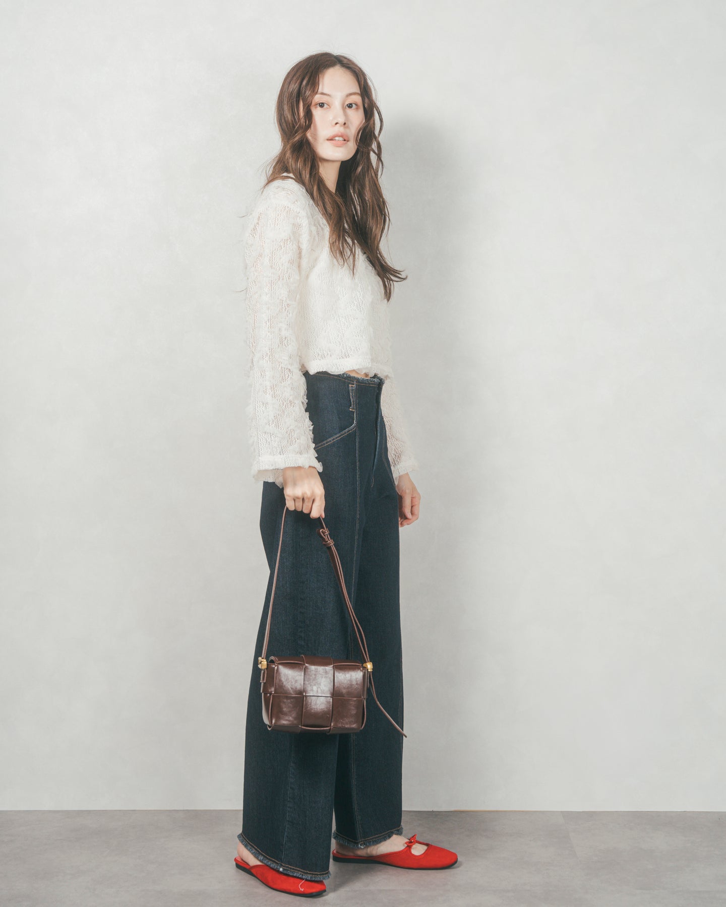 やや短めのクロップド丈は、ハイウエストボトムとの相性も抜群で、スタイルアップ効果も◎。片方を肩落ちさせてワンショル風に着れば、一気にこなれたムードに。