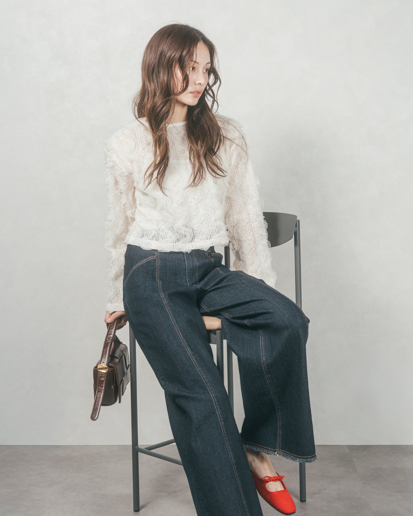 軽やかなチュール×メッシュの異素材ミックスに、さりげないフリルディテールをプラスした、トレンド感たっぷりの一枚です。程よい肌見せと抜け感が、大人の可愛さを引き立てつつ、カジュアルすぎないバランスに仕上げました。