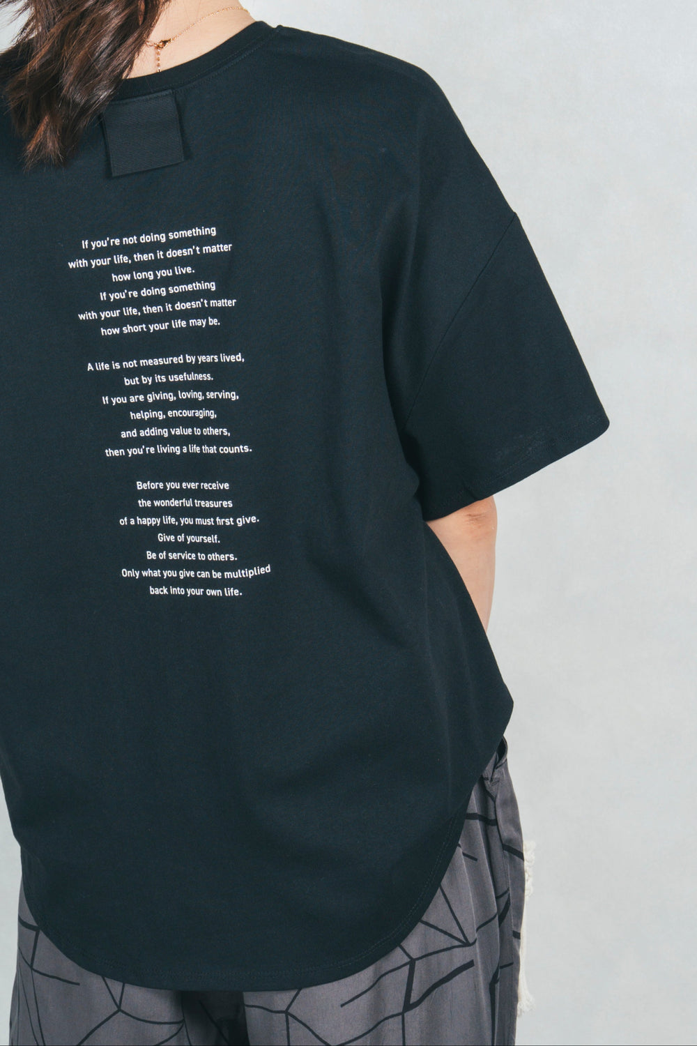 ゆったりとしたサイズ感で、着るだけでこなれ感のでるシルエットのTシャツです。バックデザインは小さいロゴが大人っぽく、ネックについたテープがポイントに。