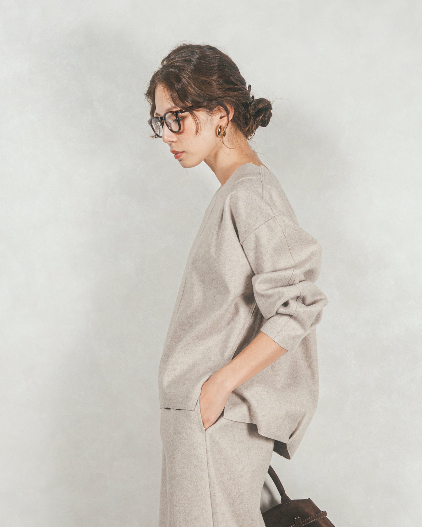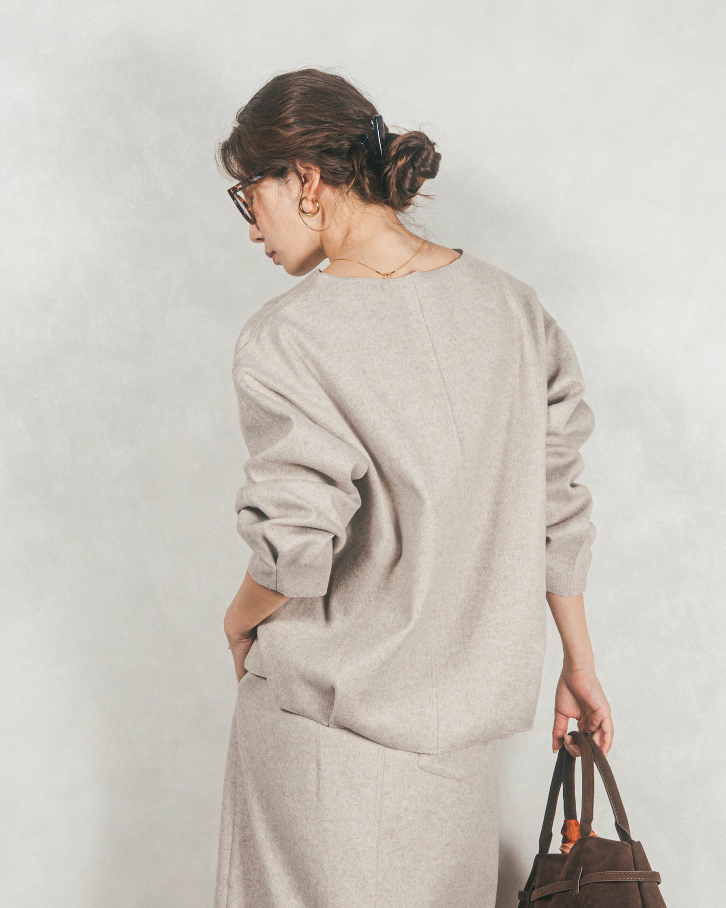 やわらかなコクーンシルエットに仕立てた、オーバーサイズのデザイン。浅めのVネックラインが顔周りをすっきりと見せ、後ろの裾にはタックを入れることで、気になる部分を自然とカバーし、華奢見えさせるこだわりのデザインです。
