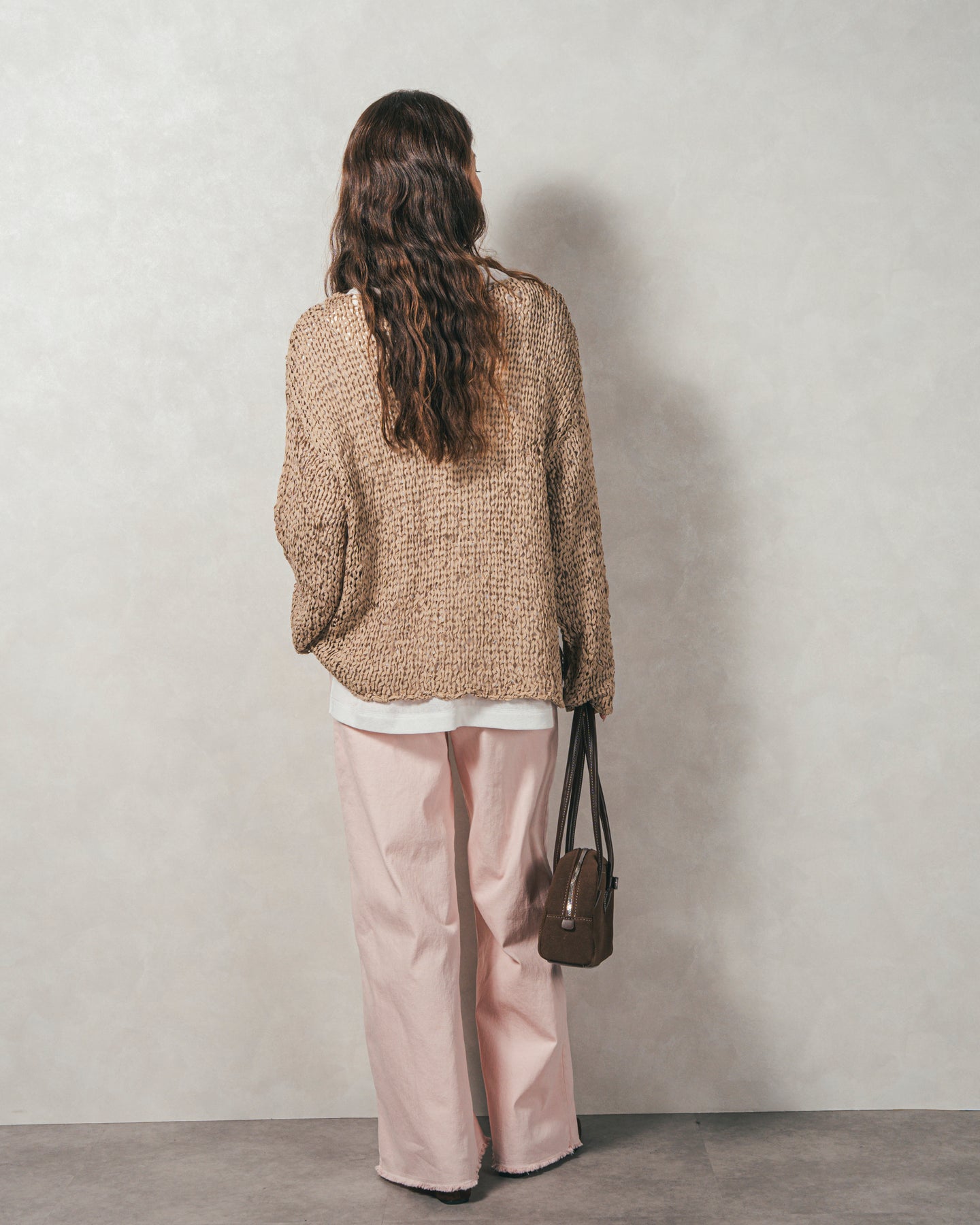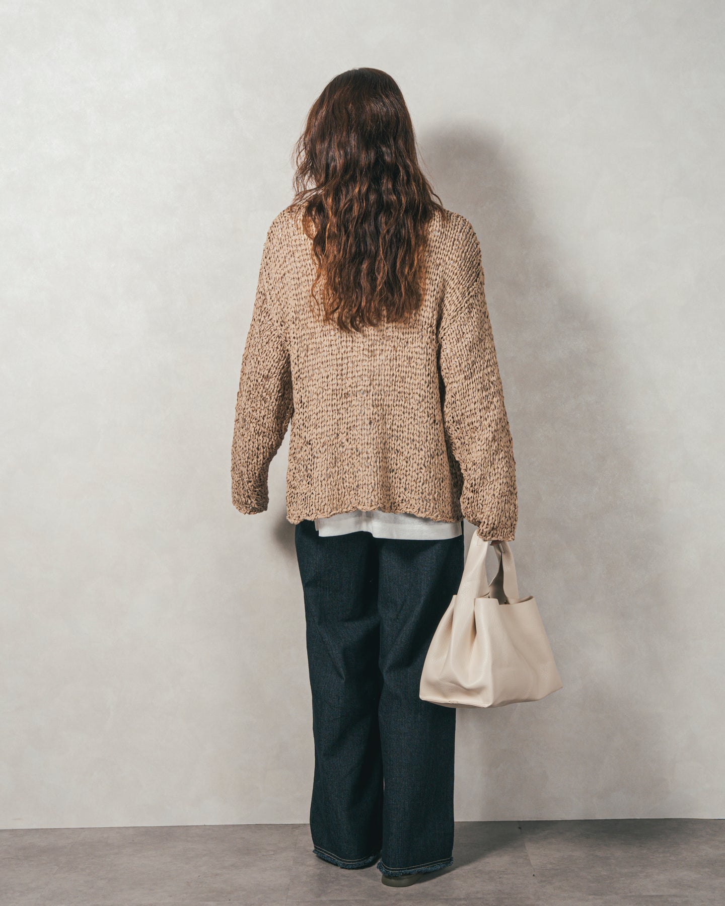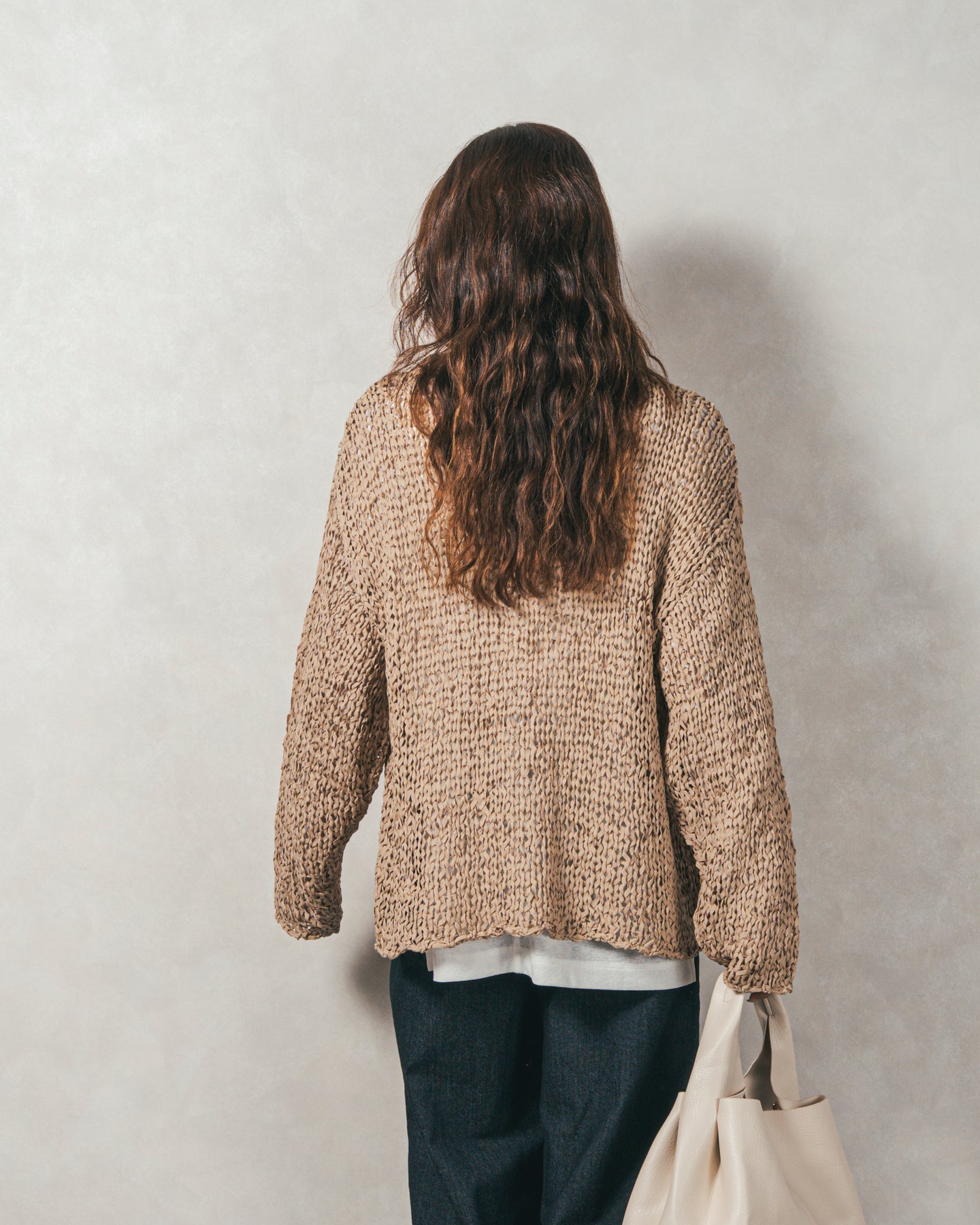 【Fabric】 平たいテープのような糸でざっくりと編まれたペーパーヤーン素材です。 暖房の効いた室内でも快適に過ごせる冬にも優秀な素材感です。通気性と吸湿性に優れているため、シーズン問わずに着られます。
