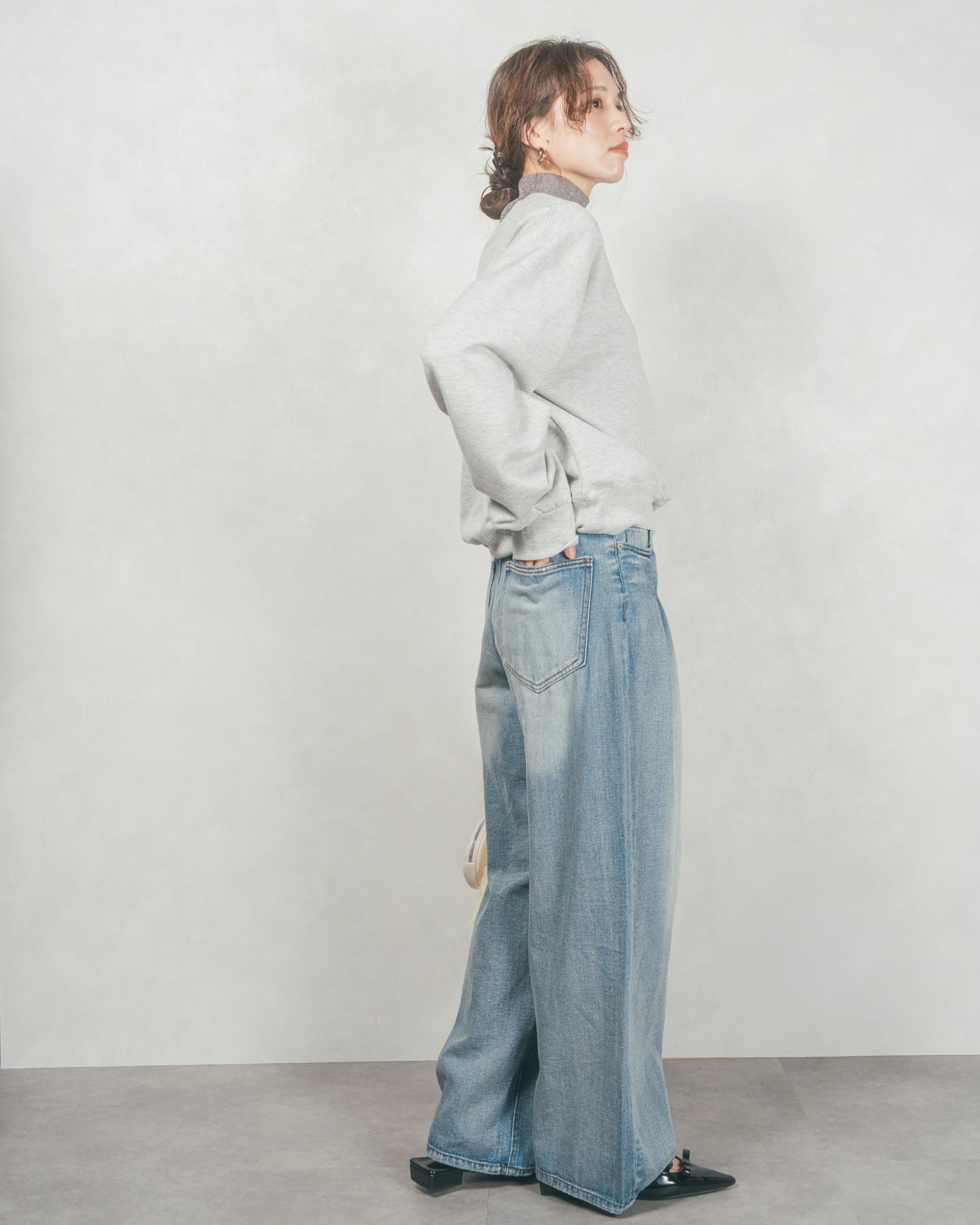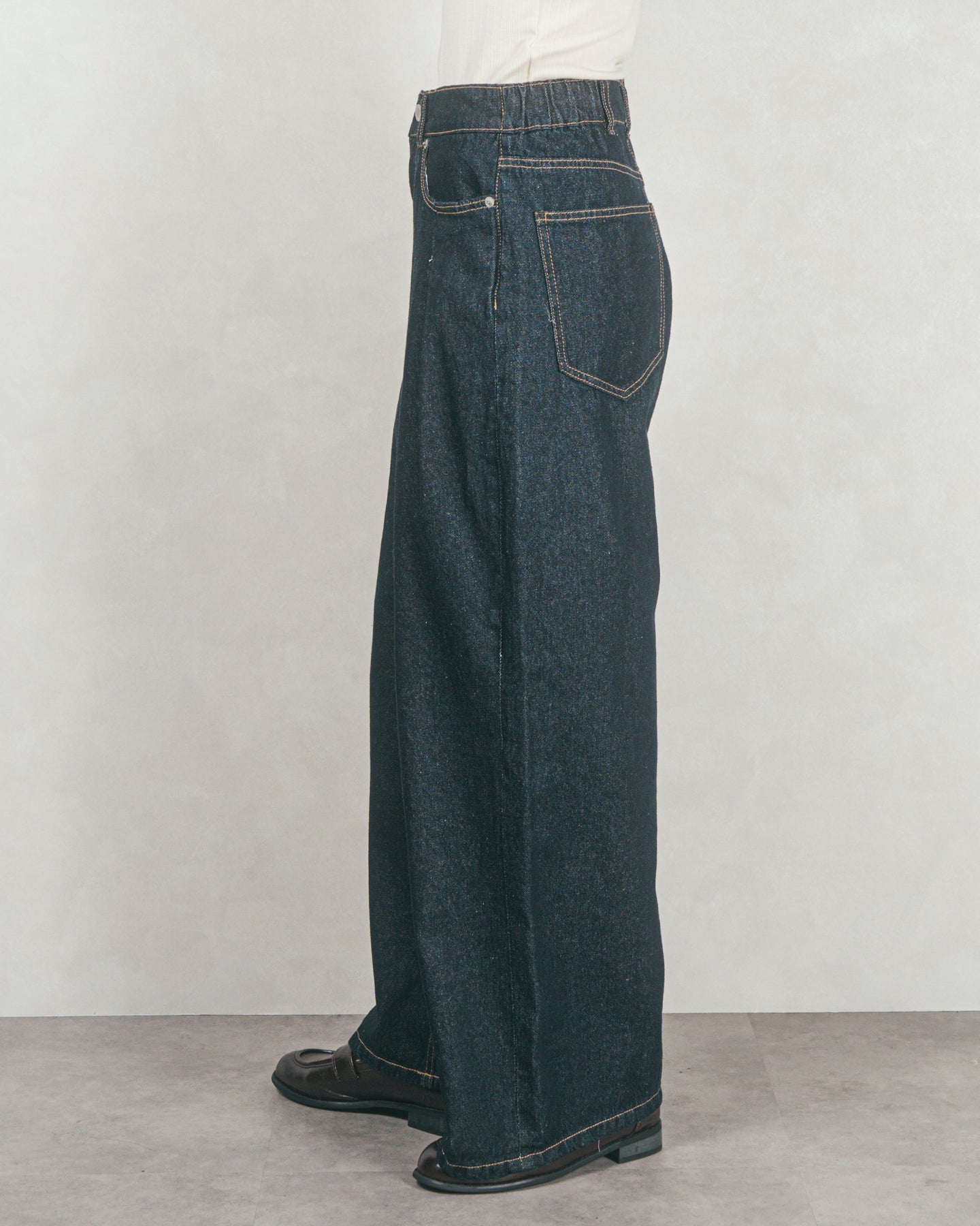 ほどよくワイドなストレートデニムパンツ。フロントポケットに入ったタックは腰回りにゆとりを持たせつつ、縦のラインをきれいに見せることで脚長効果も。裾はフロントを長く、バックを短くカットし、かかとで踏みづらいようにこだわっています。サイドウエストはゴム入りで、ストレスフリーなはき心地。
