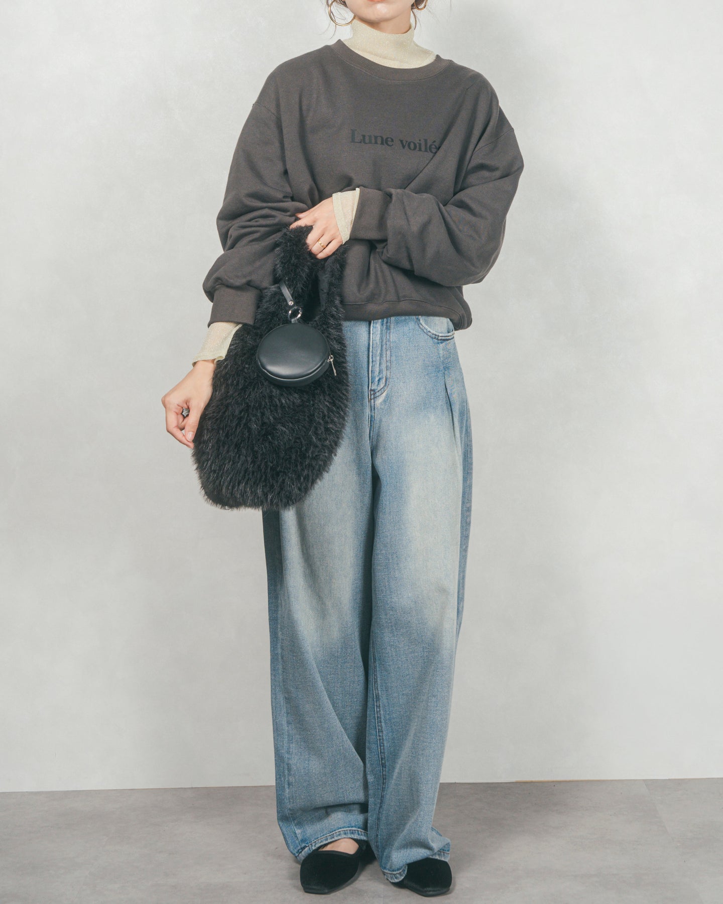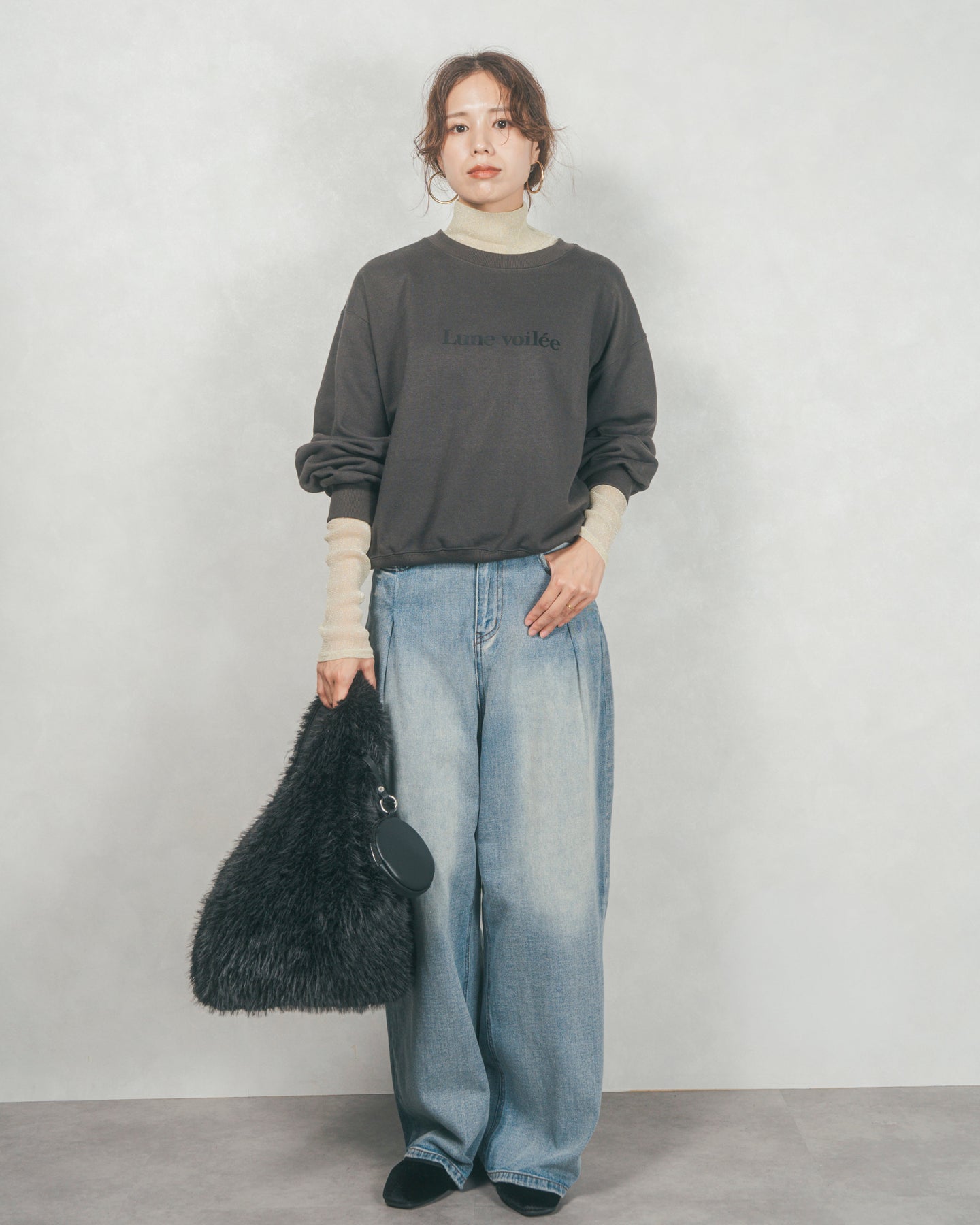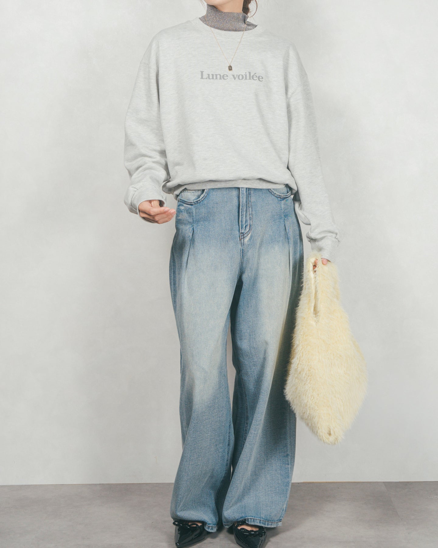 [SET]フロントシリコンLogoスウェット+ラメSheerハイネックトップス+ワイドTuckイージーデニム